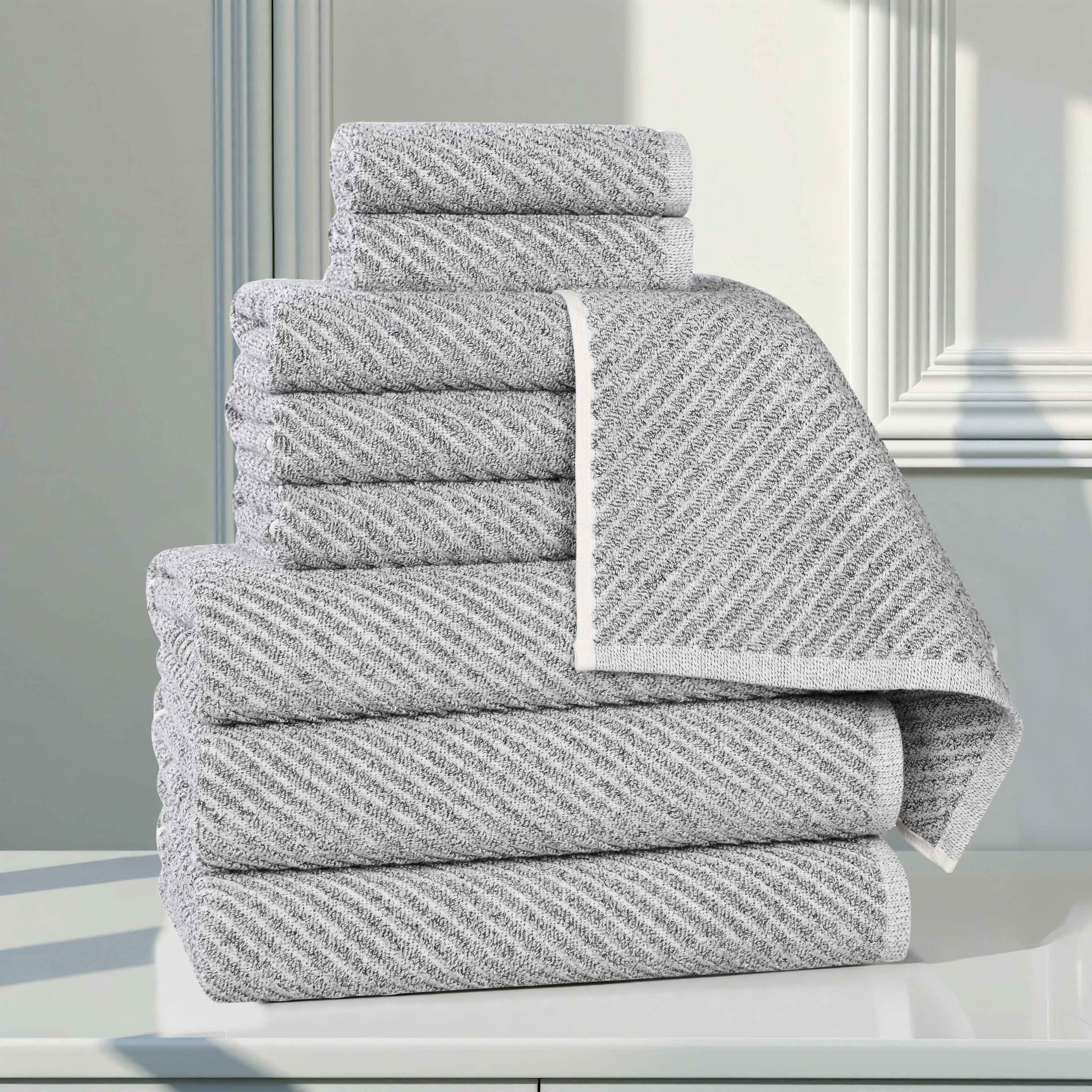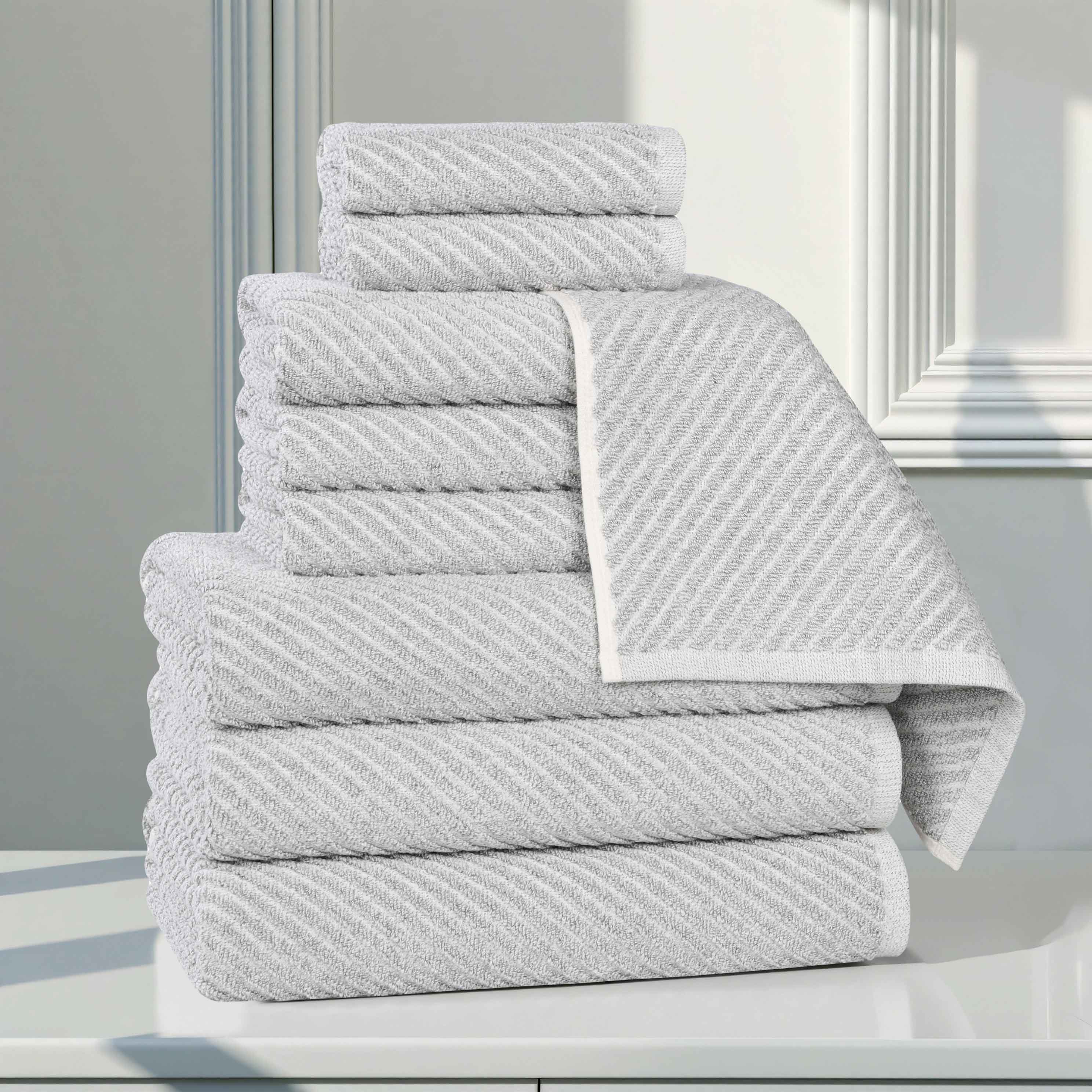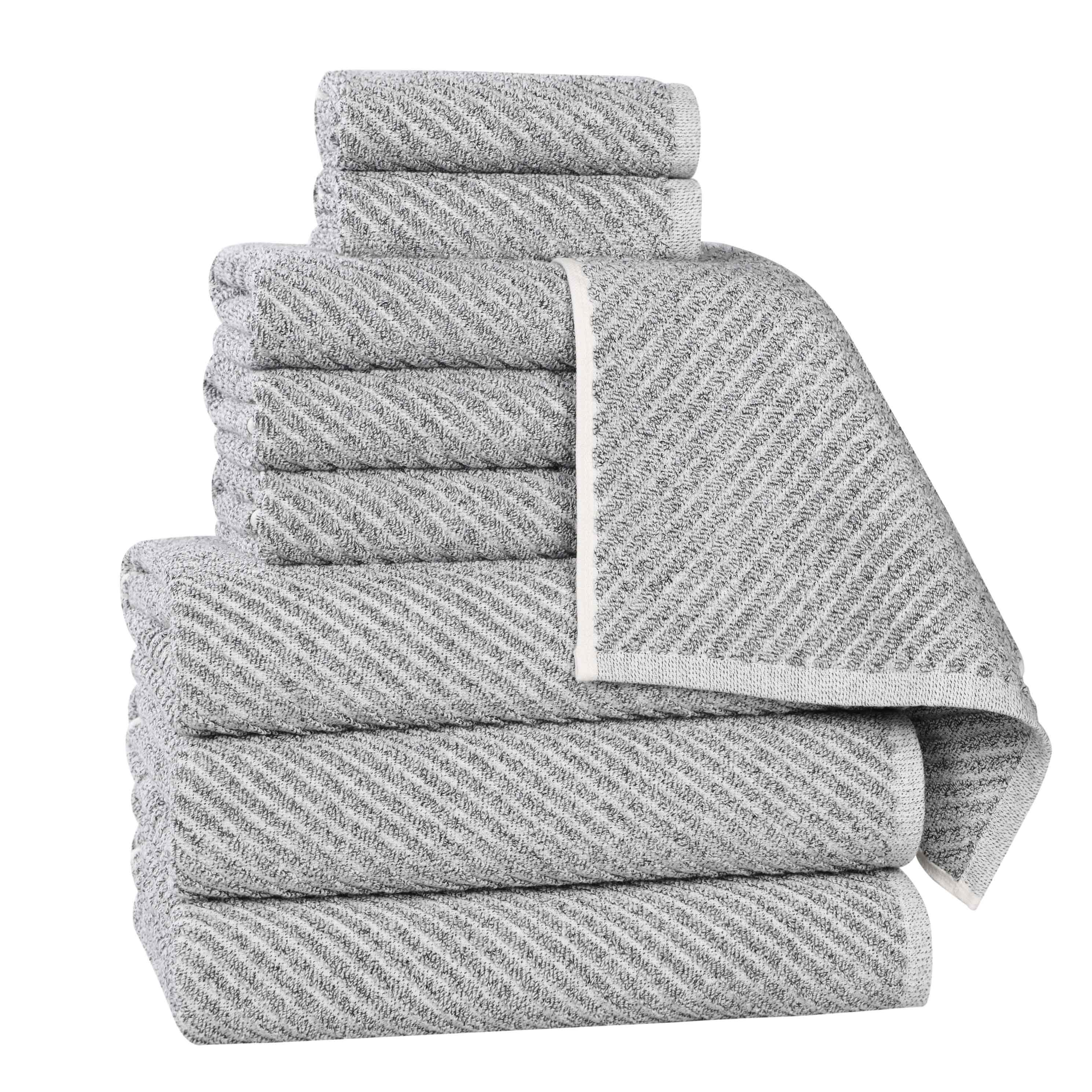 Embark on a journey of sensory delight with our Amelia Cotton Blend Textured Diagonal Ribbed 9 Piece Towel Set, meticulously crafted to transform your bathroom into a personal sanctuary. The distinctive textured, diagonal ribbed design lends an air of modern elegance to these exceptionally soft and absorbent towels. Crafted from a premium blend of 80% cotton and 20% viscose, they are meticulously woven to provide lasting comfort and exceptional durability. Experience the difference that superior craftsmanship and exquisite design can make in your everyday life.