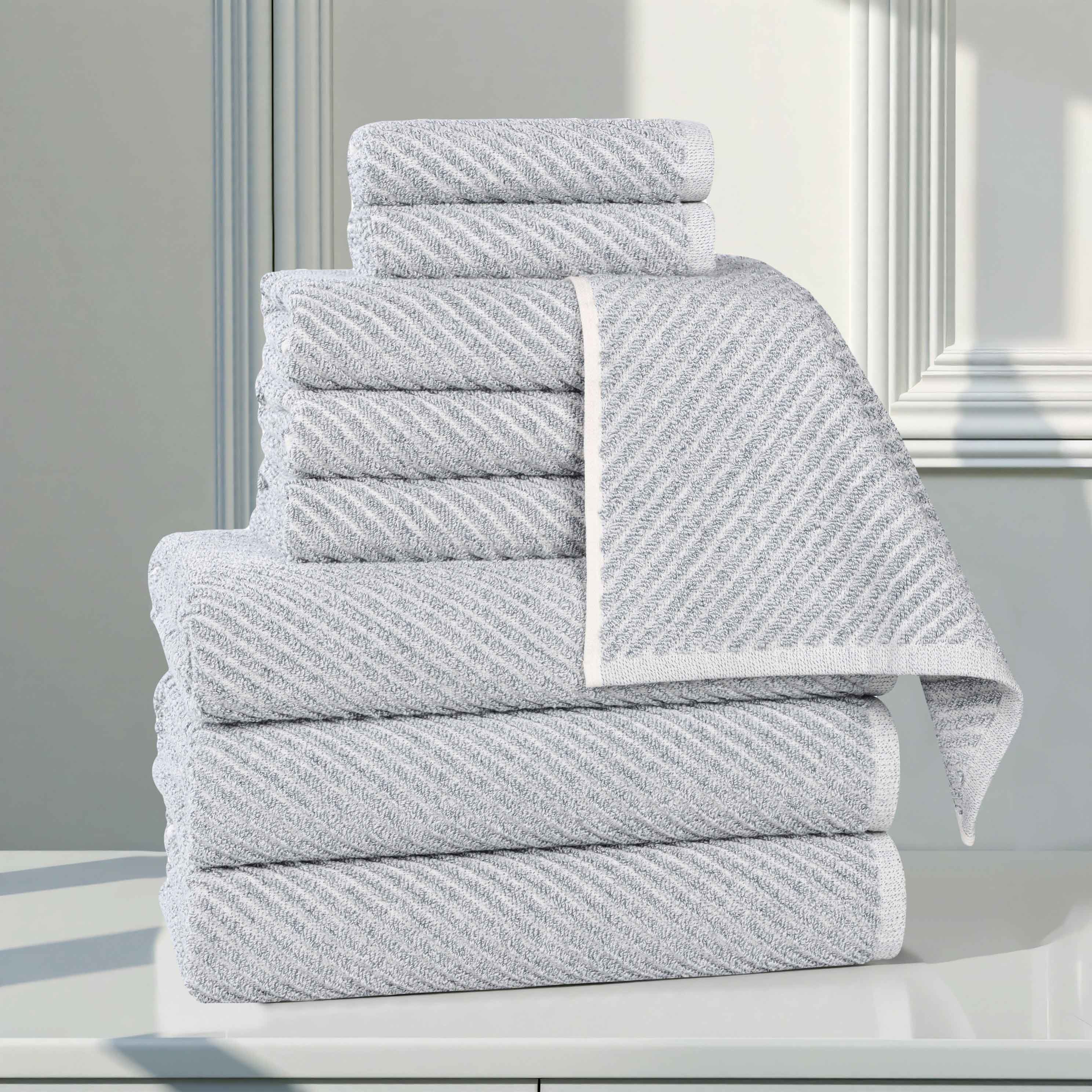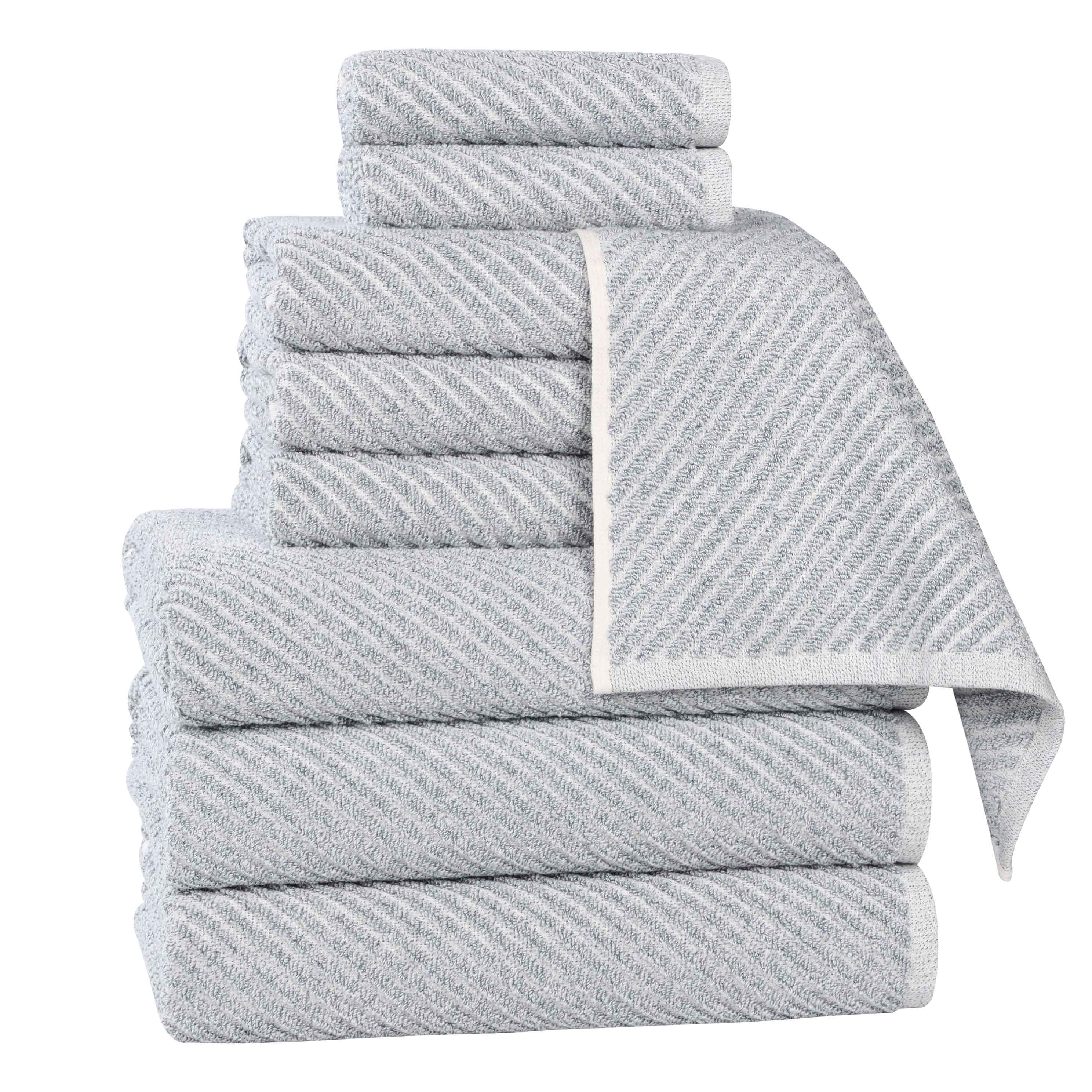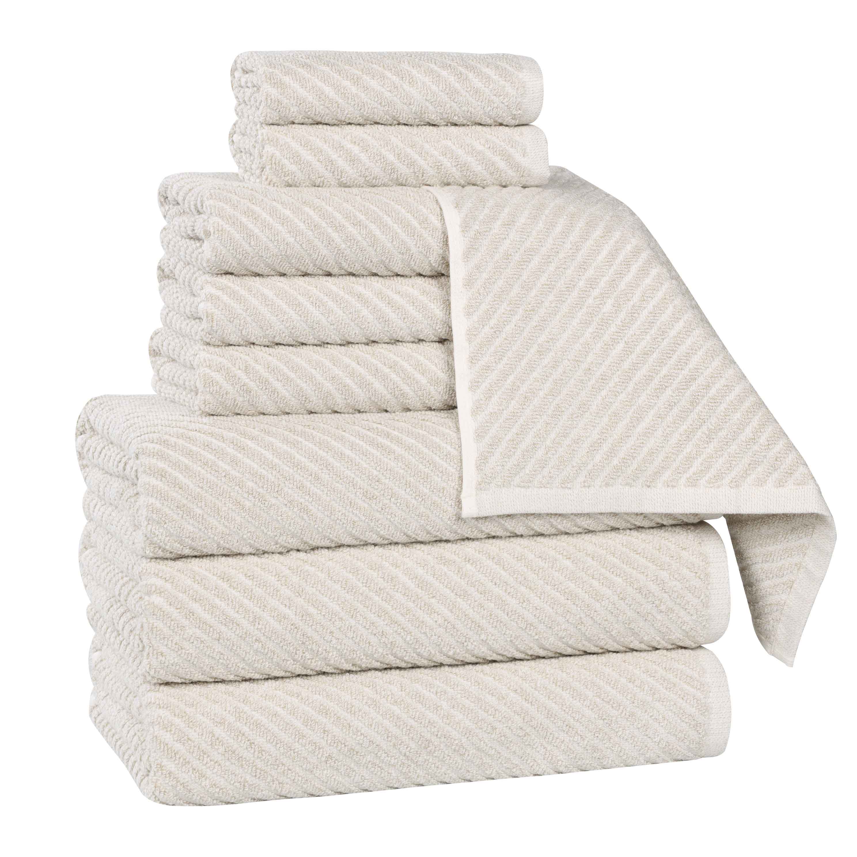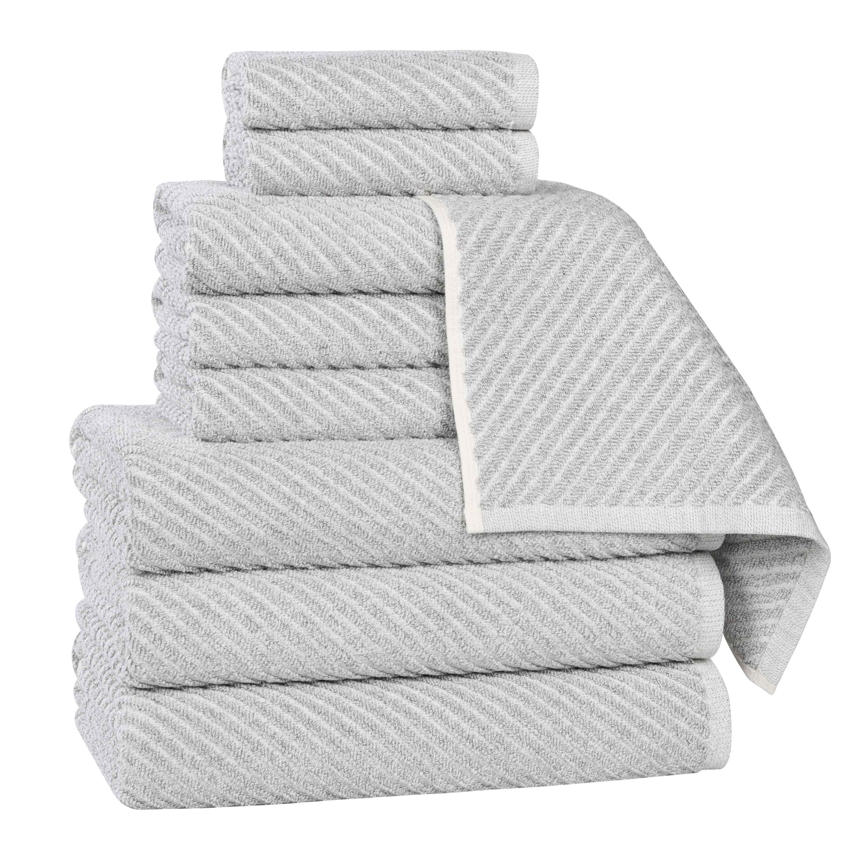 Embark on a journey of sensory delight with our Amelia Cotton Blend Textured Diagonal Ribbed 9 Piece Towel Set, meticulously crafted to transform your bathroom into a personal sanctuary. The distinctive textured, diagonal ribbed design lends an air of modern elegance to these exceptionally soft and absorbent towels. Crafted from a premium blend of 80% cotton and 20% viscose, they are meticulously woven to provide lasting comfort and exceptional durability. Experience the difference that superior craftsmanship and exquisite design can make in your everyday life.