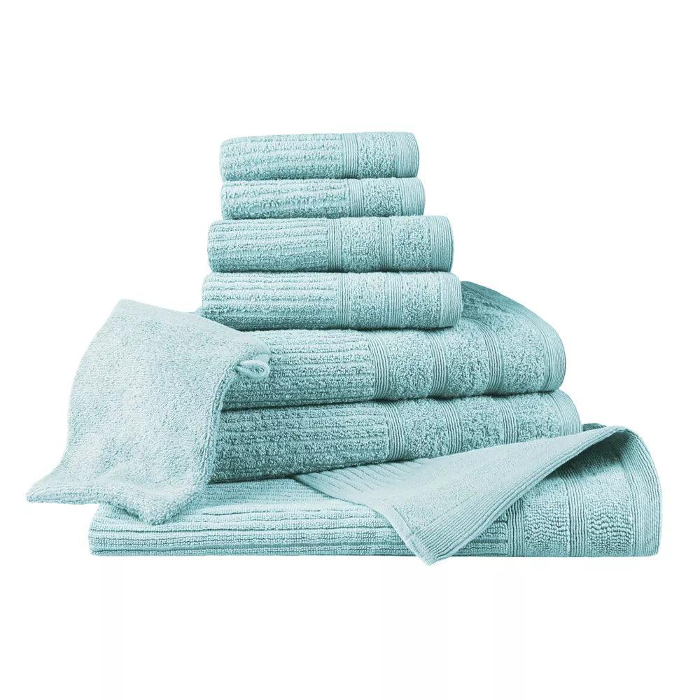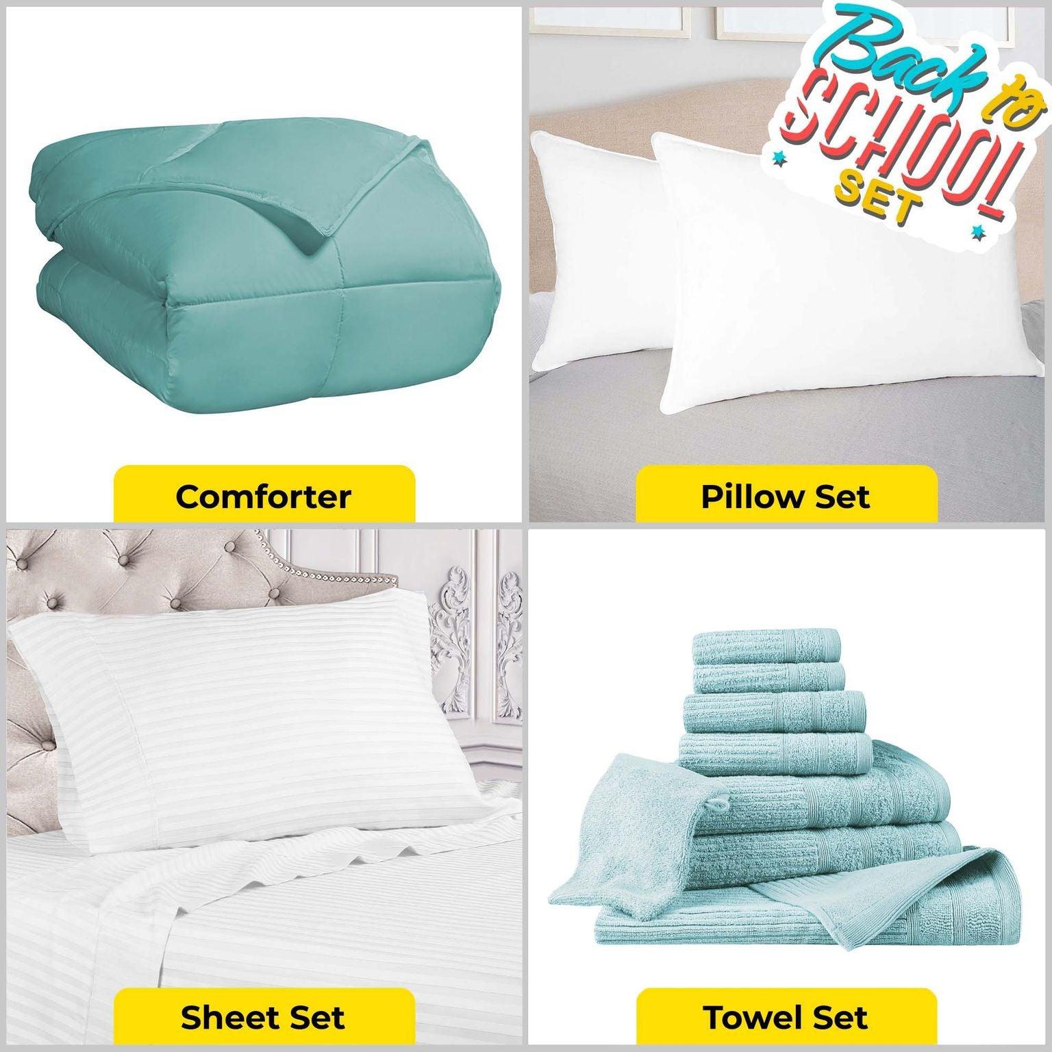 Make your dorm room feel more like home and settle into your freshman year a little easier with the Superior Back To School Kit. Find everything your dorm room needs all in one bundle with this stress-free bedding set. Displaying coordinating turquoise, white, and aqua colors, and solid and striped patterns, this bundle of room essentials includes; one twin comforter, one twin xl flat sheet, one twin xl fitted sheet, one pillowcase, two standard size pillows, two bath towels, two hand towels, two face towels/ washcloths, one bath mat, and one hand glove. Easily upgrade your bedroom and bathroom space with the items in this welcome back to school care package. Relax and take the hassle out of back to school shopping with this must-have college room set.