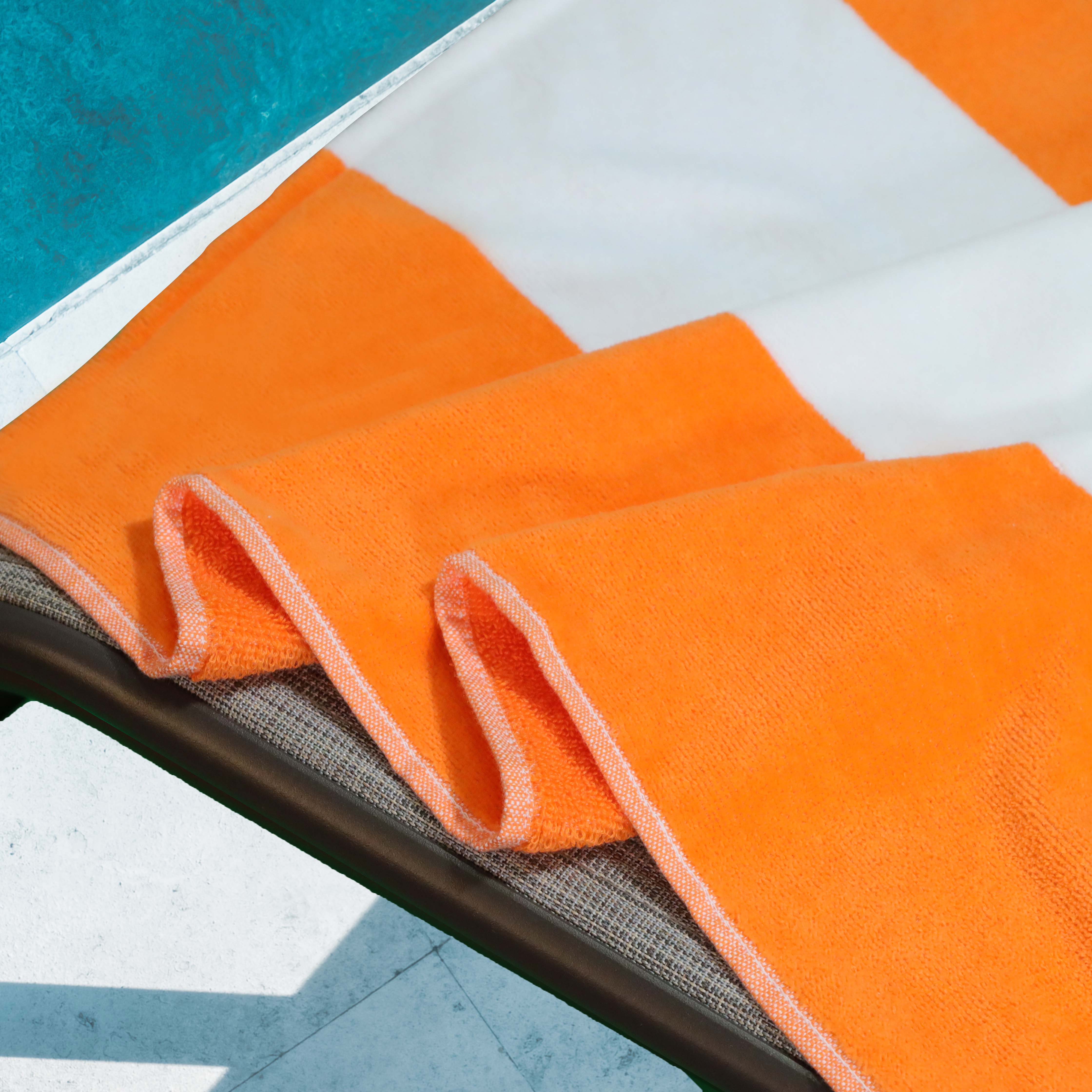Protect your beach chairs and lay out in the sun comfortably with our Cabana Striped Lounge Chair Cover Set. Crafted from Cotton, the textured terry loop design of these covers helps get you dry quickly after a dip in the pool and helps shield your chair cushions from sunscreen, saltwater, or chlorine. These chair covers have an extra back flap to protect the top of the seat, so you can have total peace of mind while you enjoy fun in the sun. Any extra length can be draped or tucked under to fit snuggly. For added durability, this chair cover doubles as a towel and features lock-stitched hems for a clean, streamlined finish. This bold cabana striped pattern is available in a variety of vibrant color options to add a touch of playful charm to your chairs.