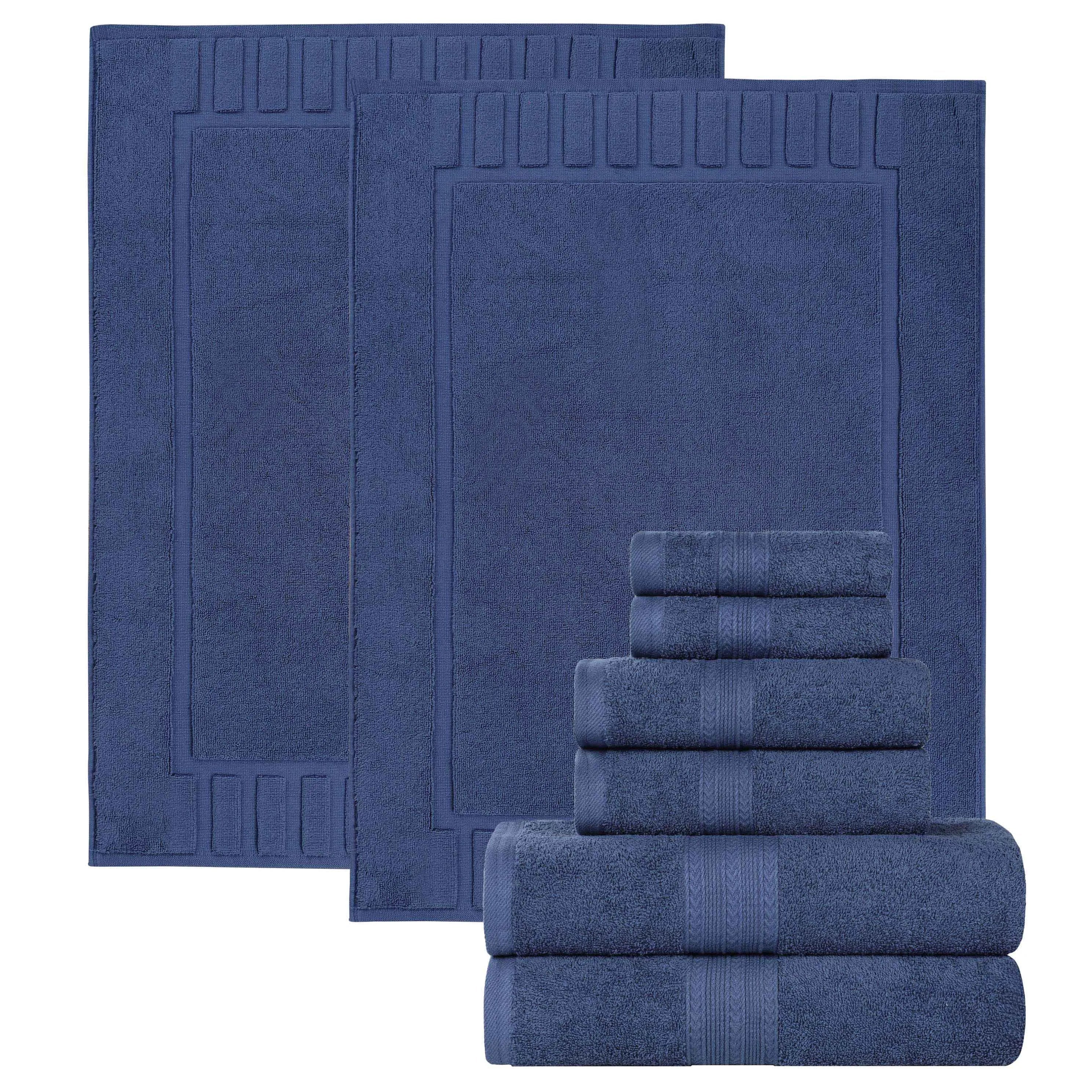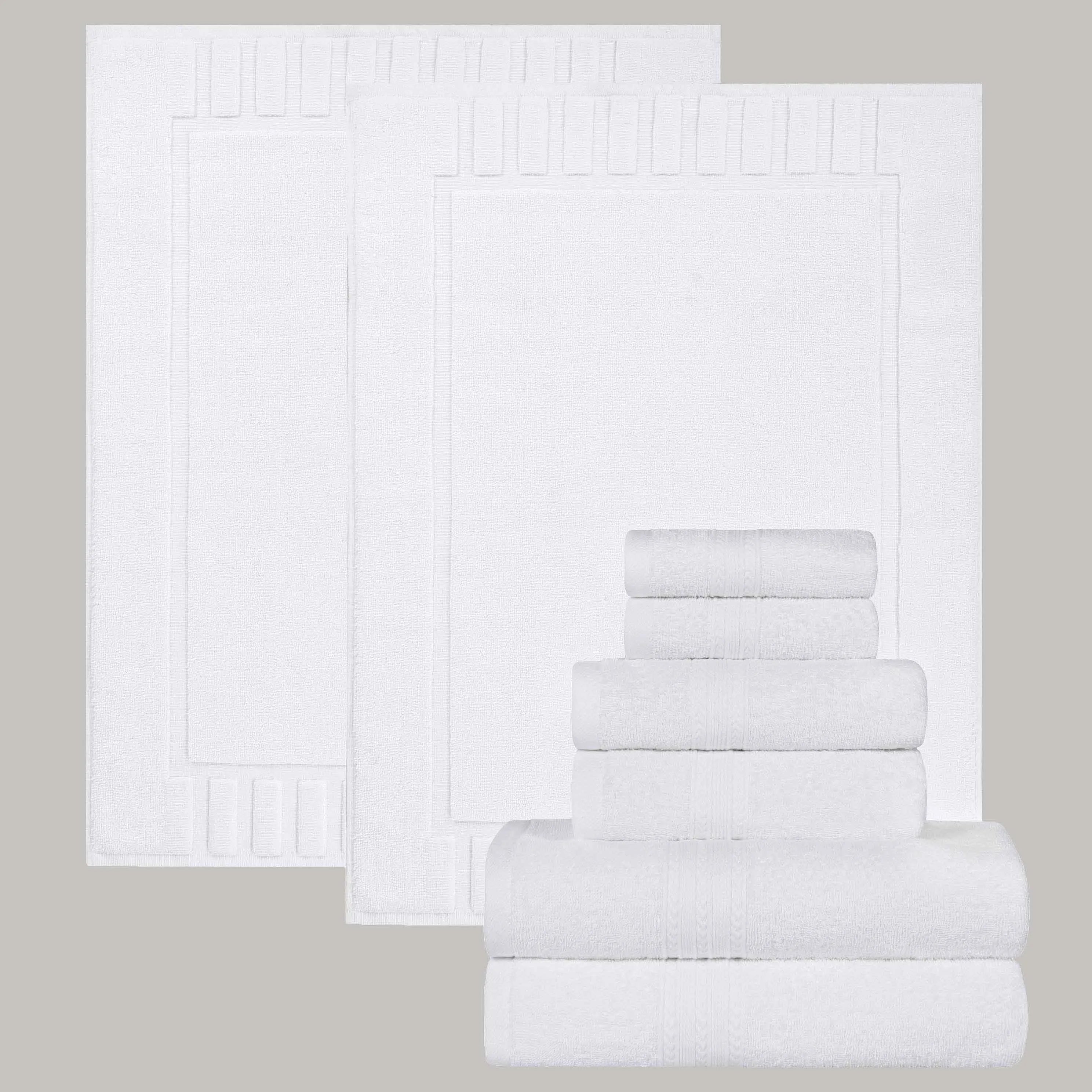 Embrace sustainable luxury with the Classic Eco Comfort Bath Bundle. This thoughtfully curated 8-piece set combines the eco-conscious softness of regenerated cotton towels with the modern elegance of geometric border cotton bath mats. Featuring towels crafted from green, ring-spun cotton for superior absorbency and a reduced environmental footprint, and thick, plush bath mats designed for lasting comfort and floor protection. Available in a soothing palette of aqua marine, coral, copper, white, and navy blue, this bundle brings a touch of modern classic style and eco-friendly comfort to your daily routine.