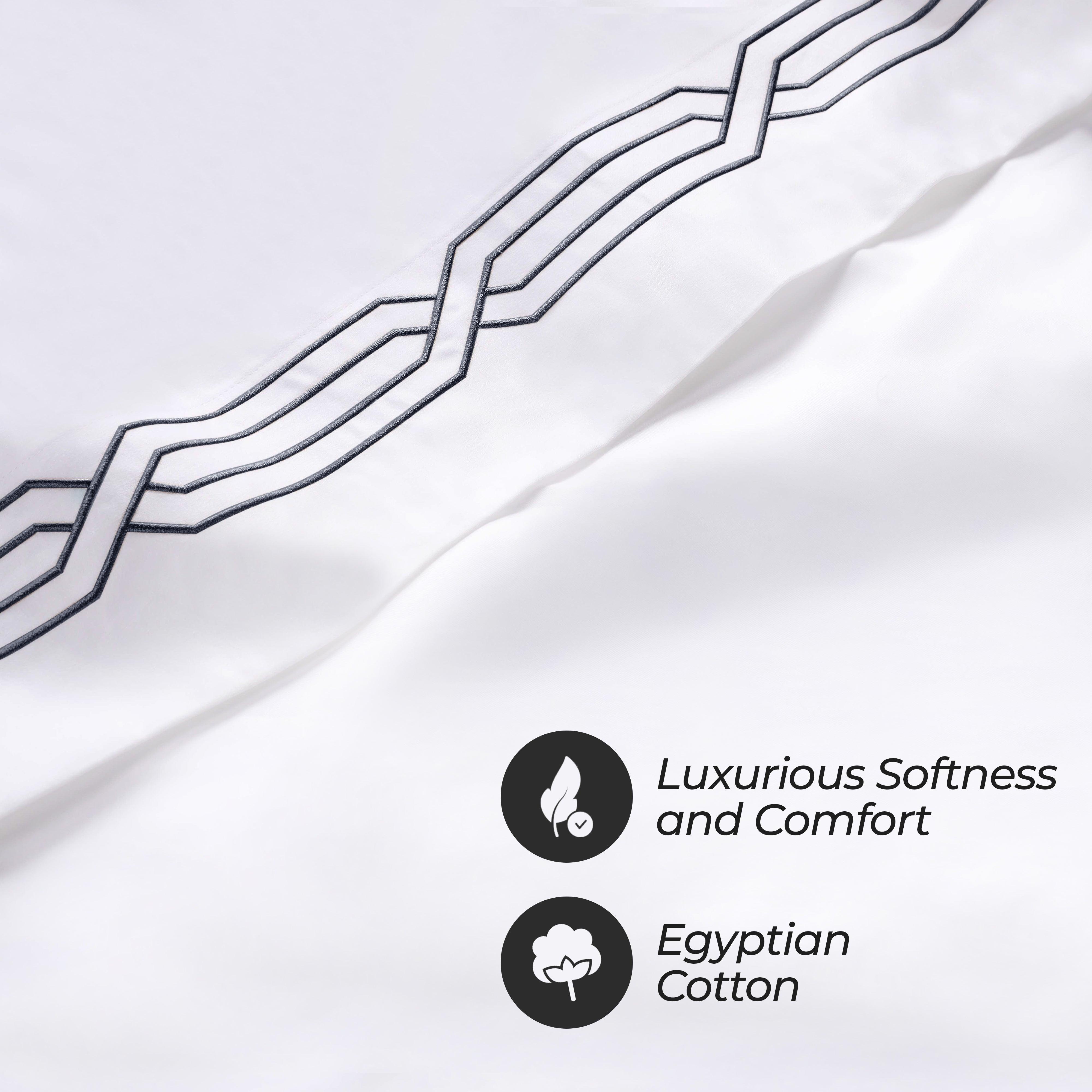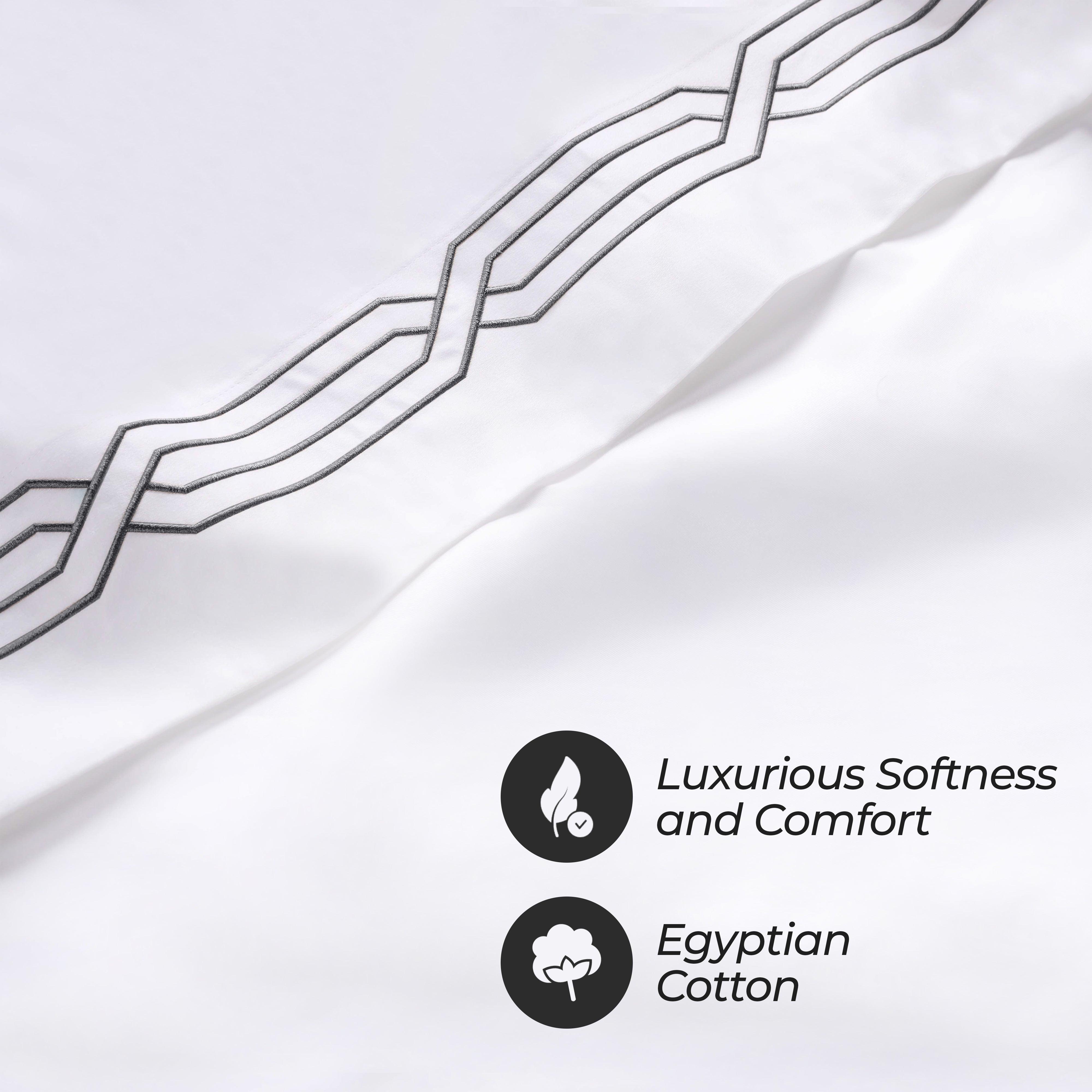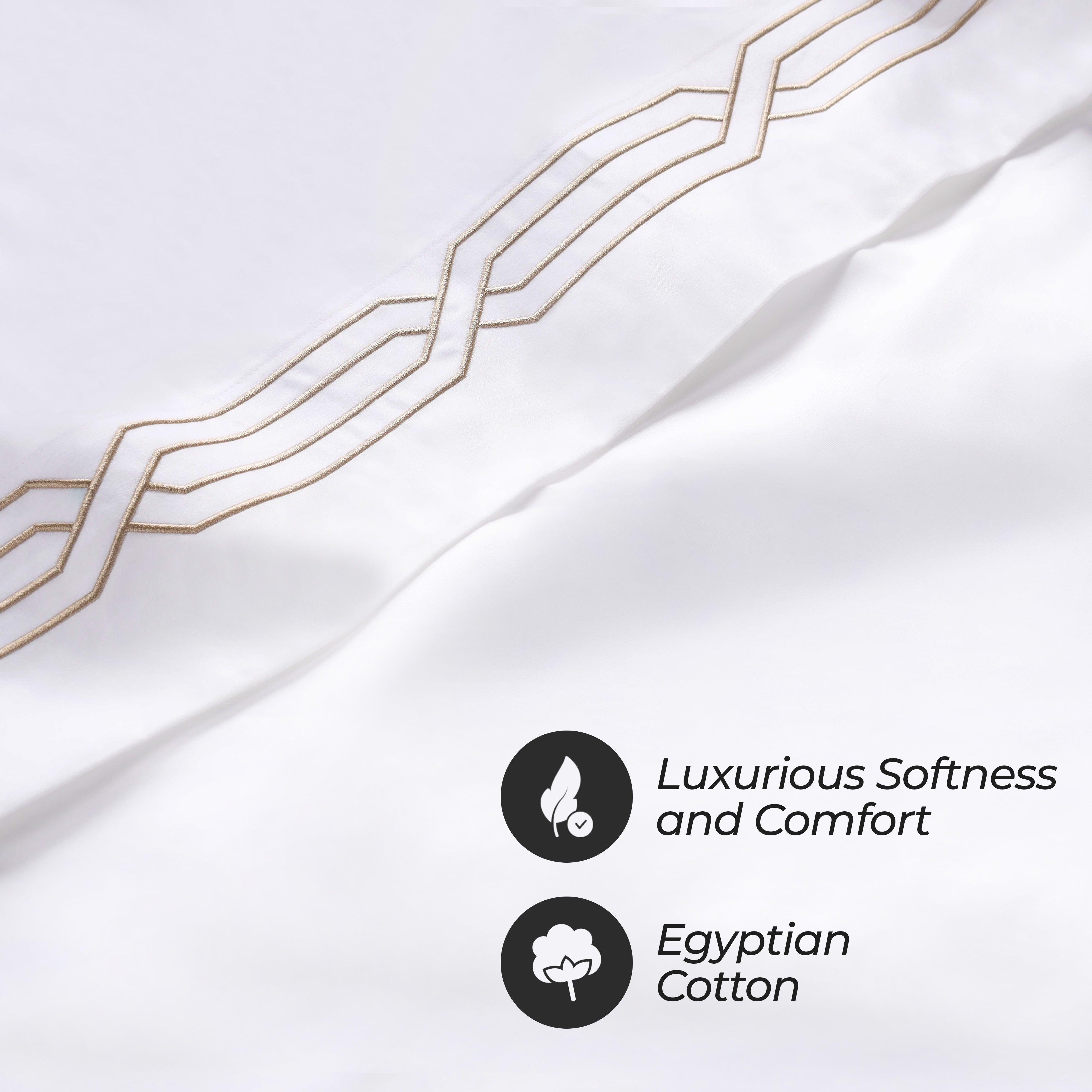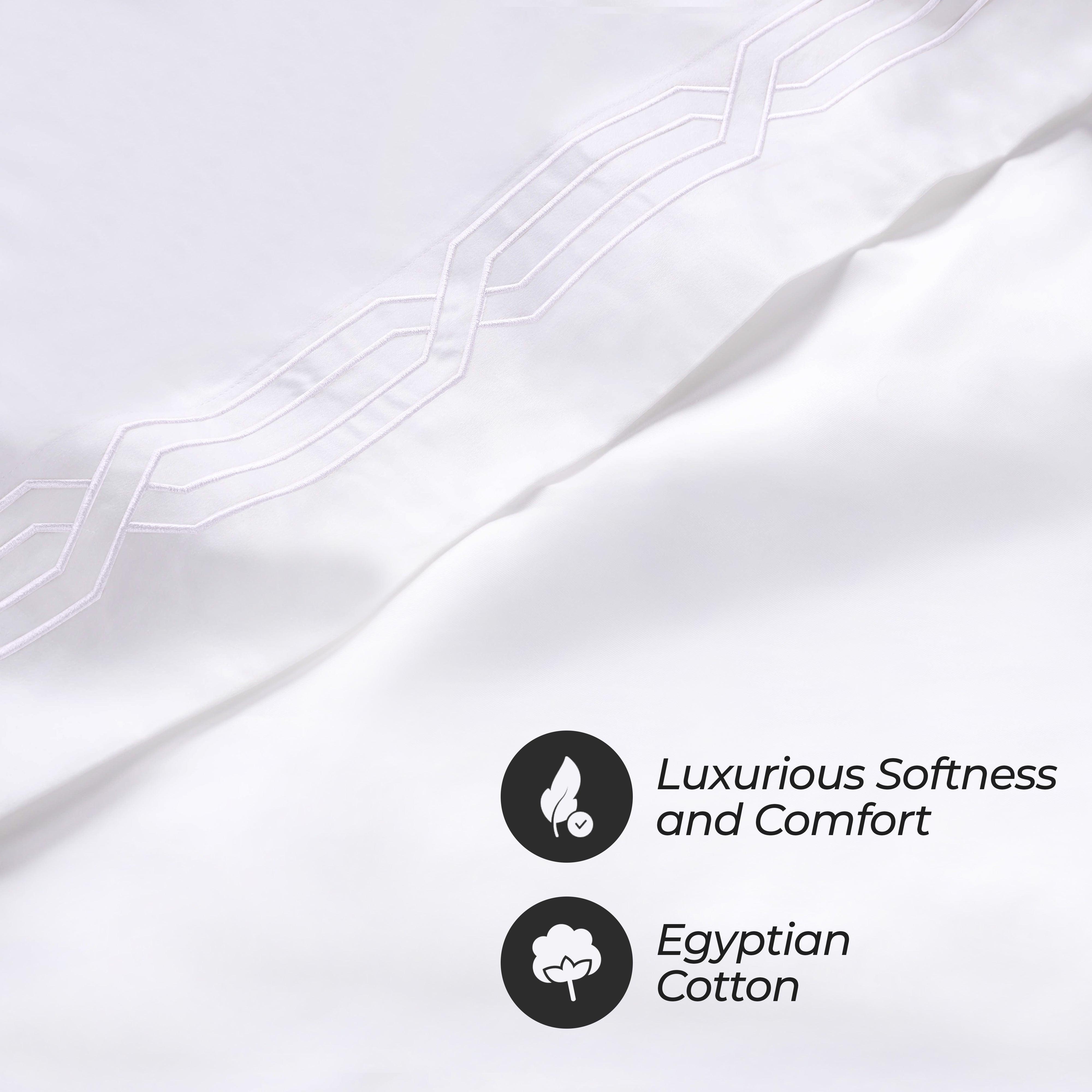 These premium Egyptian cotton sheets are crafted from 100% real Egyptian Cotton with a 1200 thread count, offering a thick, weighty texture and a structured, elegant feel. The sateen weave enhances the natural sheen, while decorative geometric embroidery on the flat sheet and pillowcases adds refined detail.