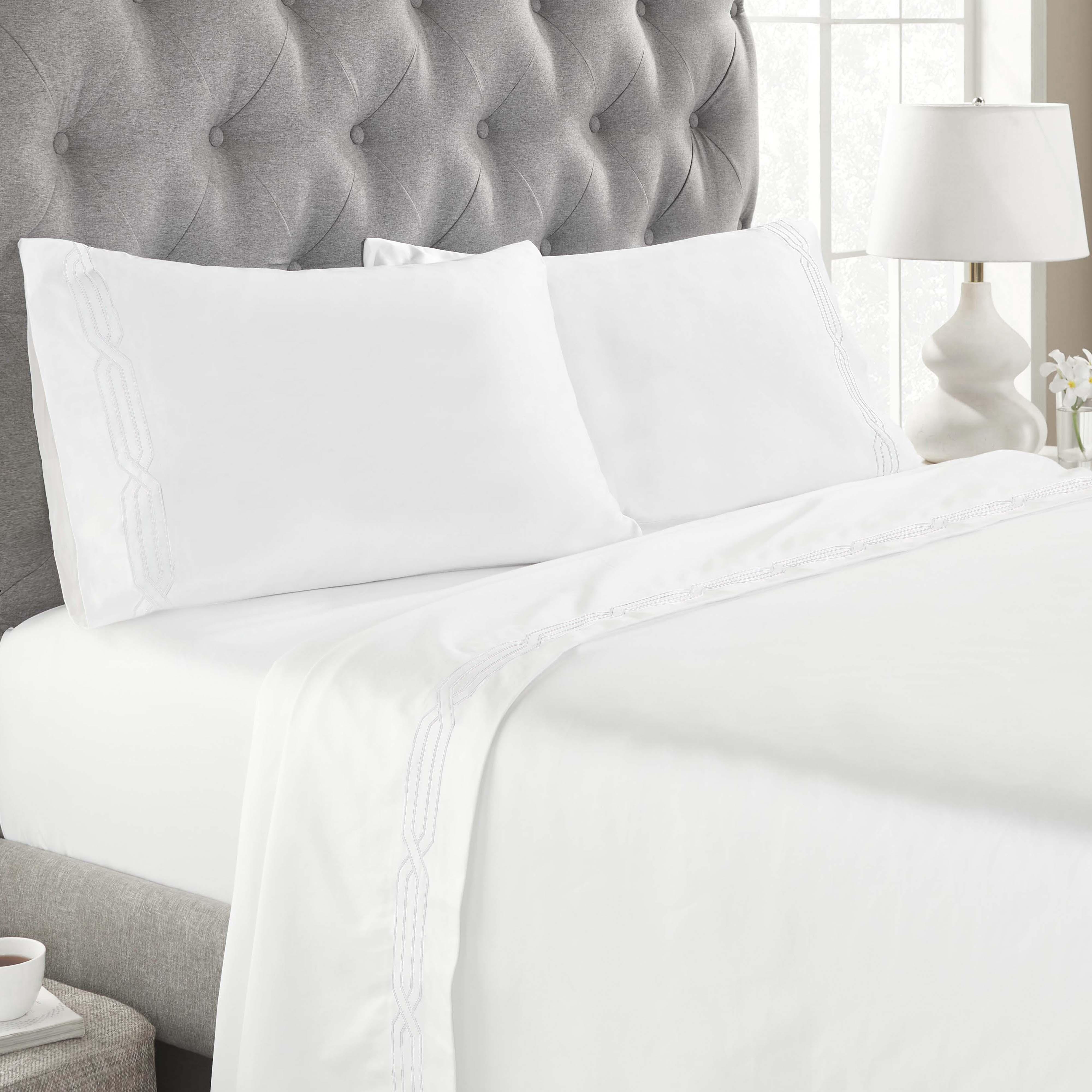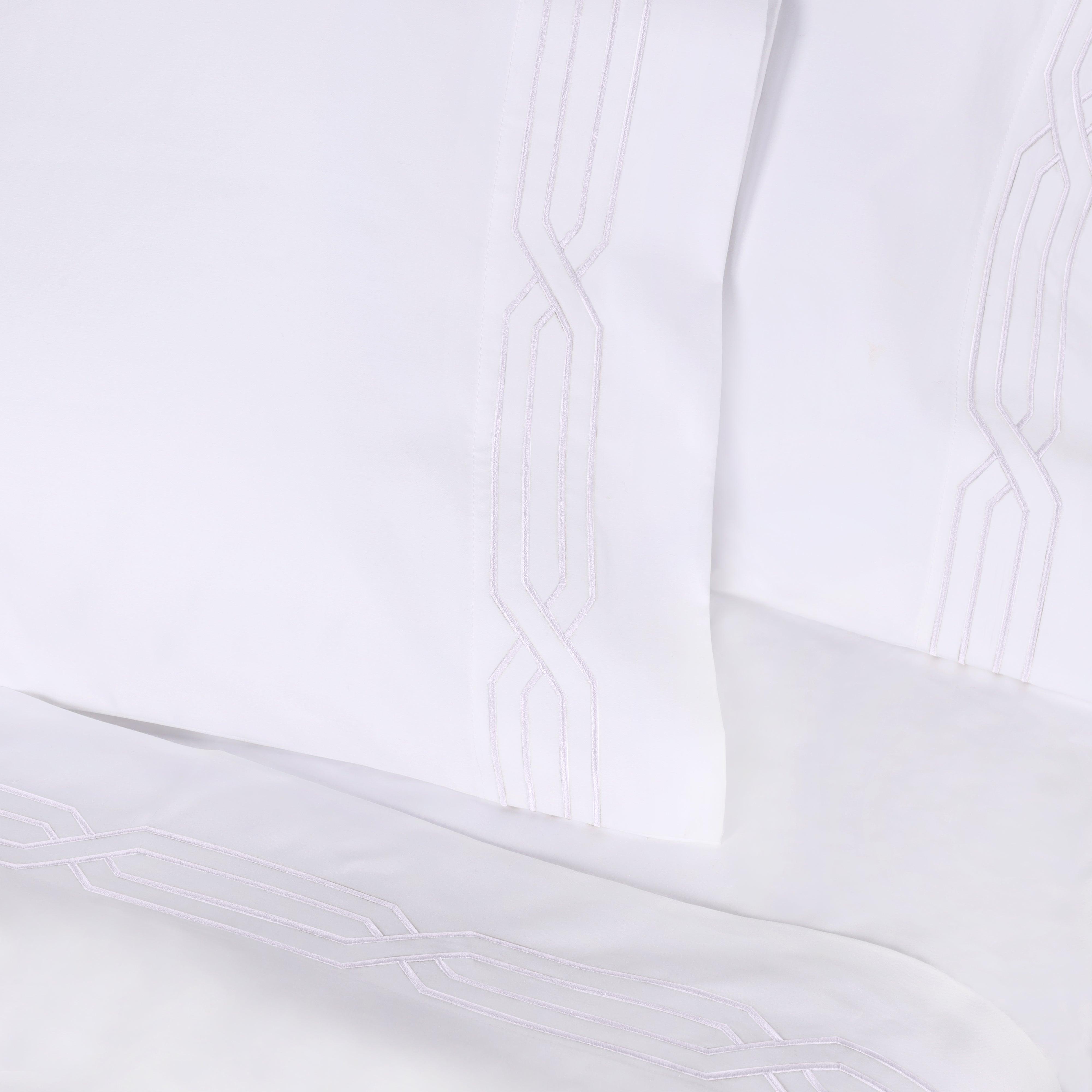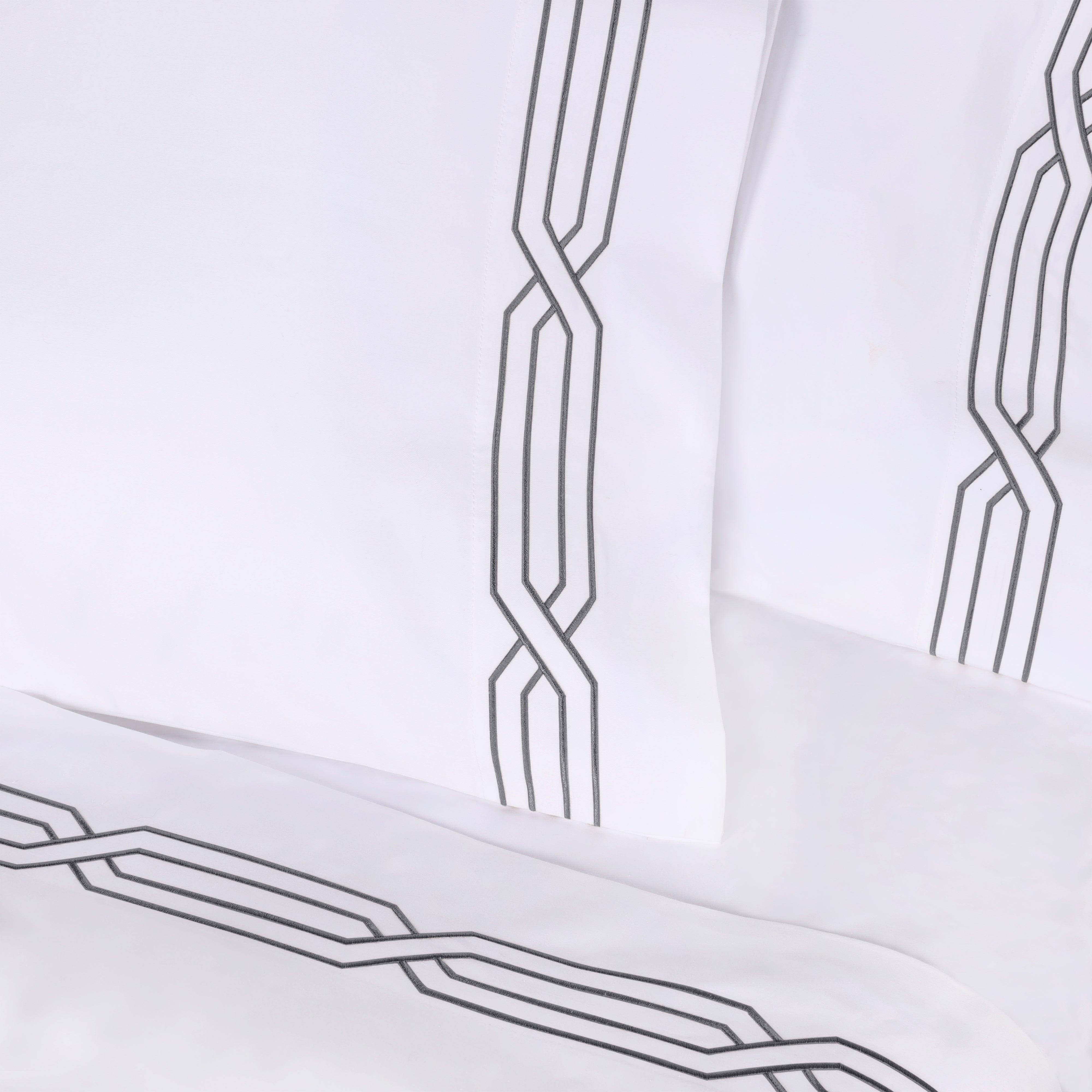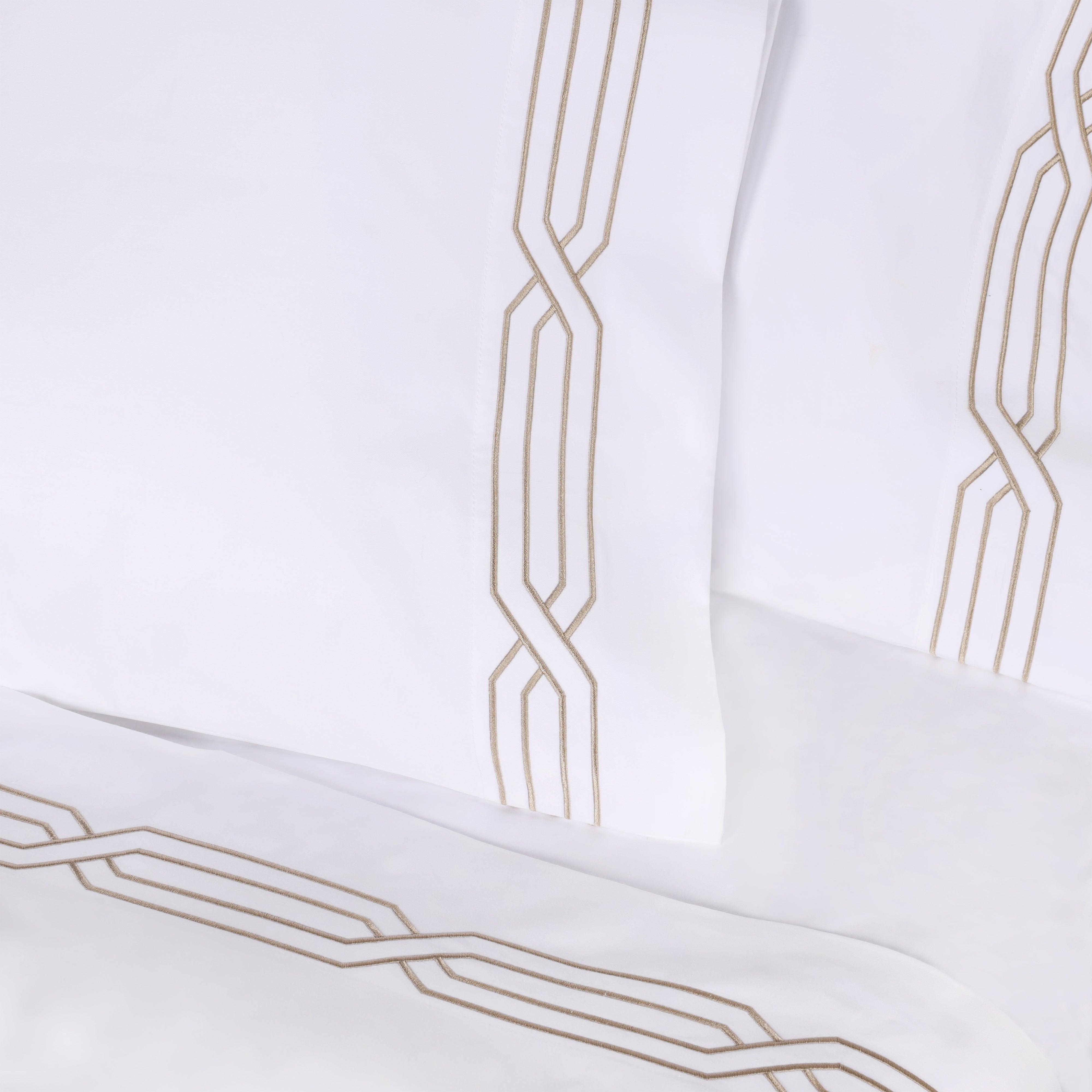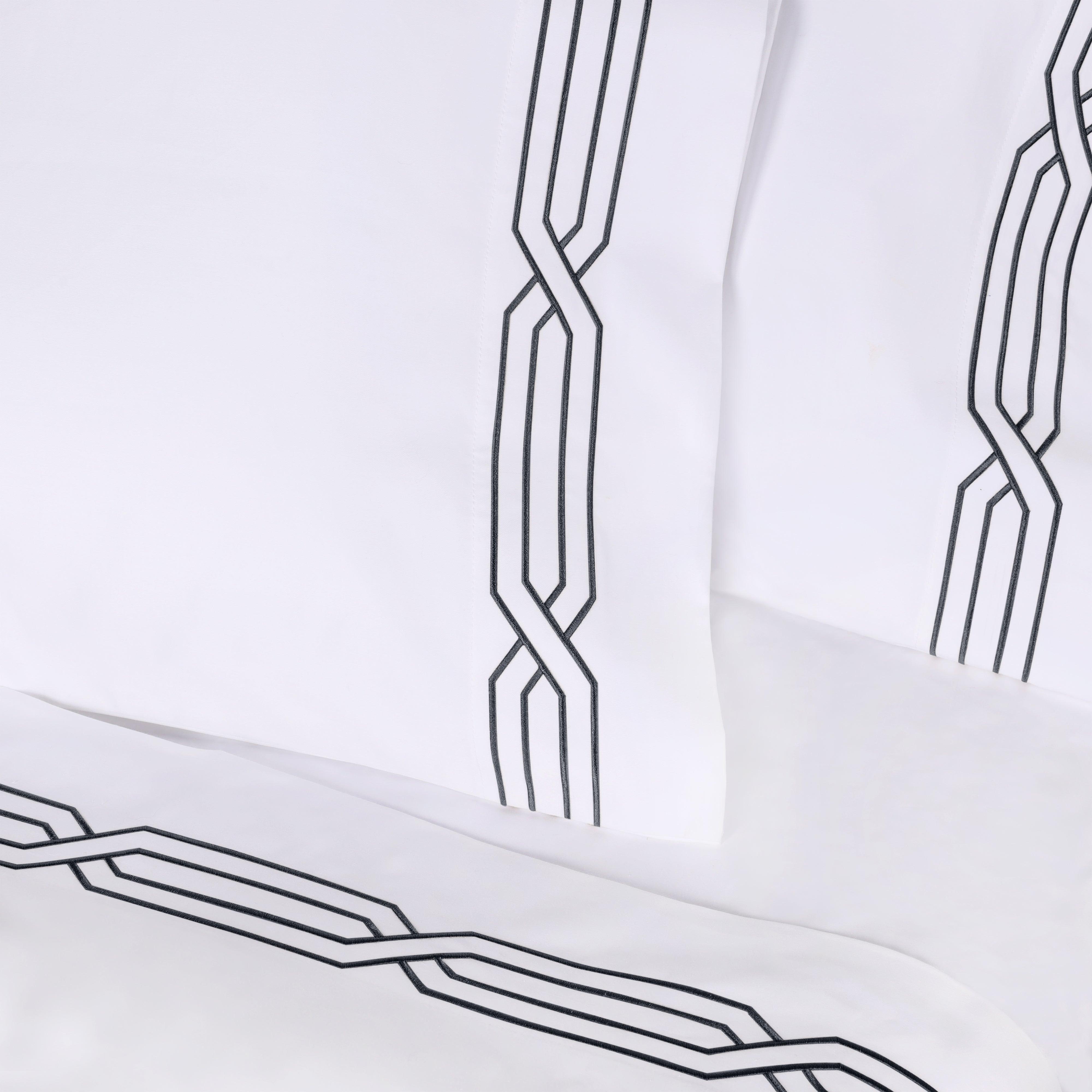 These premium Egyptian cotton sheets are crafted from 100% real Egyptian Cotton with a 1200 thread count, offering a thick, weighty texture and a structured, elegant feel. The sateen weave enhances the natural sheen, while decorative geometric embroidery on the flat sheet and pillowcases adds refined detail.