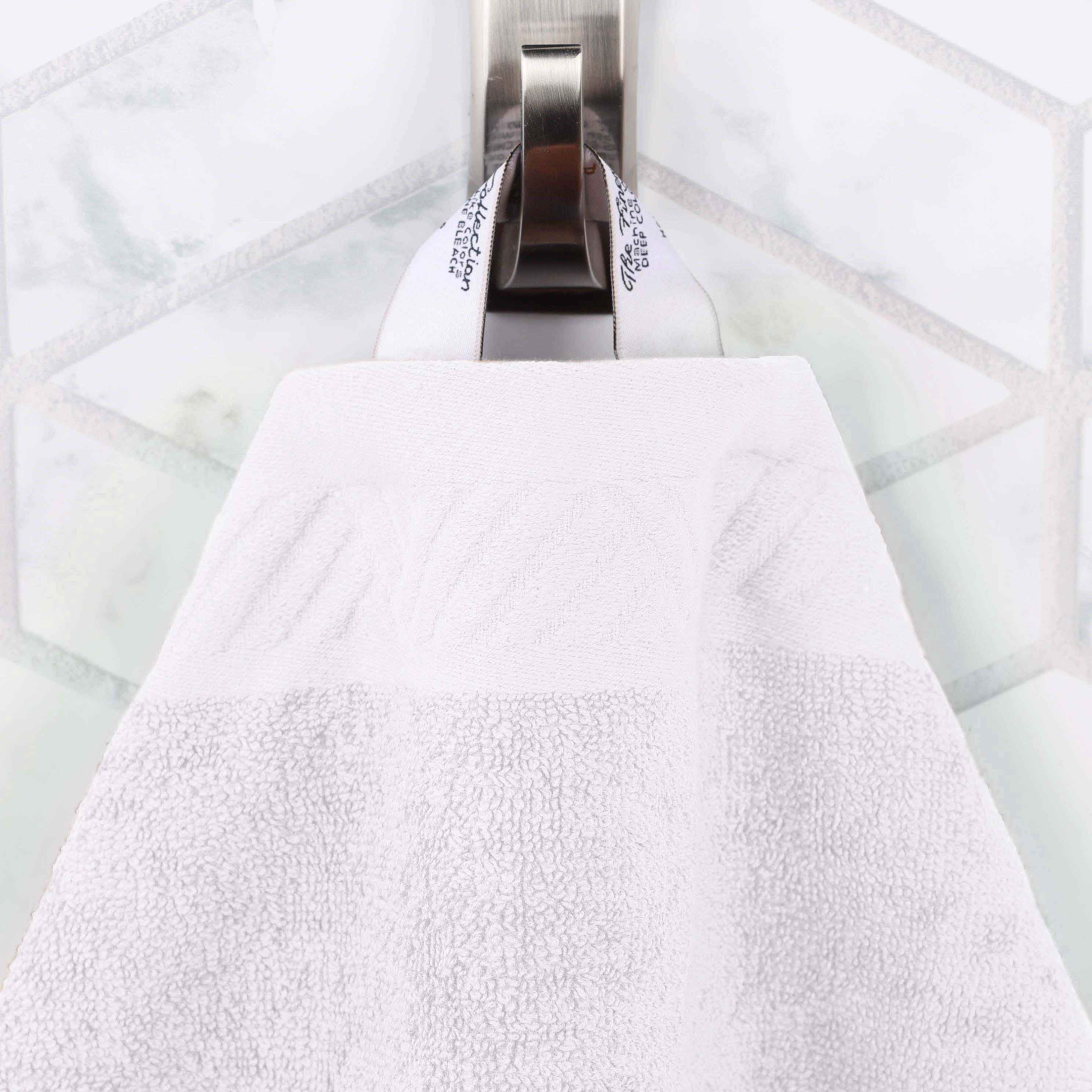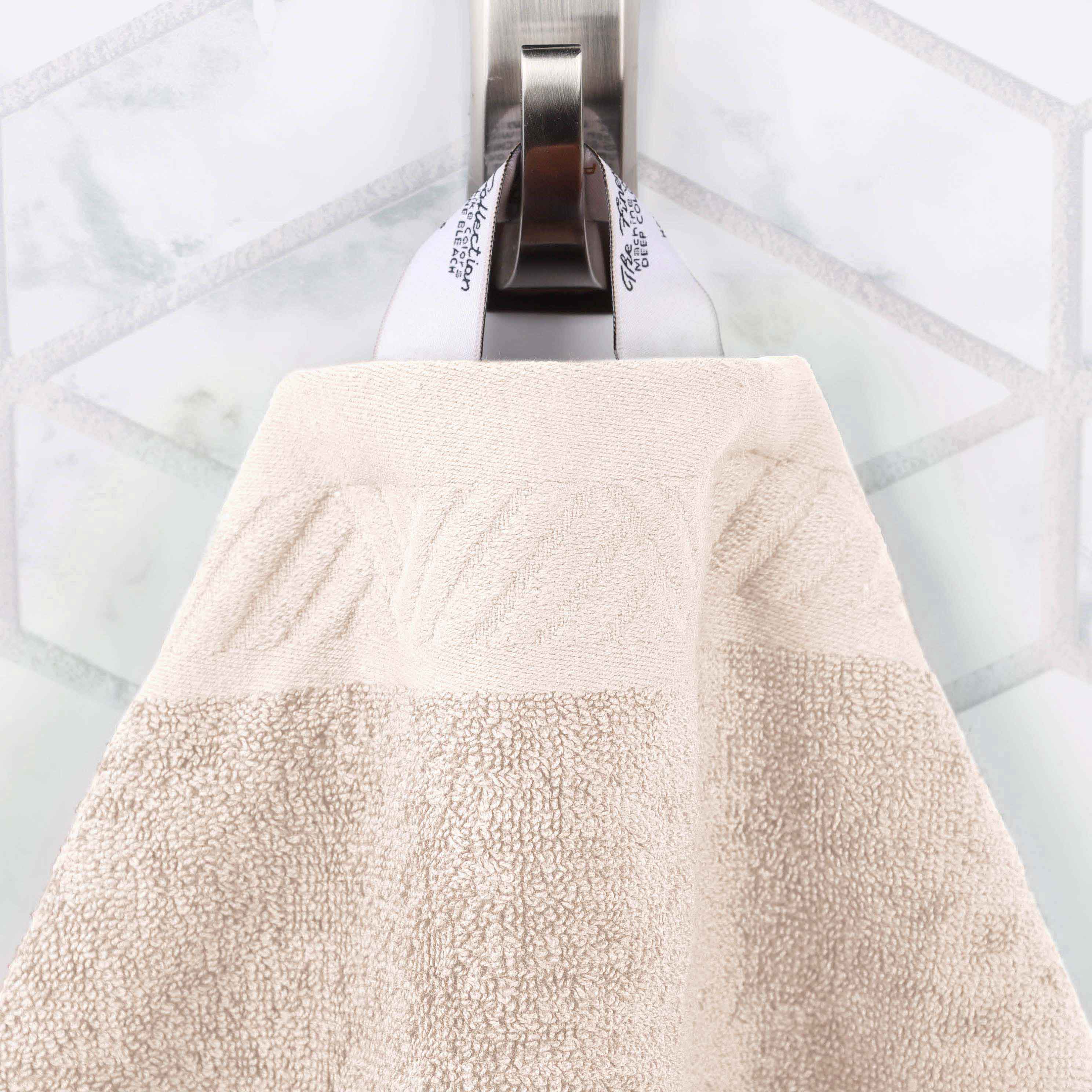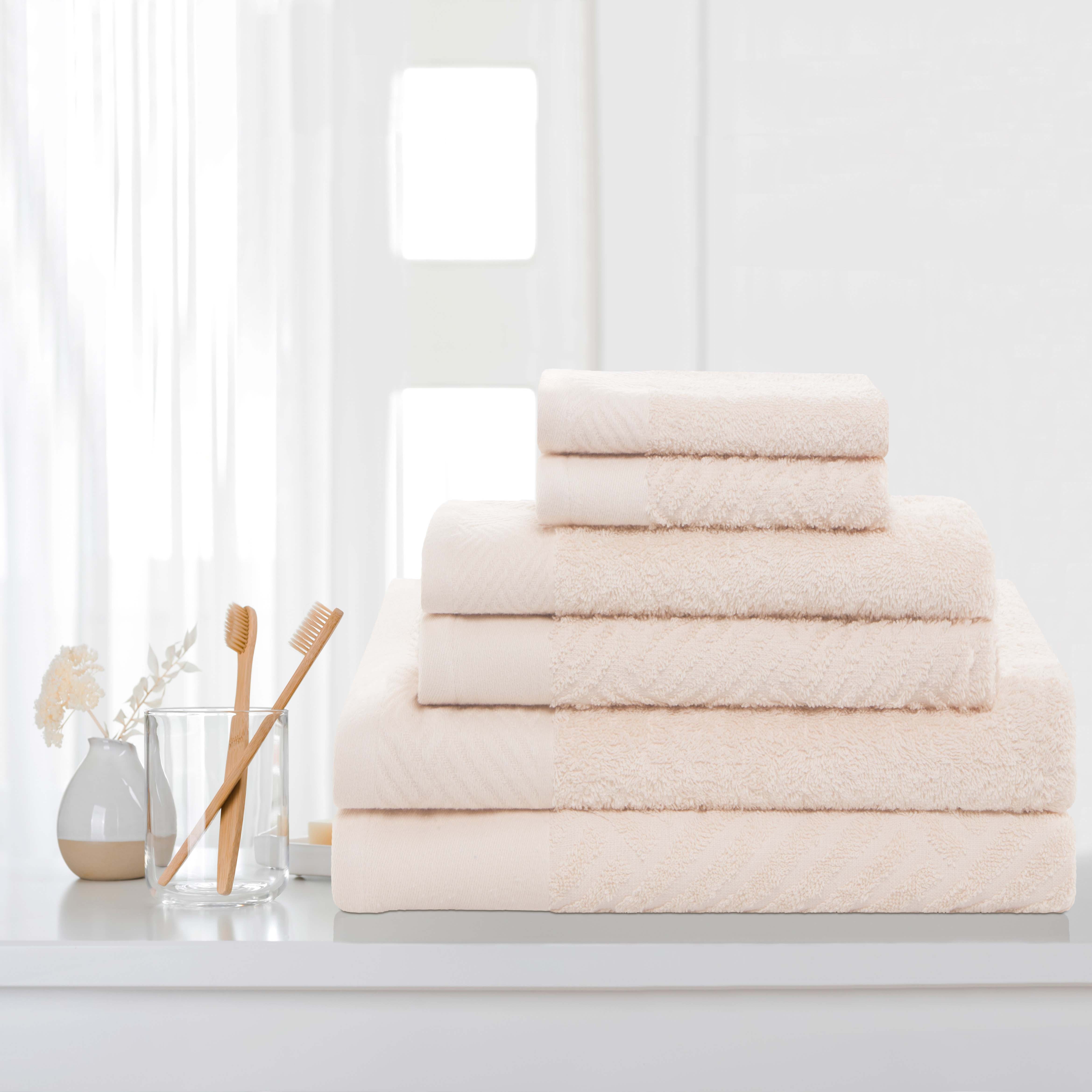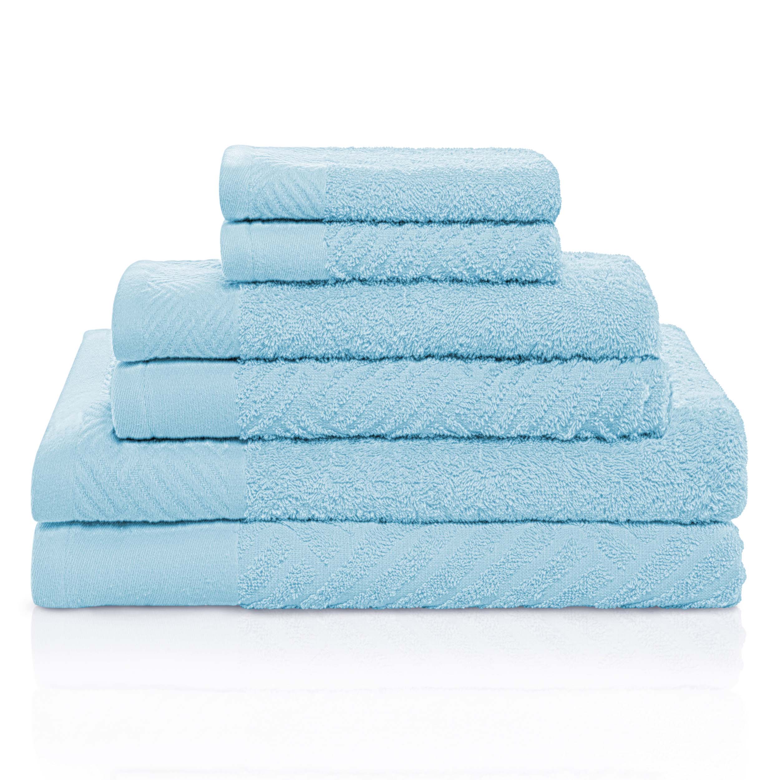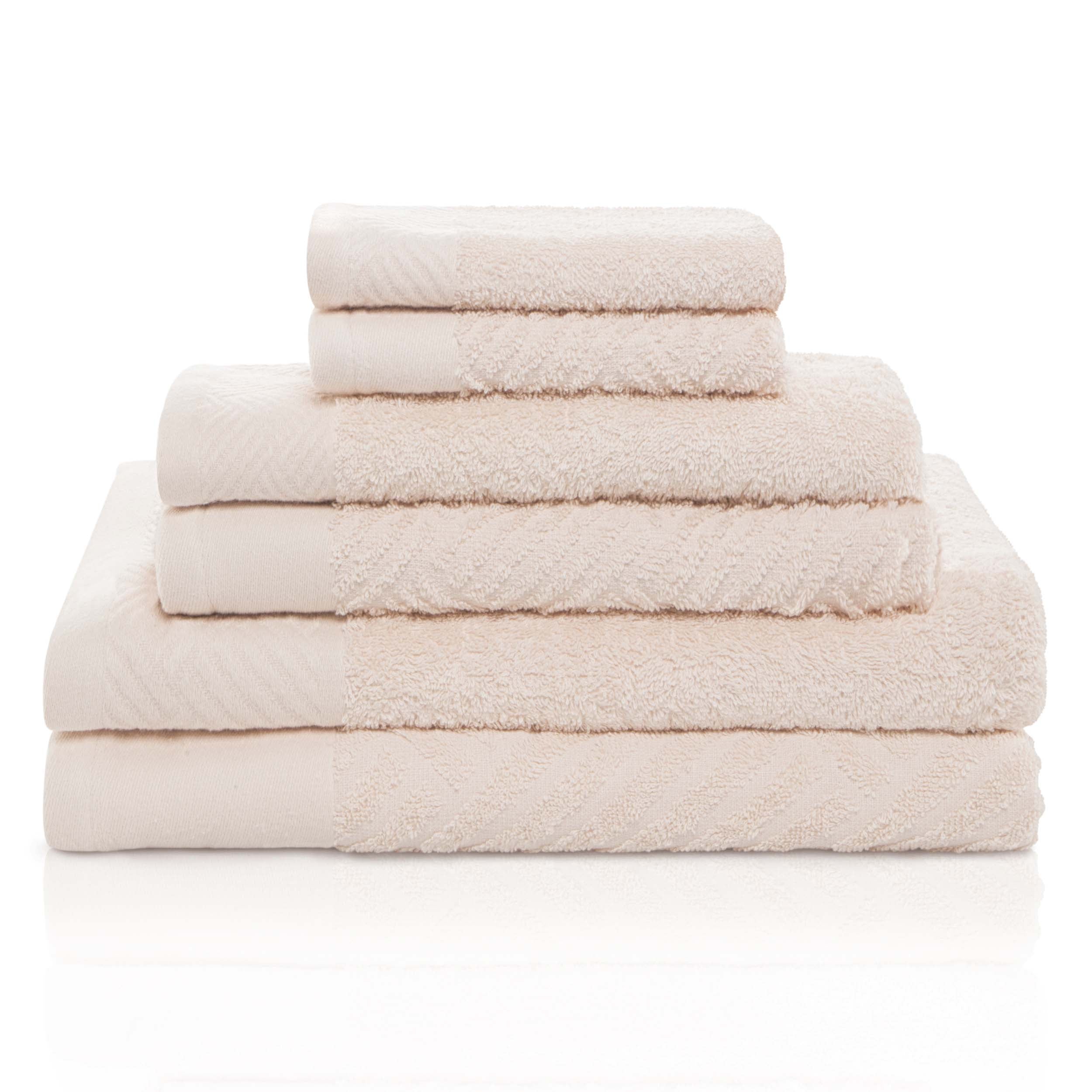 Subtly soft against the skin, the Basketweave Jacquard and Solid 6-Piece Egyptian Cotton Towel Set is a luxurious addition to your bathroom décor. The Egyptian Cotton construction has a luxurious feel while also being highly absorbent to get you dry quickly. This coordinated 6-piece set includes two-bath, two-hand, and two-face towels/wash cloths that are available in two unique patterns including a jacquard border with a contrasting solid design and a solid border with a contrasting jacquard design. This ultra-soft, machine washable design is available in an array of long-lasting solid color options with finished, hemmed edges for refined style. Decorate your bathroom space with these towels that are suitable for everyday use.
