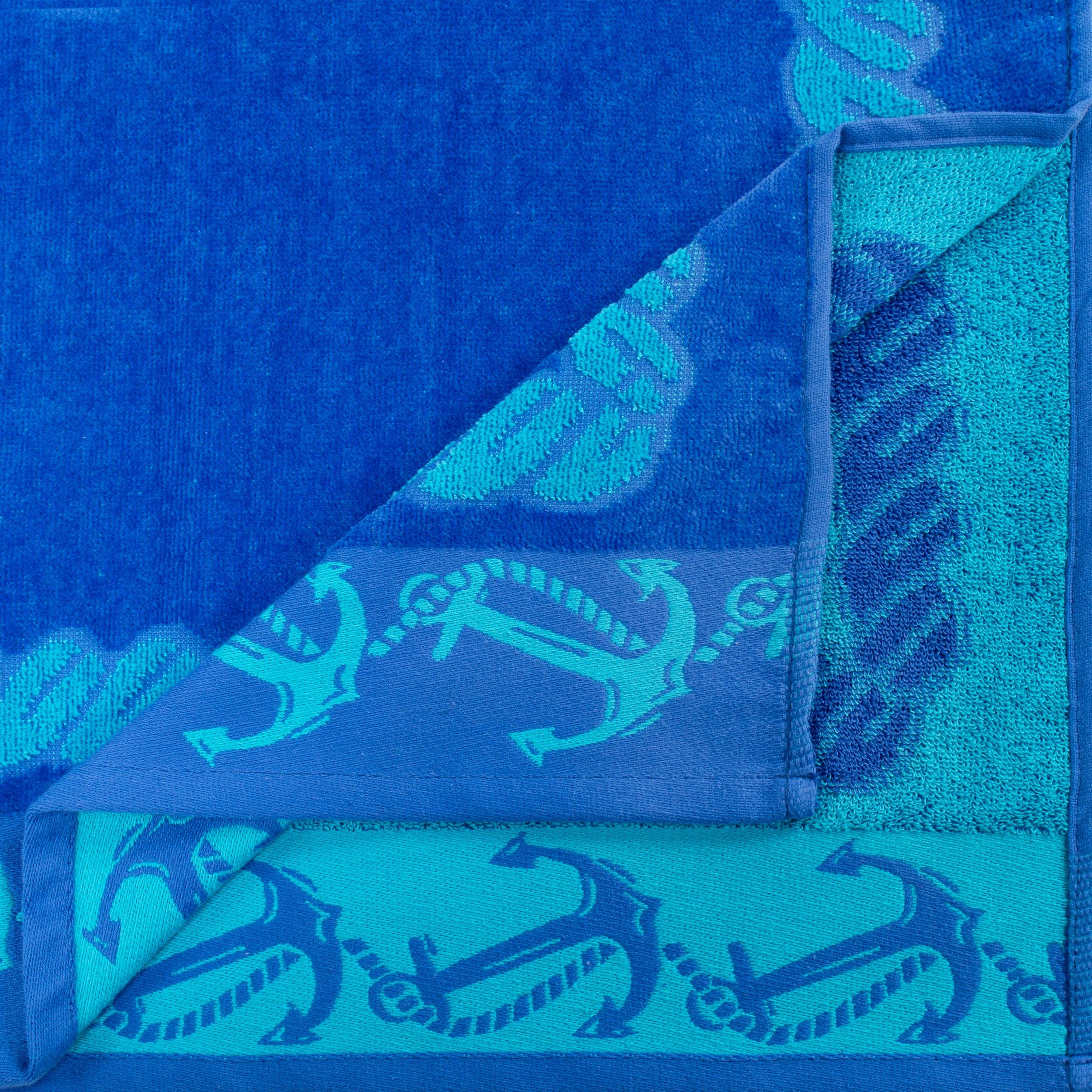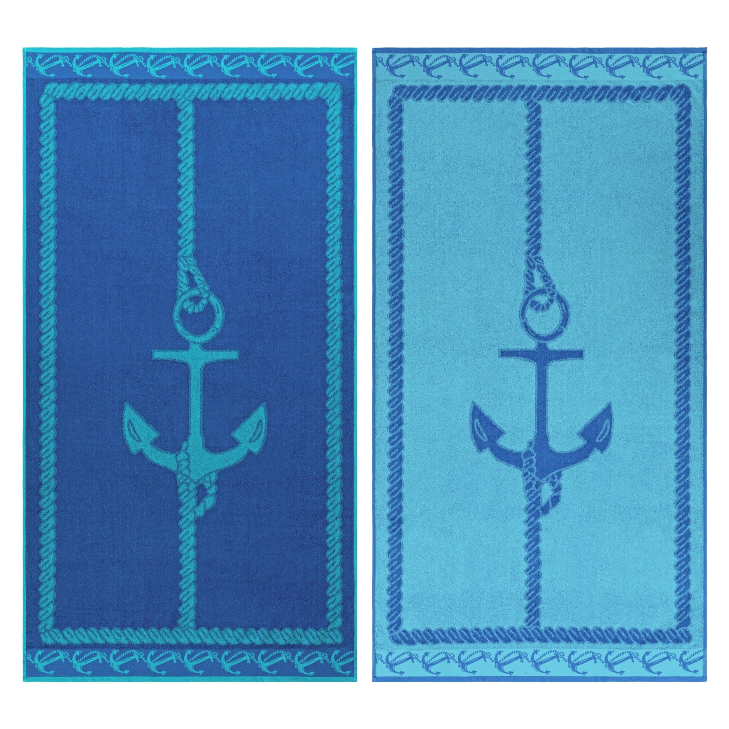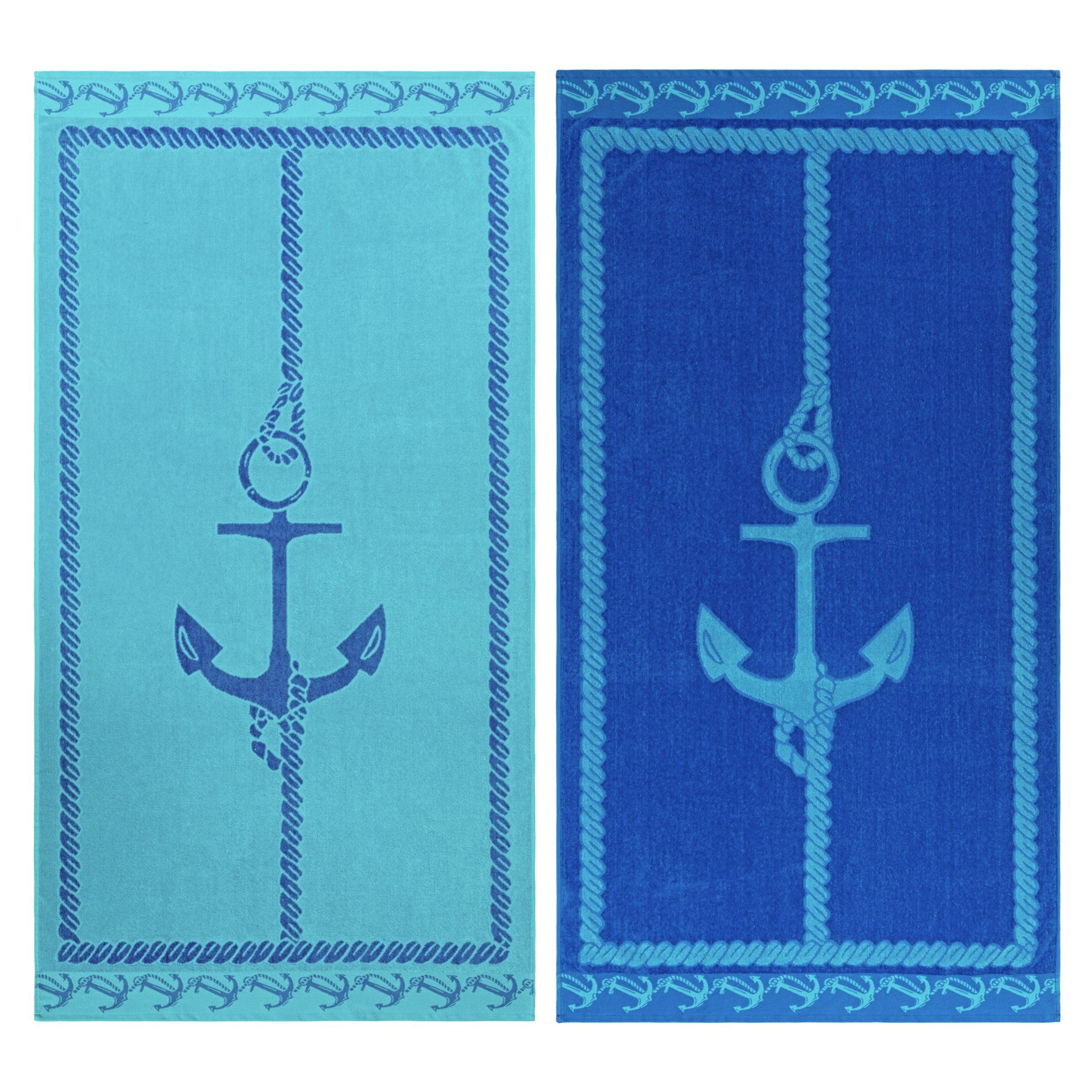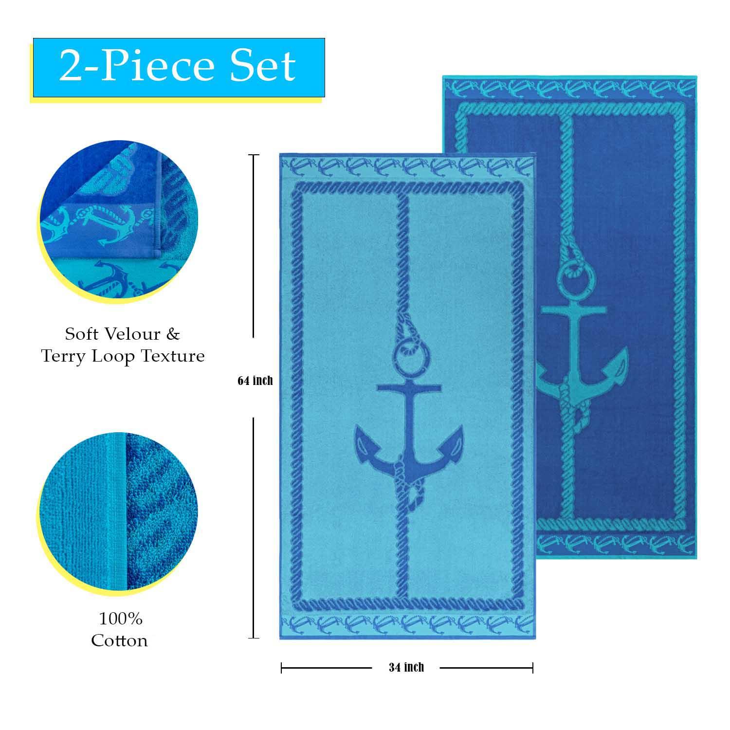 Make this summer unforgettable with the Superior Fisherman Anchor Egyptian Cotton Oversized Beach Towel Set. Reminding you of sandy beaches and pristine ocean, this towel set perfectly displays a bold fisherman's anchor motif, perfectly coordinated in blue and teal colors. The velour front provides a soft surface for relaxing while the reverse side features a highly absorbent terry material to get you dry quickly. Lounge by the poolside or sunbathe at the beach with these towels with inverted designs for a unique yet matching duo. With optimal coverage and an impressive wrap, these Egyptian Cotton towels become softer with each wash allowing you and your family to enjoy for many years to come.