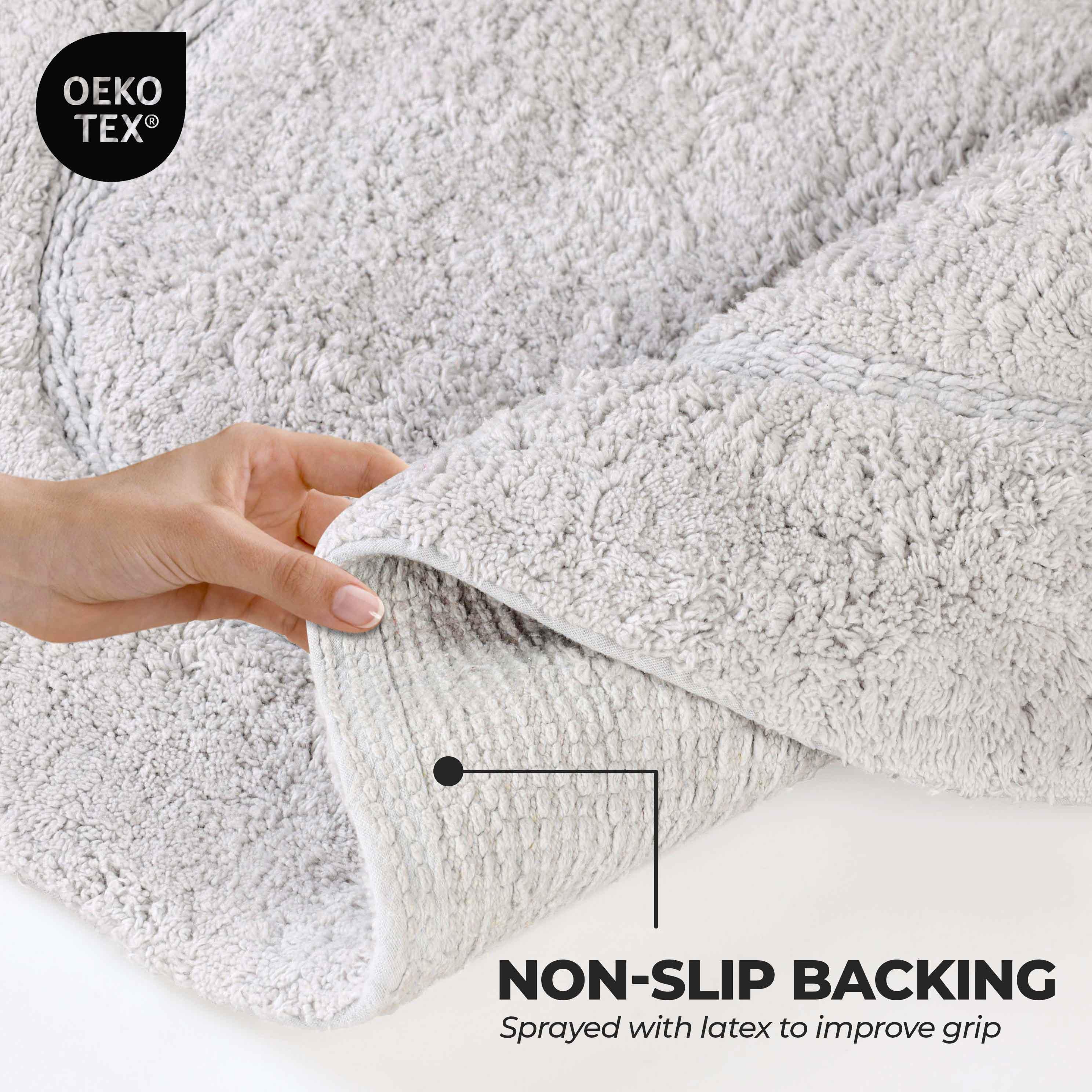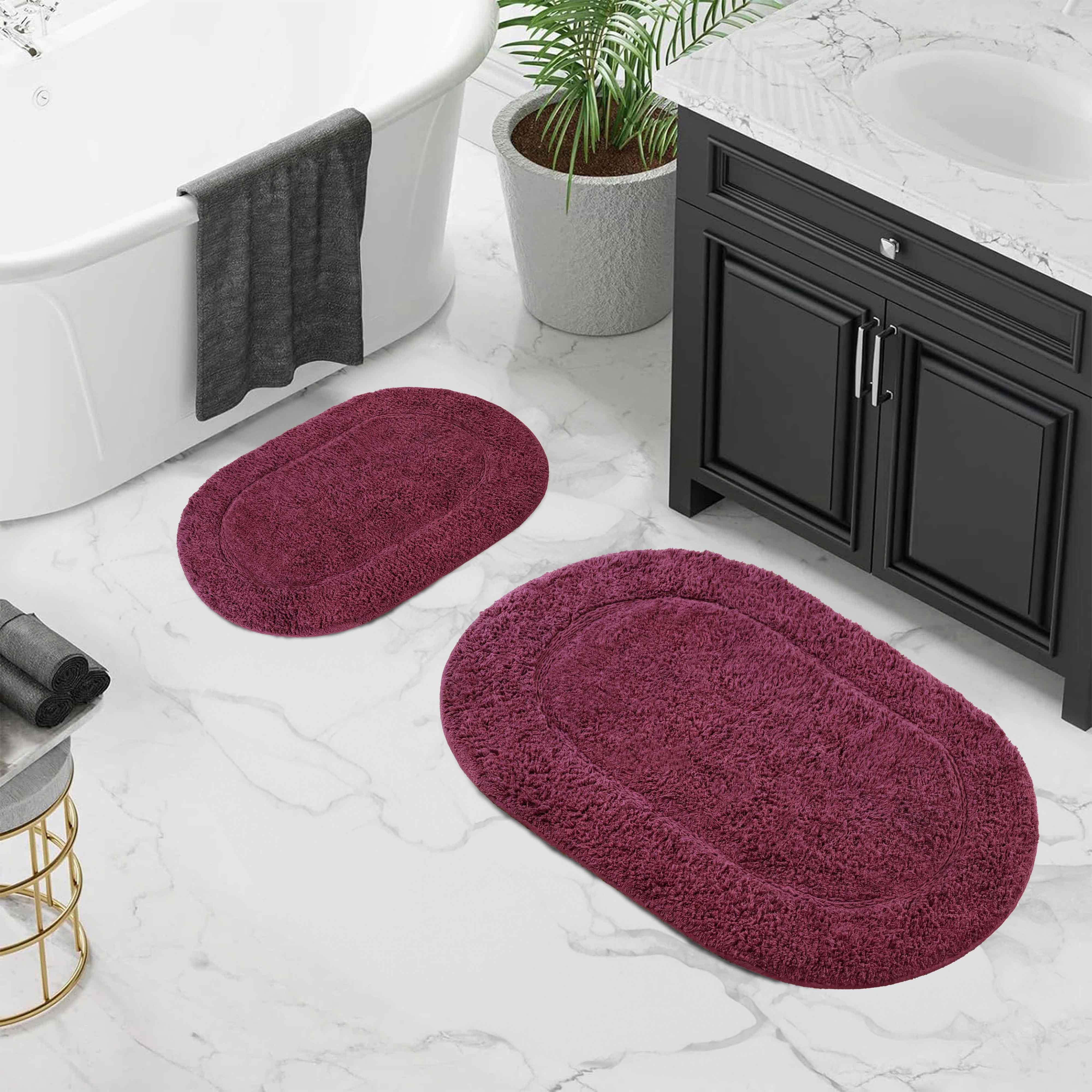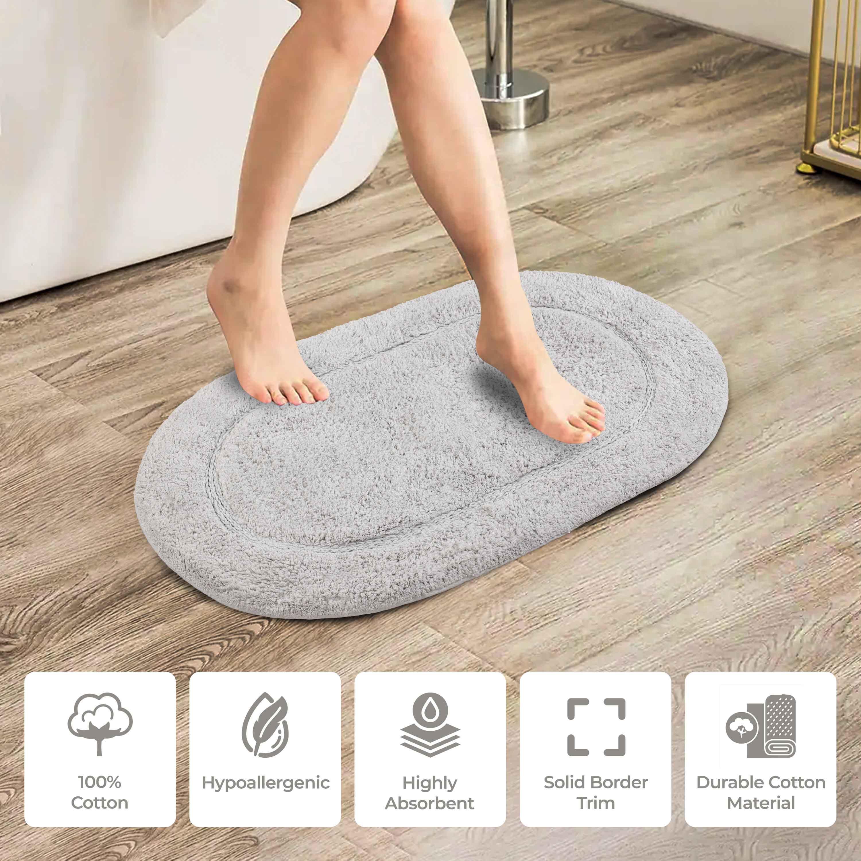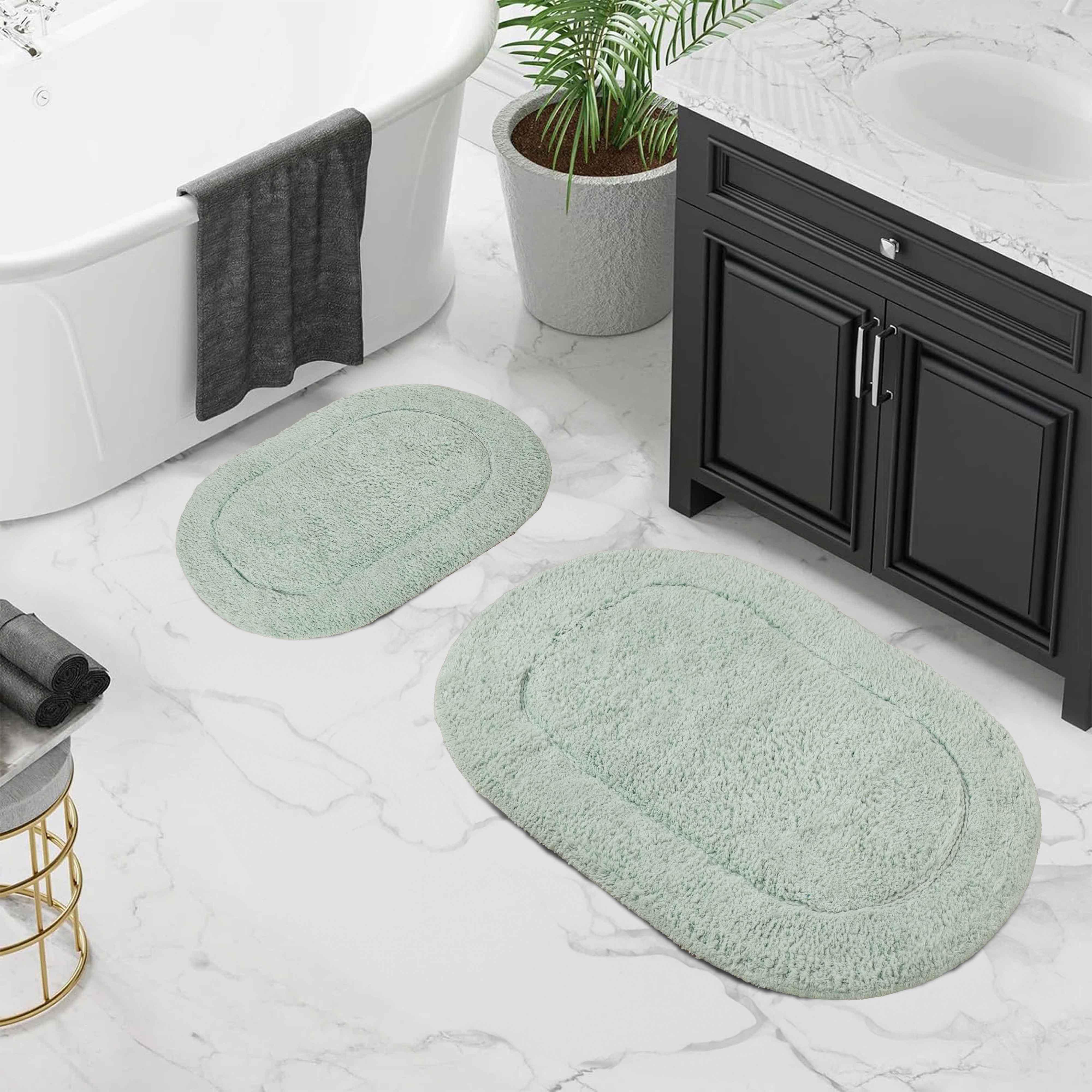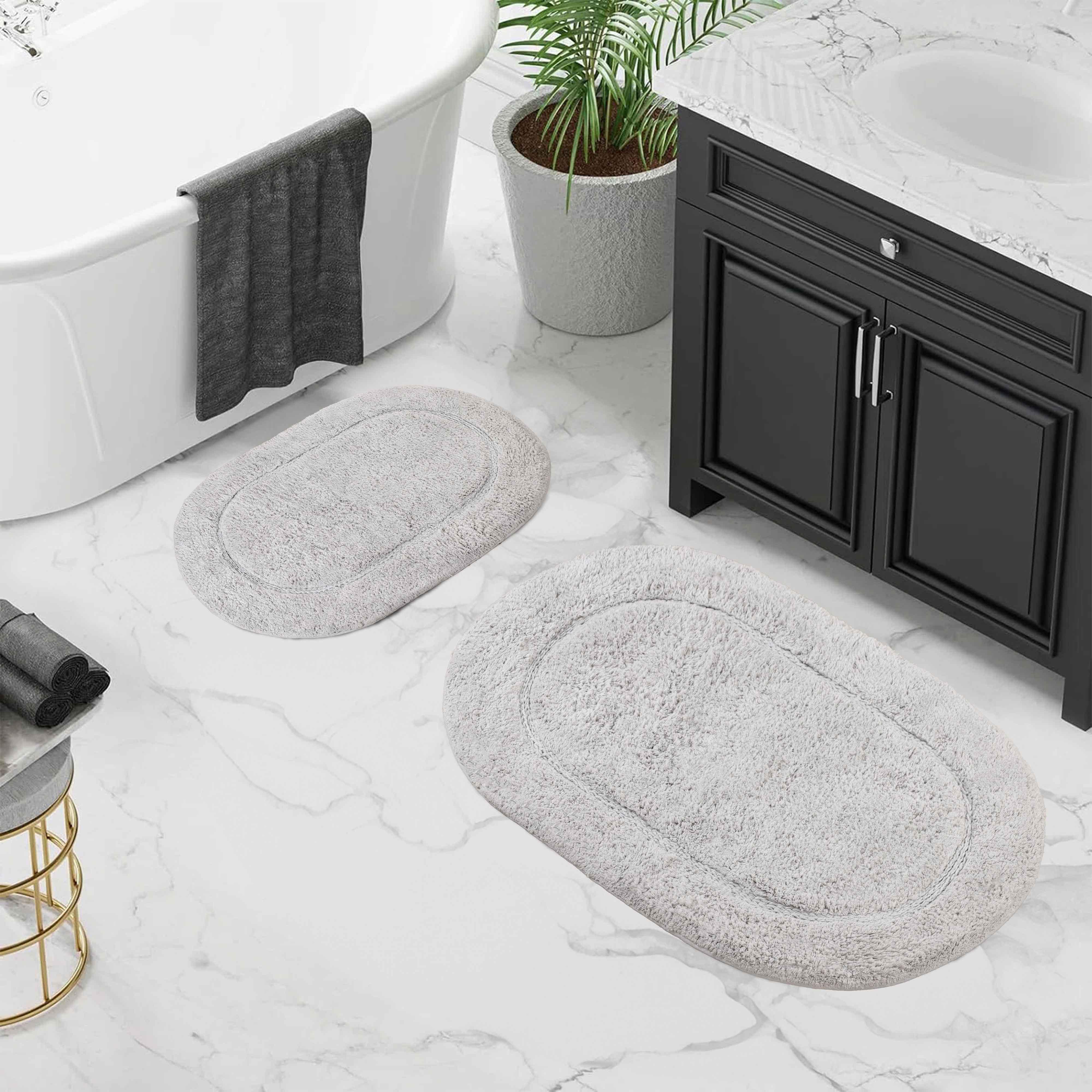 Upgrade your bathroom space with the Cotton Oval 2 Piece Bath Rug Set. Crafted from durable cotton fabric, this bath rug feels comfortable underfoot, giving you a spa-worthy experience. The non-slip latex backing keeps your rug from shifting or sliding. As an elegant accent, this oval bath rug features a solid border trim. Perfect for any shower space, the solid color design allows for easy pairing with a variety of bathroom decor styles. Available in two different sizes, place the larger rug outside your tub and the smaller rug in front of the sink for a tailored finish to your bathroom. This rug set is also OEKO-TEX certified, meaning it does not contain any harmful substances or chemicals, ensuring quality, comfort, and wellness.