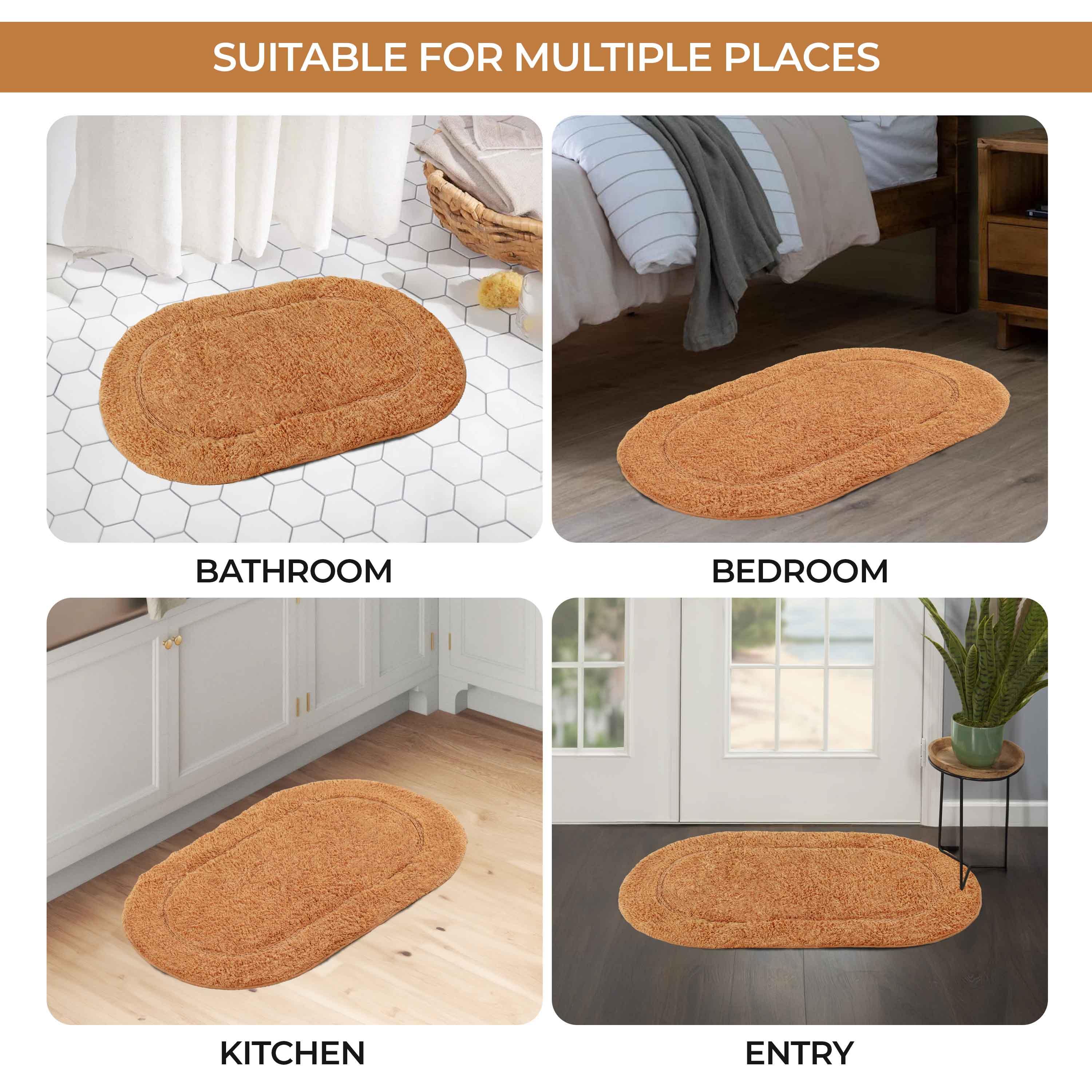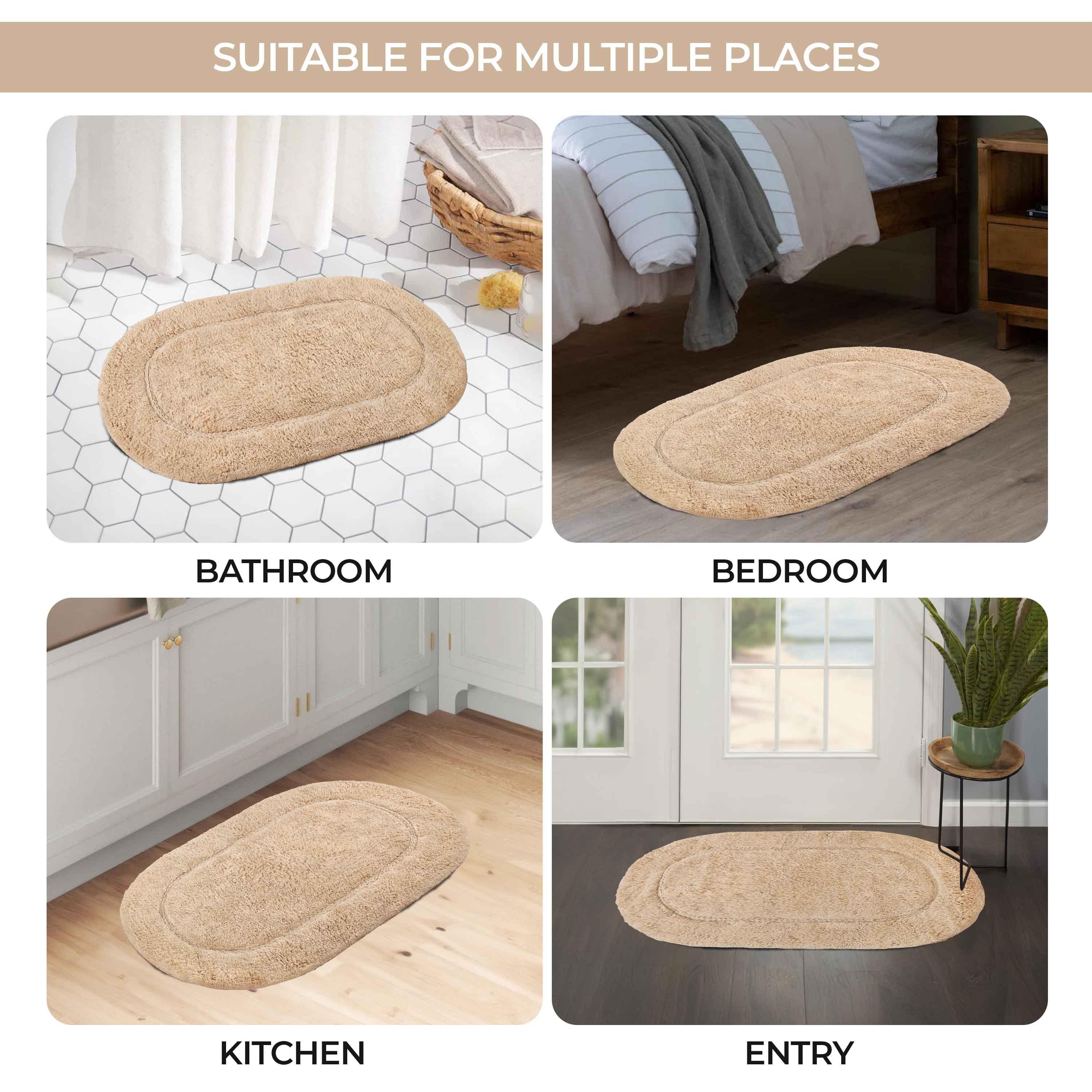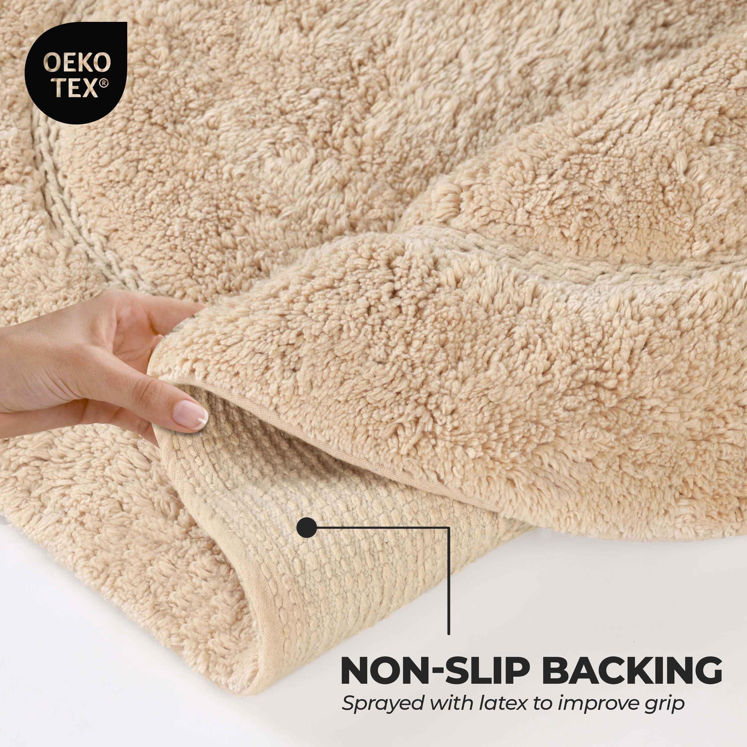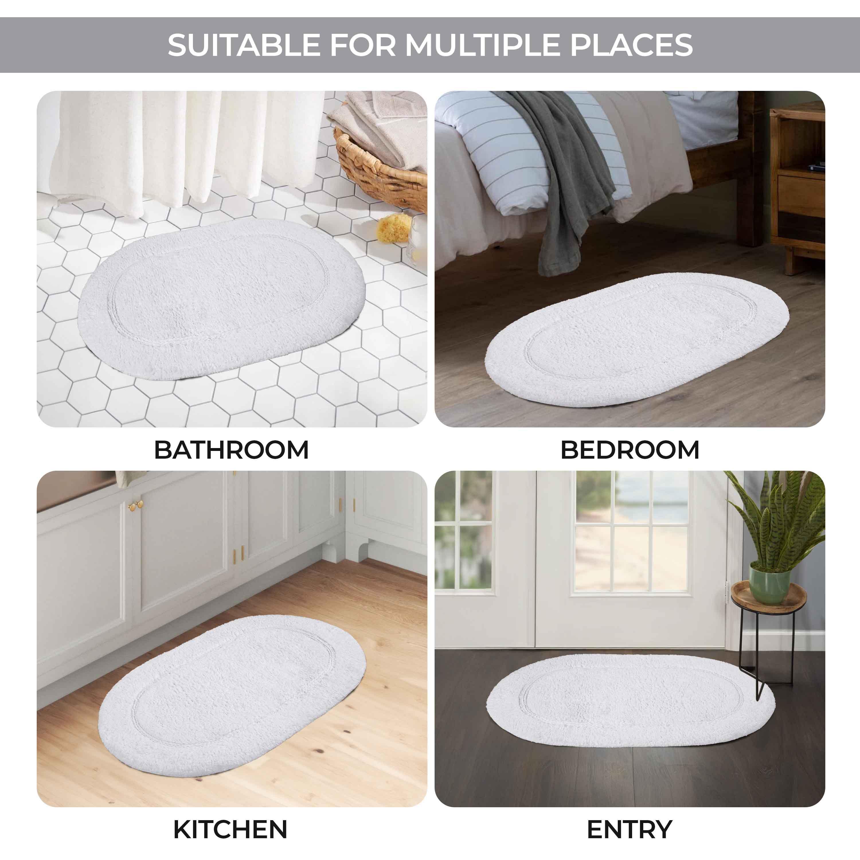 Upgrade your bathroom space with the Cotton Oval 2 Piece Bath Rug Set. Crafted from durable cotton fabric, this bath rug feels comfortable underfoot, giving you a spa-worthy experience. The non-slip latex backing keeps your rug from shifting or sliding. As an elegant accent, this oval bath rug features a solid border trim. Perfect for any shower space, the solid color design allows for easy pairing with a variety of bathroom decor styles. Available in two different sizes, place the larger rug outside your tub and the smaller rug in front of the sink for a tailored finish to your bathroom. This rug set is also OEKO-TEX certified, meaning it does not contain any harmful substances or chemicals, ensuring quality, comfort, and wellness.