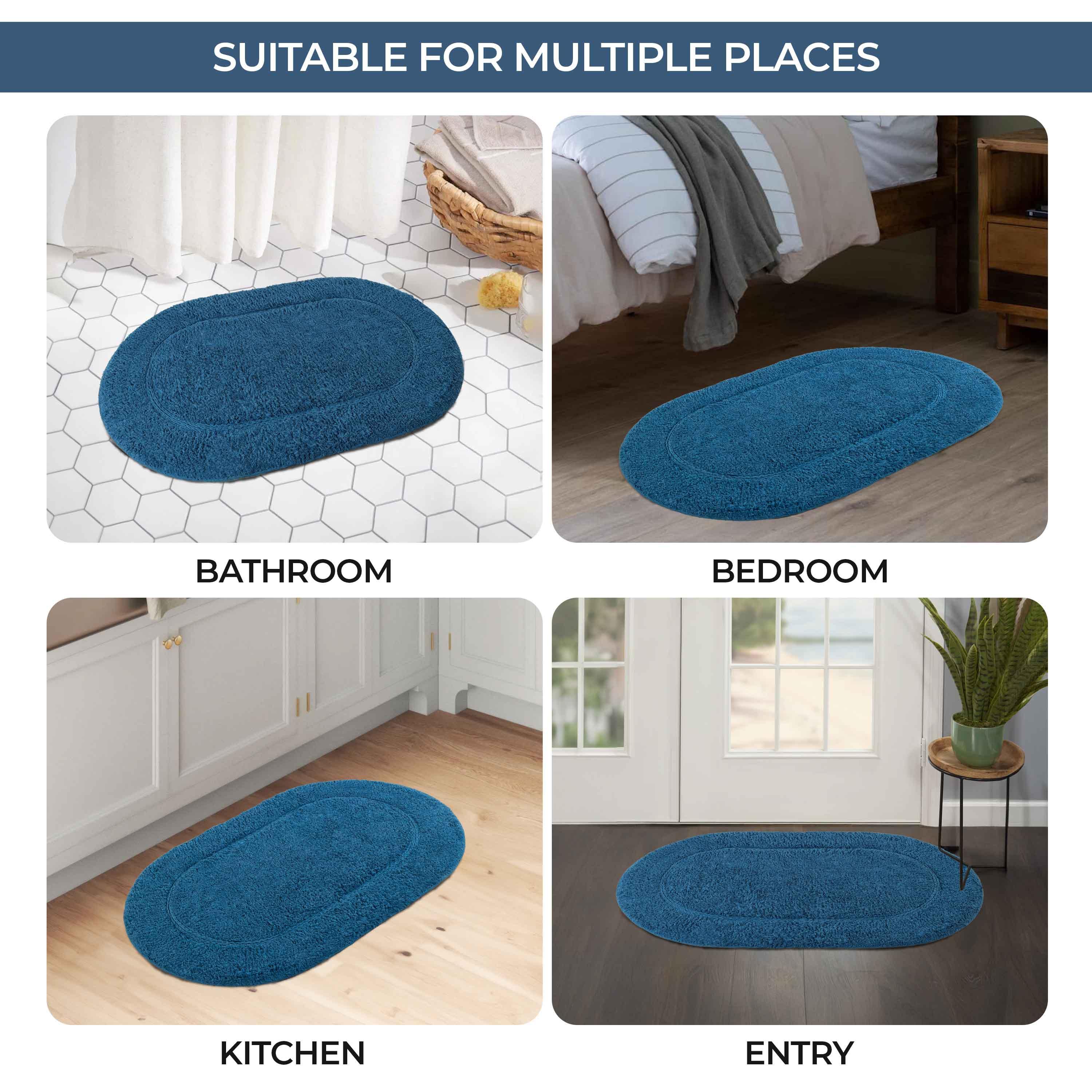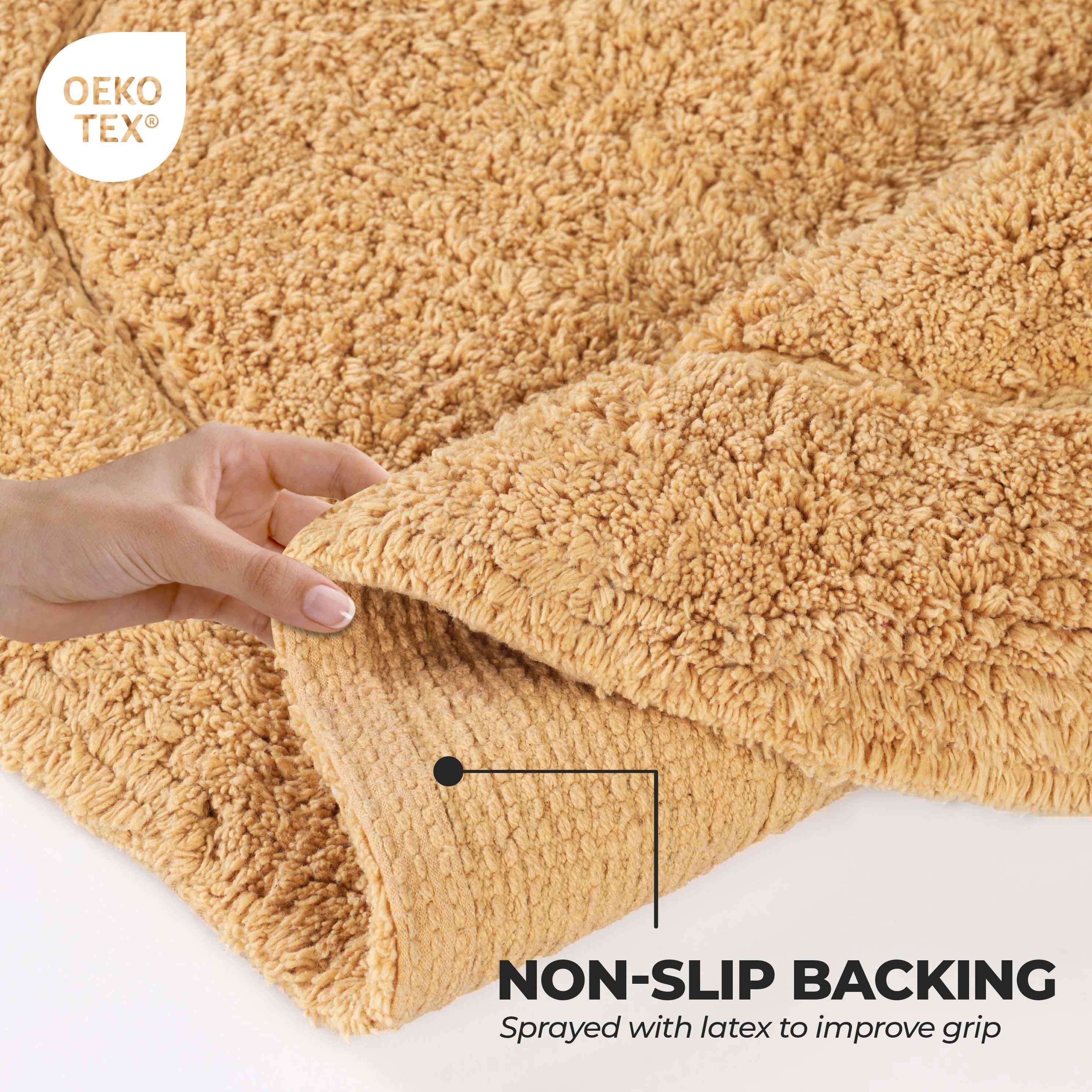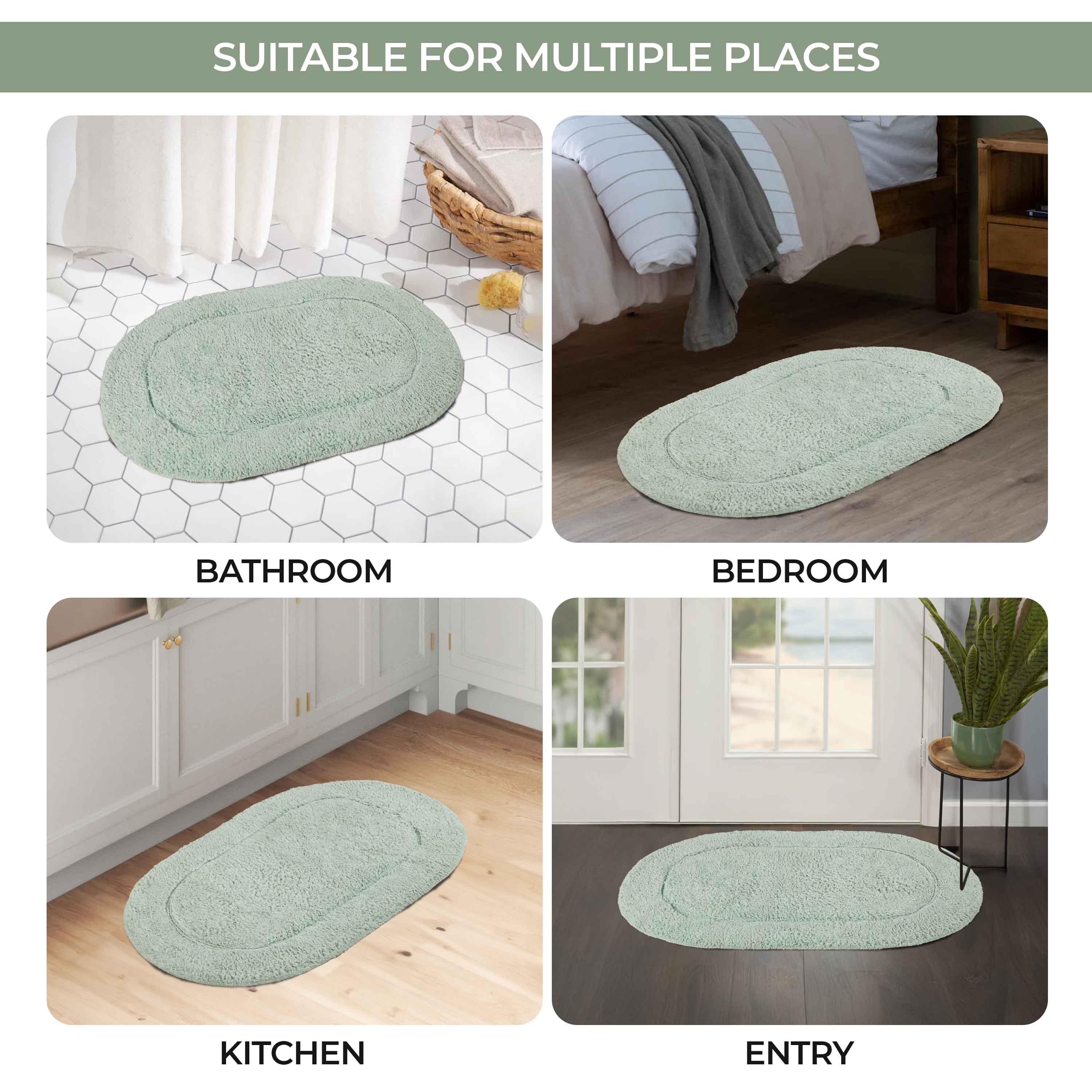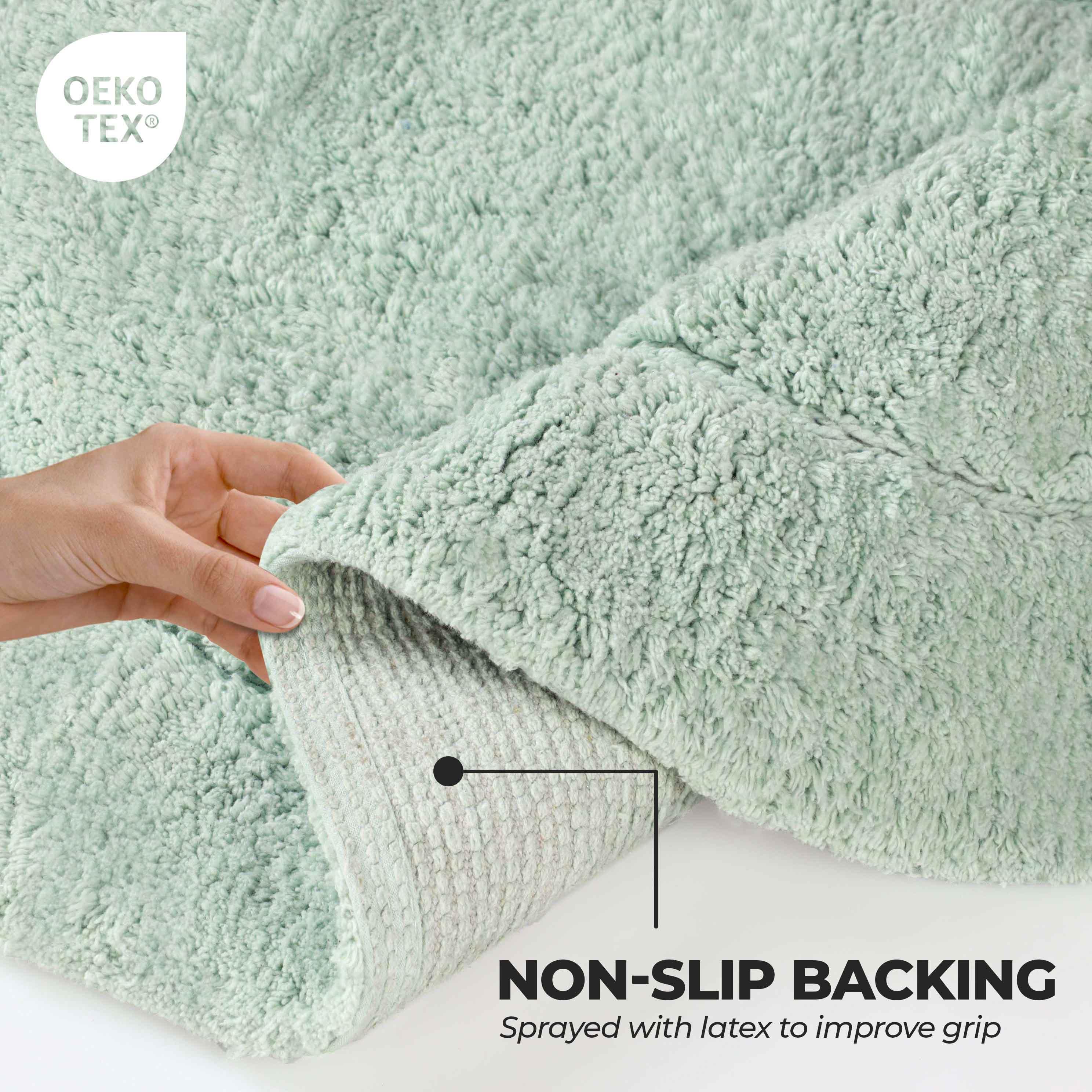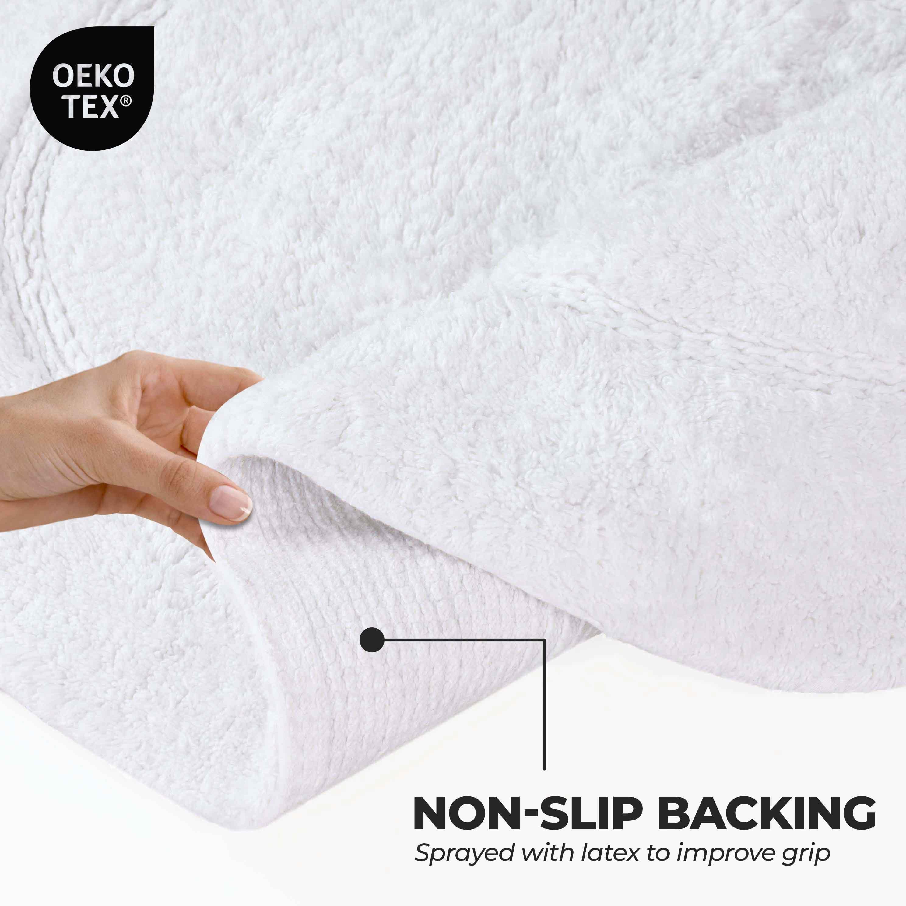 Upgrade your bathroom space with the Cotton Oval 2 Piece Bath Rug Set. Crafted from durable cotton fabric, this bath rug feels comfortable underfoot, giving you a spa-worthy experience. The non-slip latex backing keeps your rug from shifting or sliding. As an elegant accent, this oval bath rug features a solid border trim. Perfect for any shower space, the solid color design allows for easy pairing with a variety of bathroom decor styles. Available in two different sizes, place the larger rug outside your tub and the smaller rug in front of the sink for a tailored finish to your bathroom. This rug set is also OEKO-TEX certified, meaning it does not contain any harmful substances or chemicals, ensuring quality, comfort, and wellness.