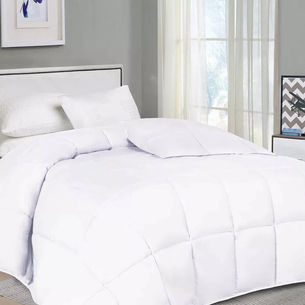 Take your dreams to new levels when you snuggle into bed with the Superior Bedroom Basics Set. Get everything your bedroom needs all in one bundle with this stress-free bedding set. This bundle of room essentials includes; one full/ queen comforter, one queen mattress protector, and two standard pillows. Perfect for daily use, create a dreamy foundation for your bed with these soothing bedding necessities. Featuring extra soft brushed microfiber, down alternative, and cotton materials, each piece in this set adds an irresistible touch of luxury charm to your bed. Displaying a solid pattern and coordinating white color, this set gives your bedroom a refreshing update in an instant. Transform your bedroom into a luxurious haven with this stylish and practical set of bedding essentials.