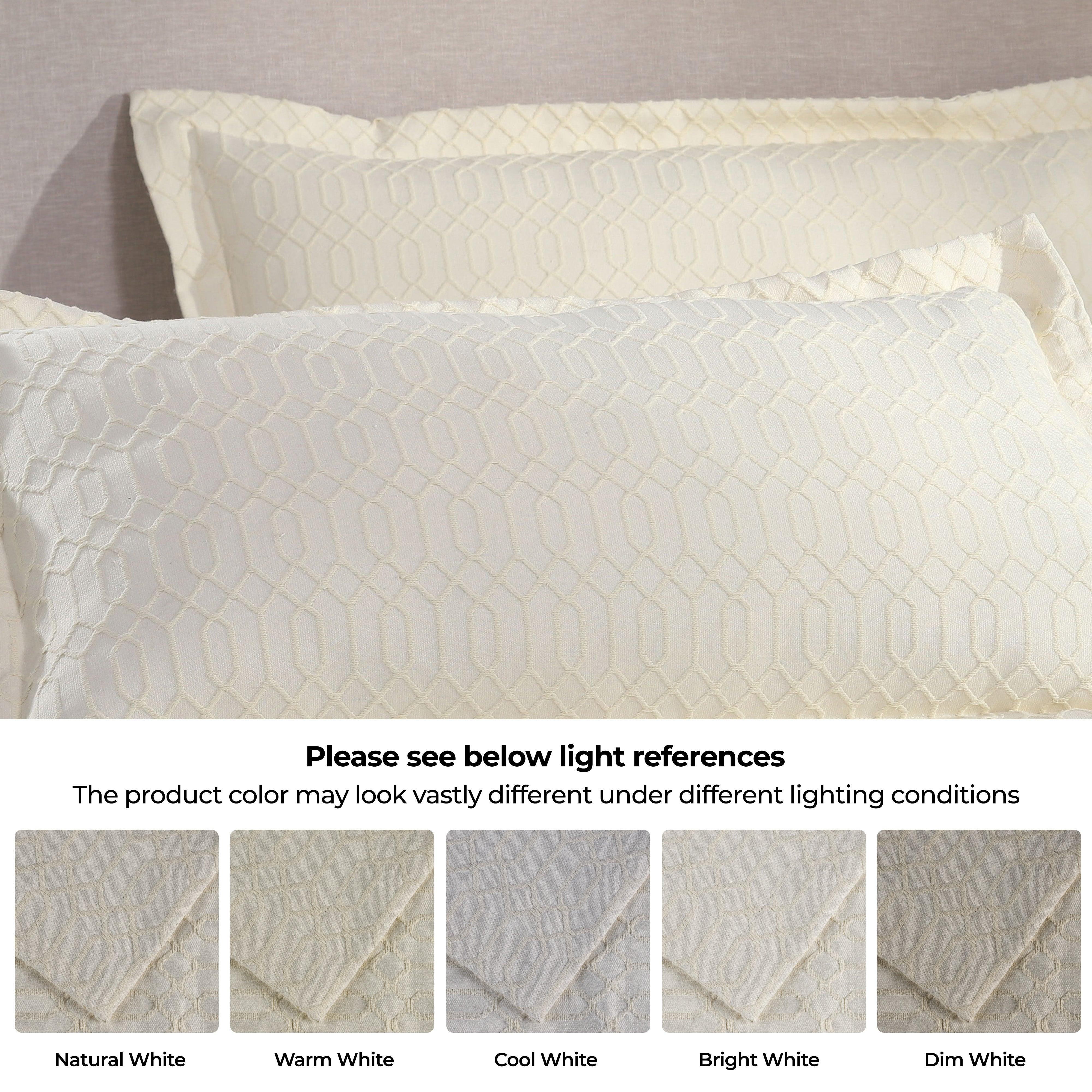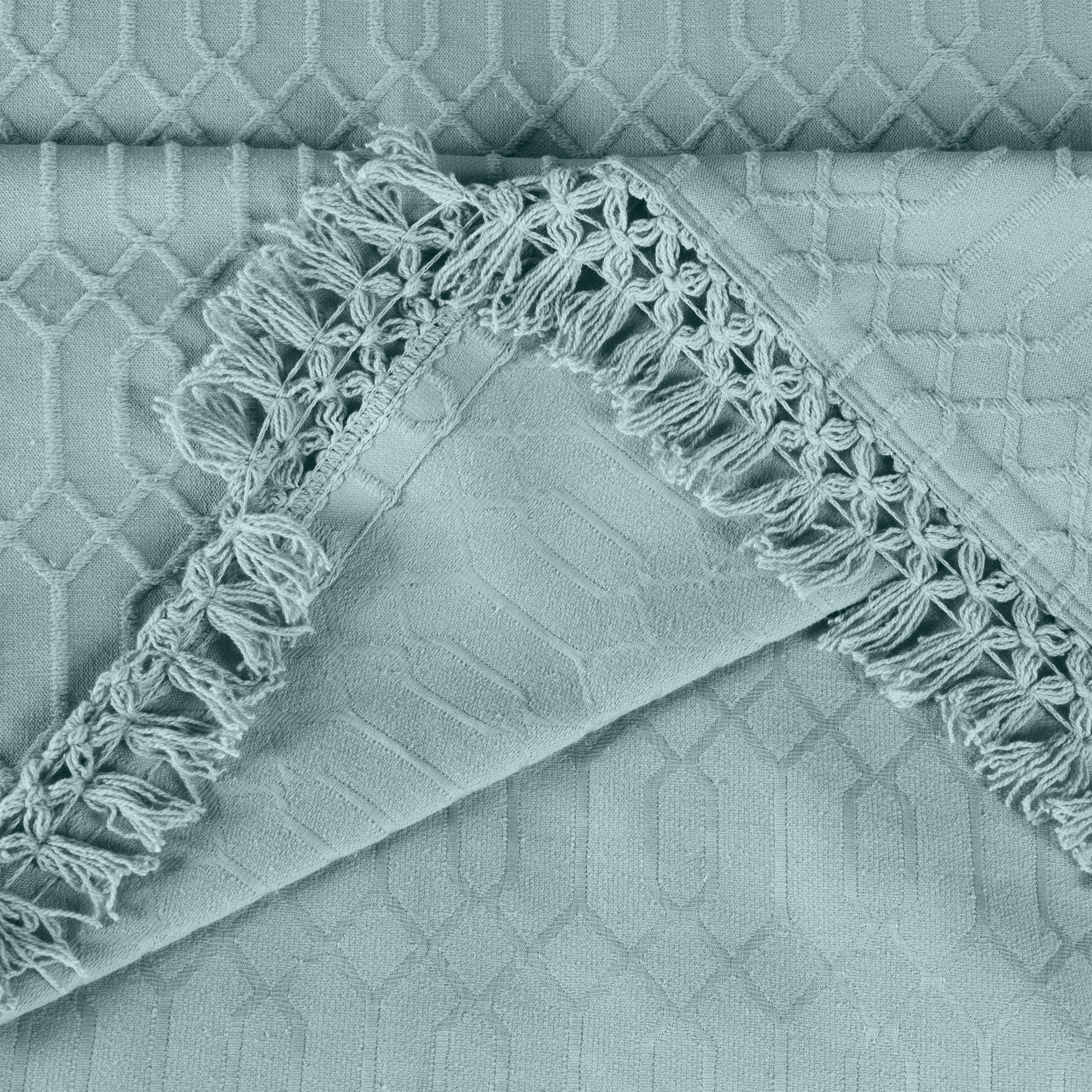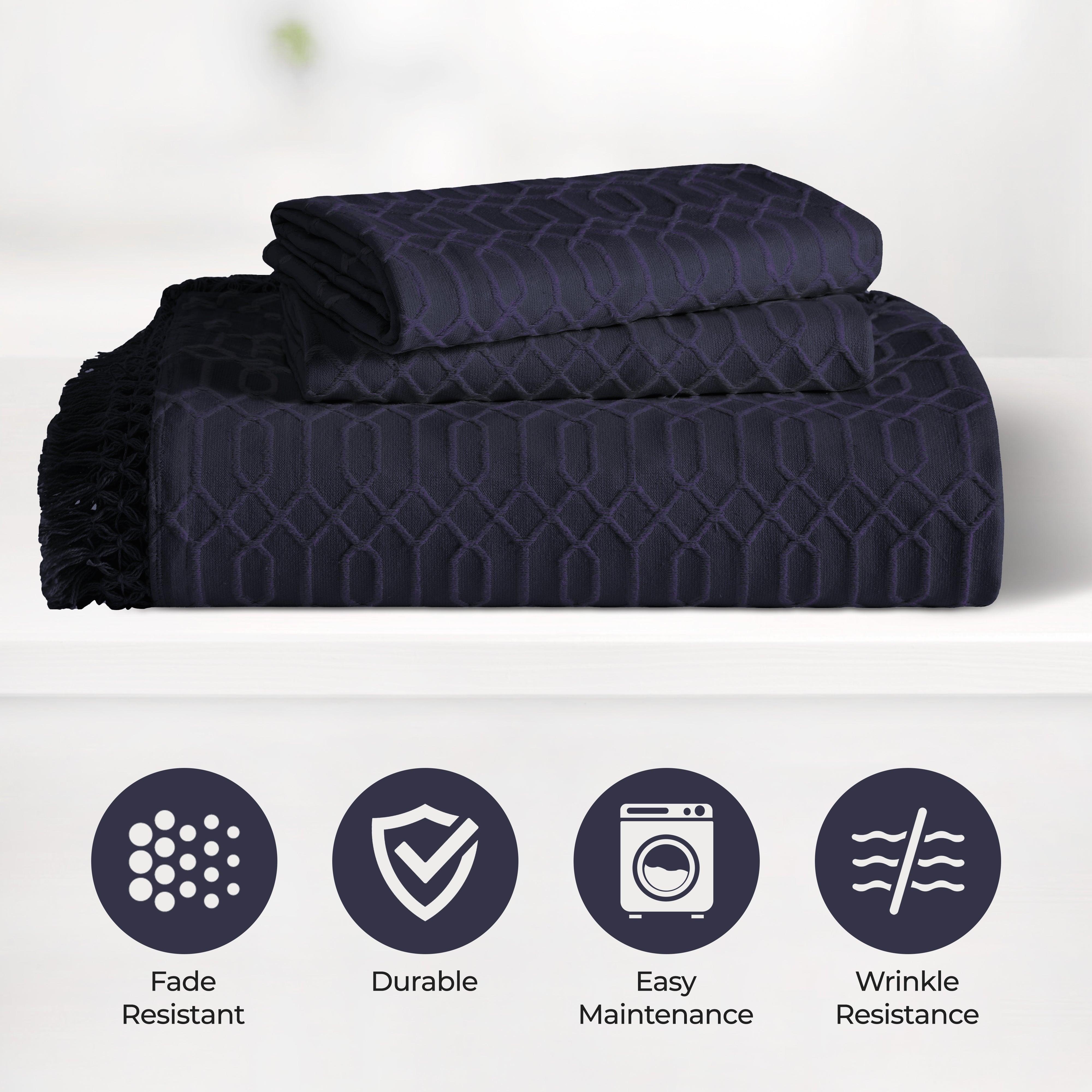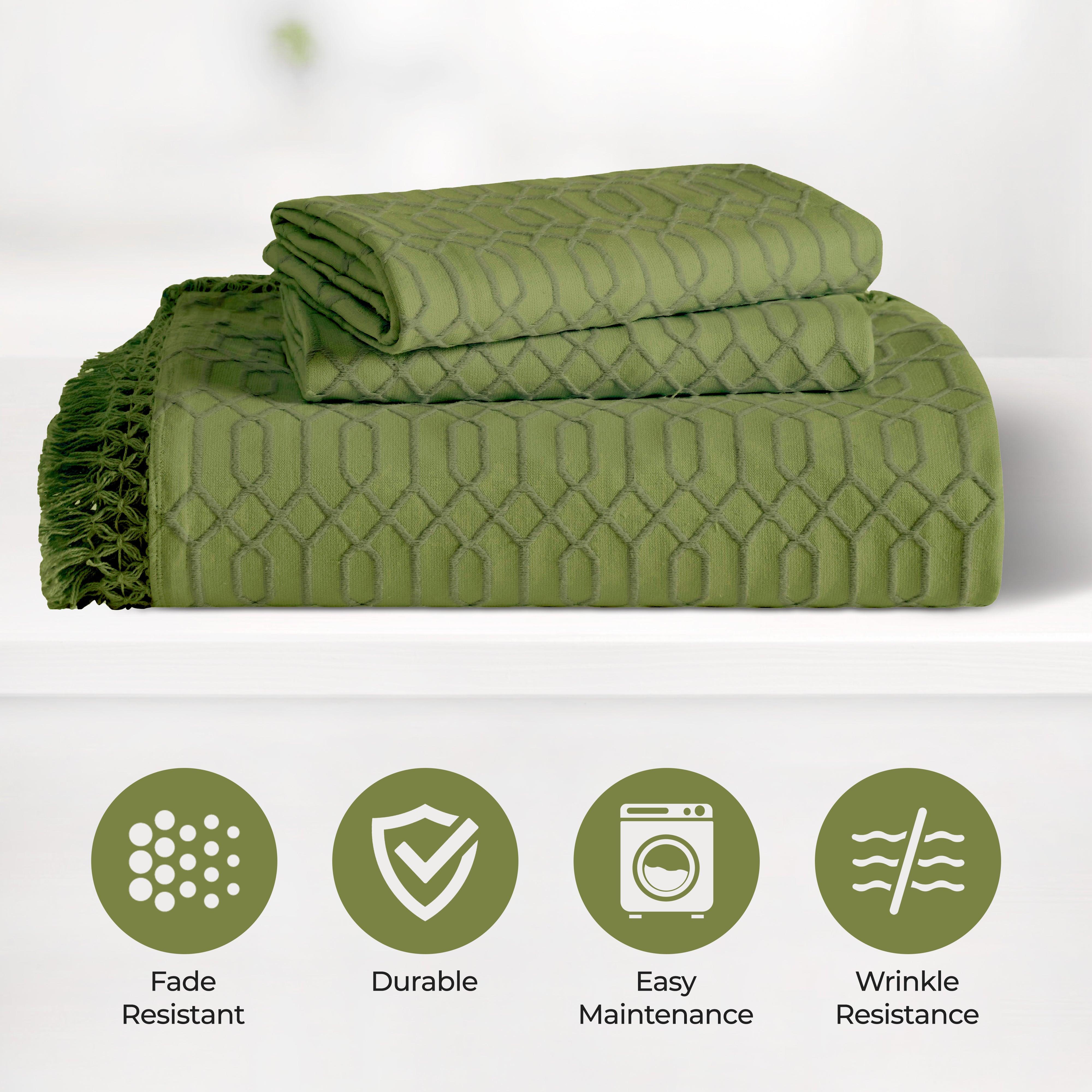 Experience the perfect blend of comfort and style with the Superior Remi Bedspread and Sham Set. Crafted from a premium blend of Cotton and Polyester, this versatile set is medium-weight and breathable, perfect as an added layer or on its own. This beautifully jacquard woven set boasts a two-toned, geometric pattern to bring relaxed elegance to your modern or transitional bedroom. This gorgeous bundle includes 1 oversized bedspread that hangs to the floor, eliminating the need for a bed skirt, and 2 matching pillow shams (Twin size includes 1 pillow sham). Finished with a stylish fringe trim, updating the look of your modern or shabby chic bedroom has never been easier.