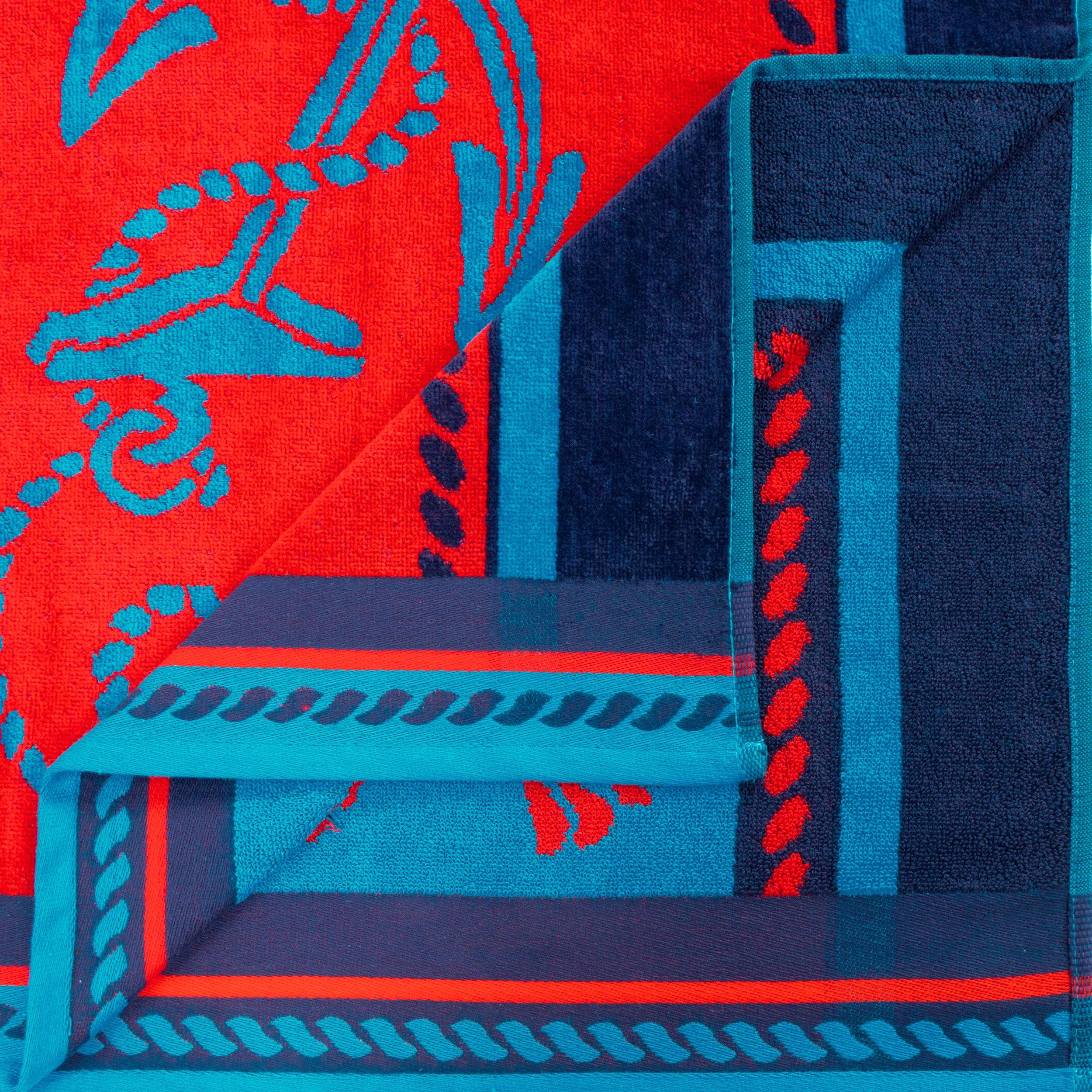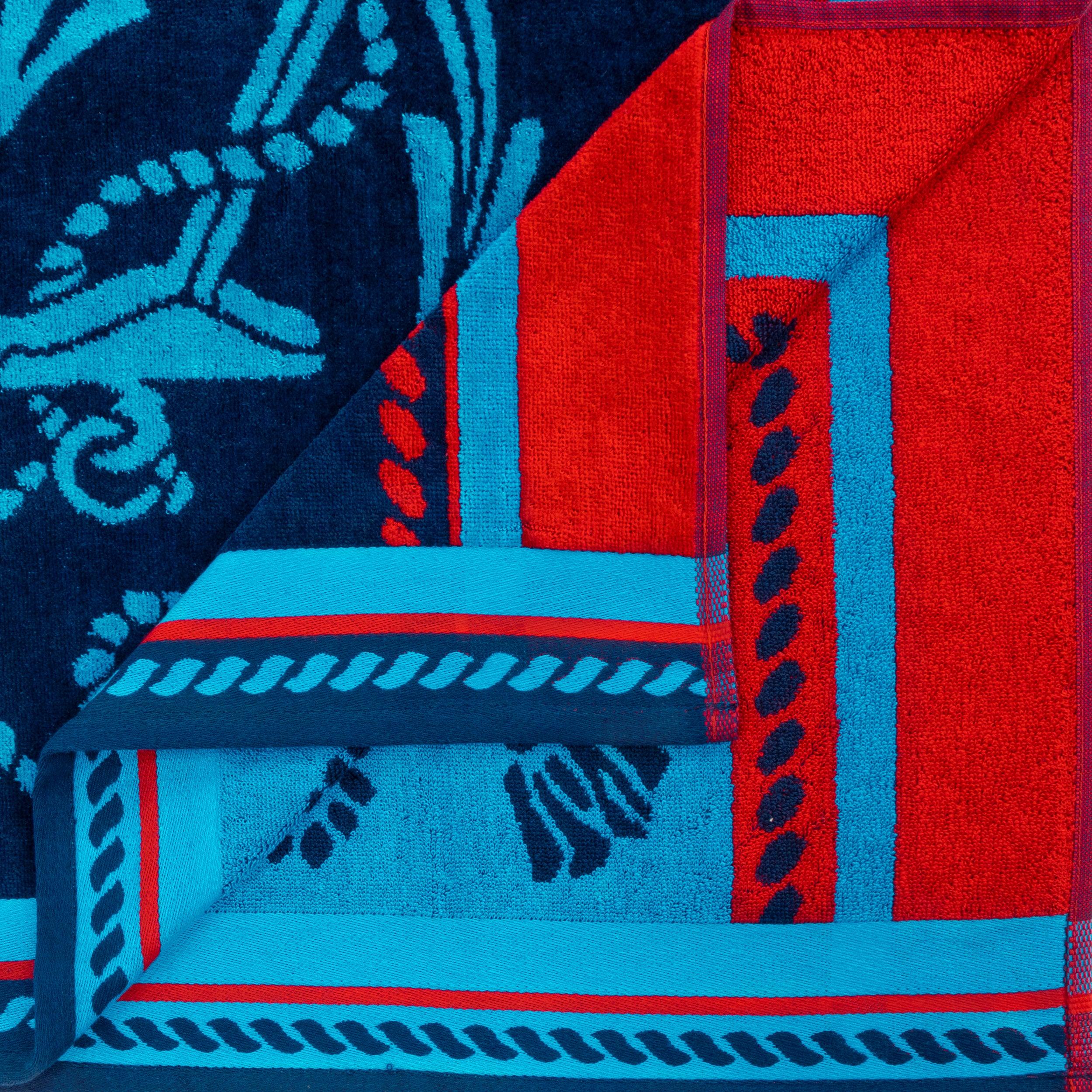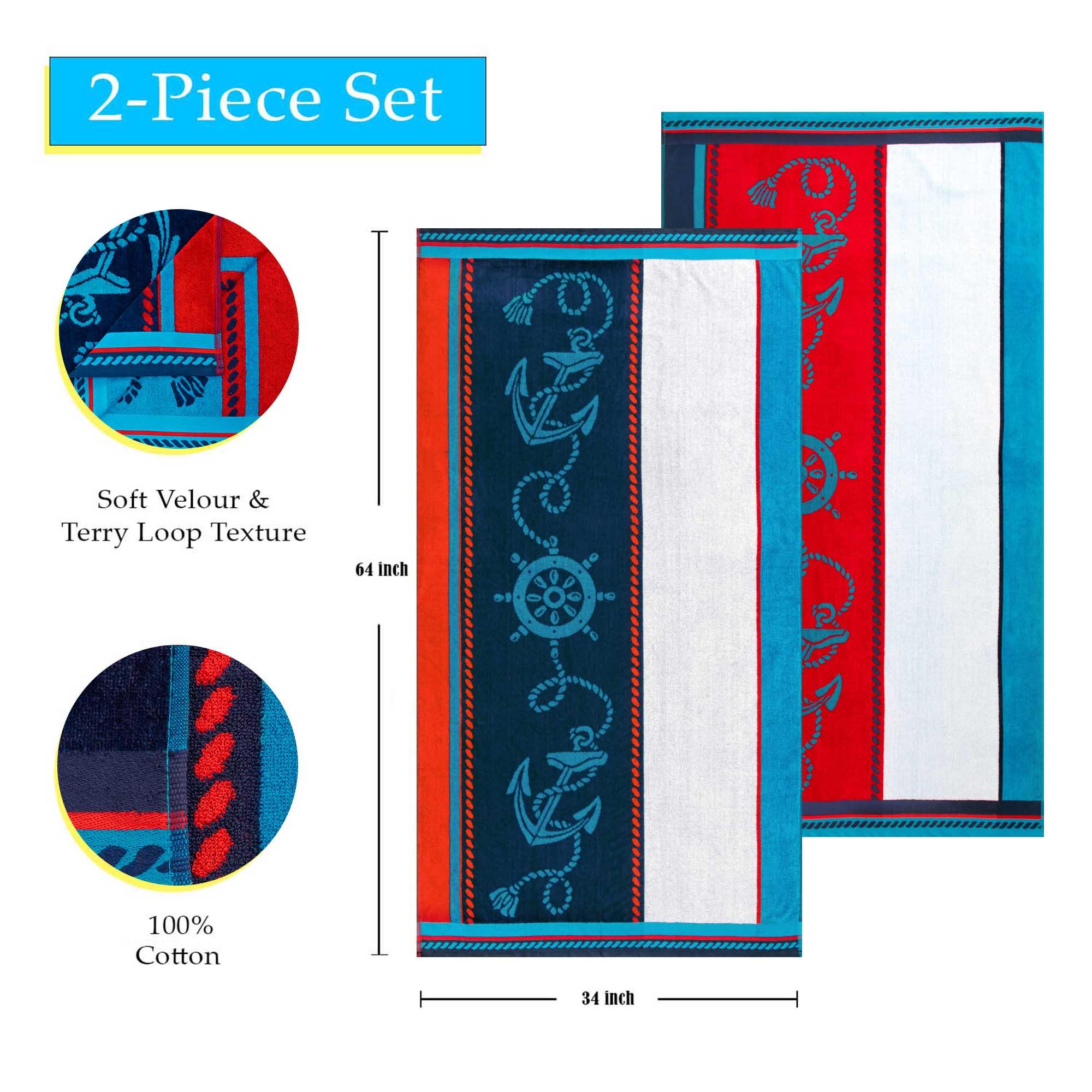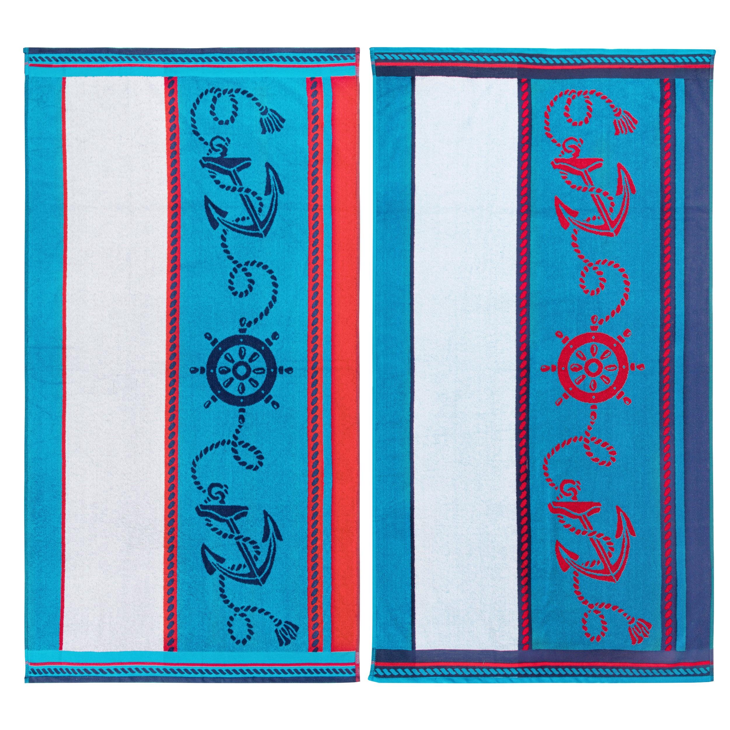 From poolside to beaches, the Superior Sailing Egyptian Cotton Oversized Beach Towel Set wraps you in ultrasoft comfort. Reminding you of sandy beaches and pristine ocean, this towel set perfectly features an adventurous ship wheel, a rooted anchor, and a thick rope motif. The velour front provides a soft surface for relaxing while the reverse side features a highly absorbent terry material to get you dry quickly. Lounge by the poolside or sunbathe at the beach with these towels with inverted designs for a unique yet matching duo. With optimal coverage and an impressive wrap, these Egyptian Cotton towels become softer with each wash allowing you and your family to enjoy for many years to come.