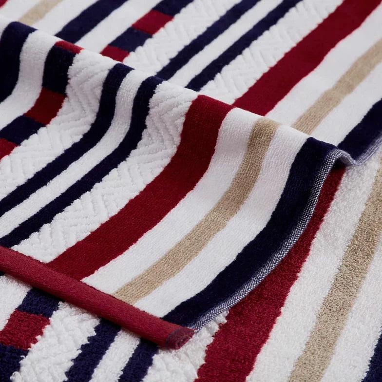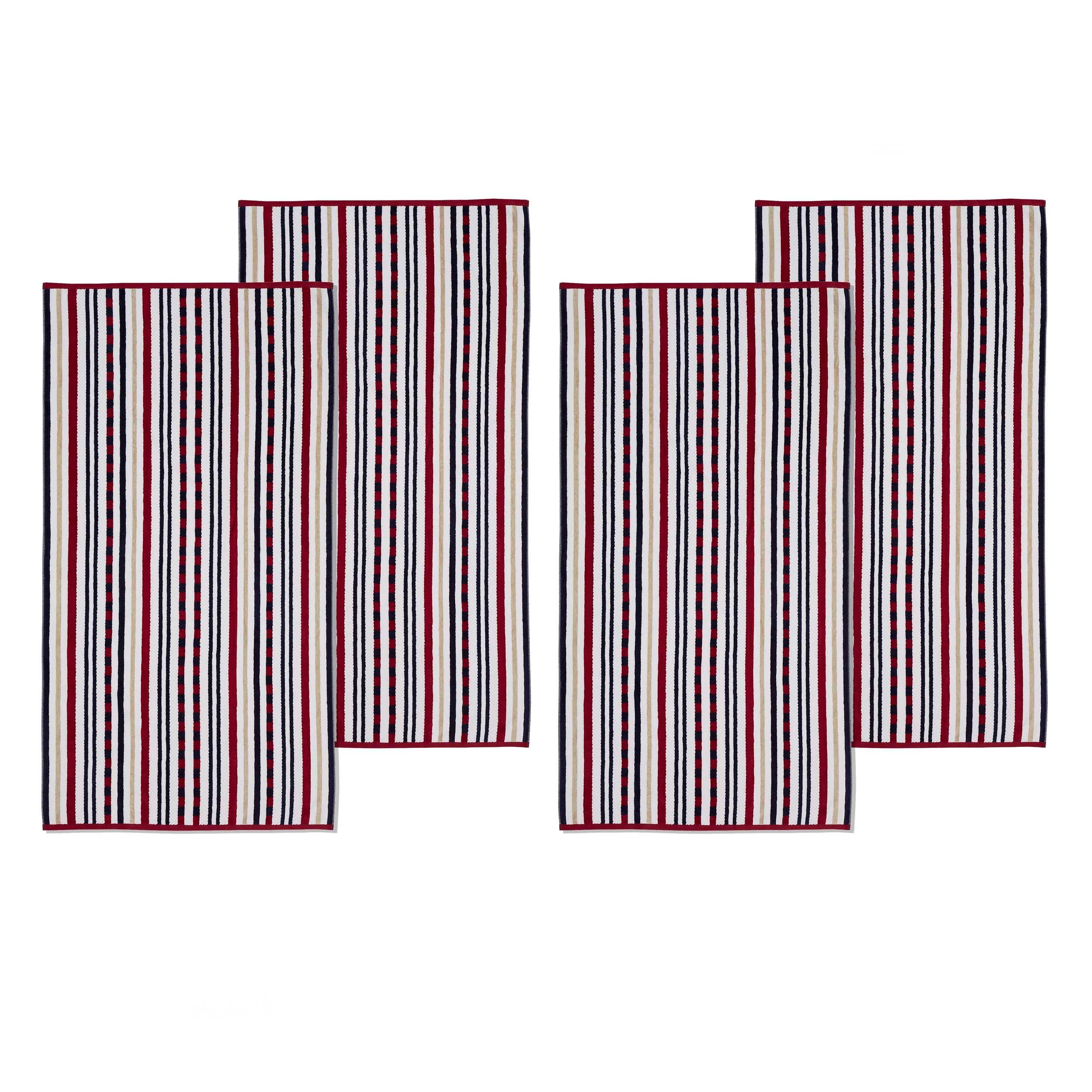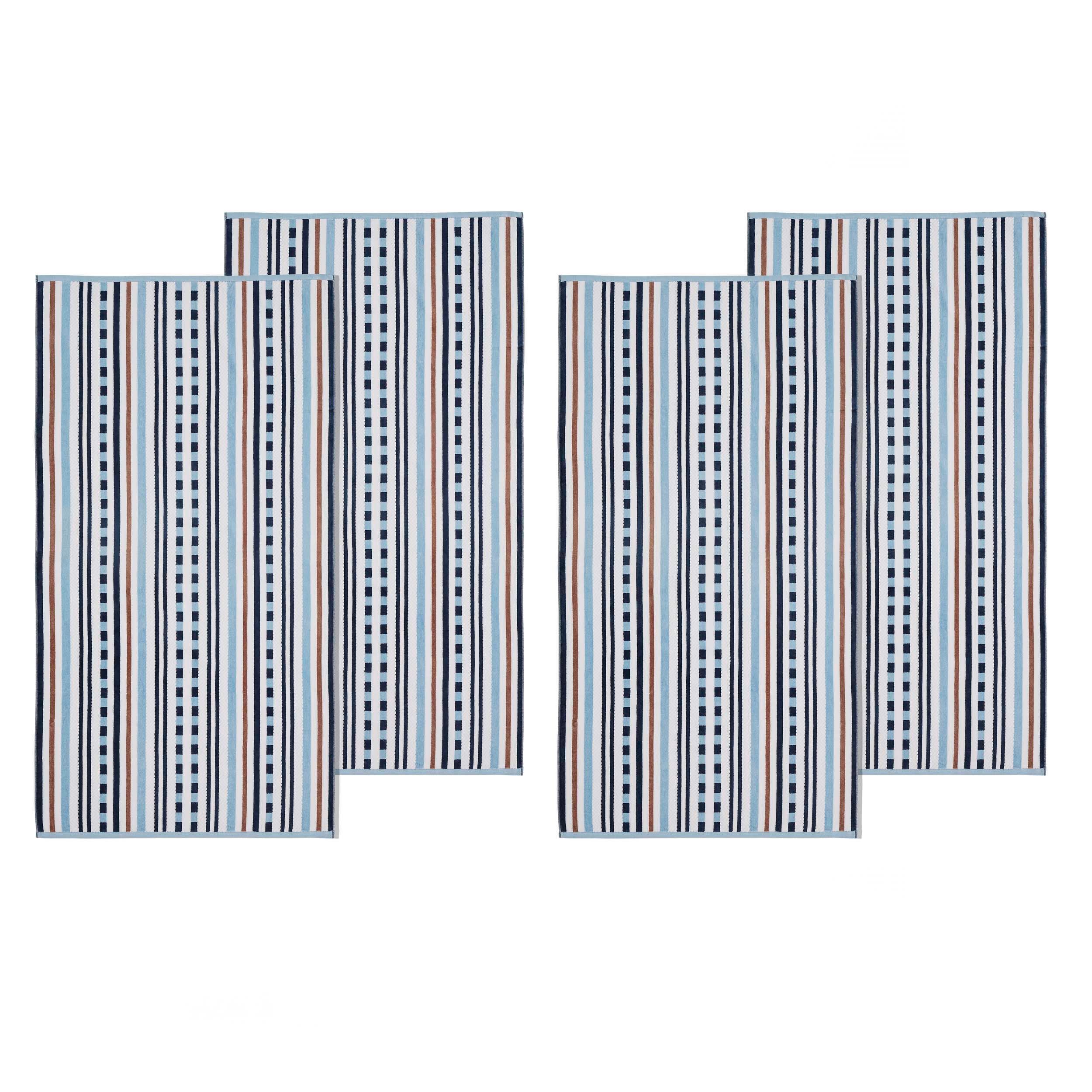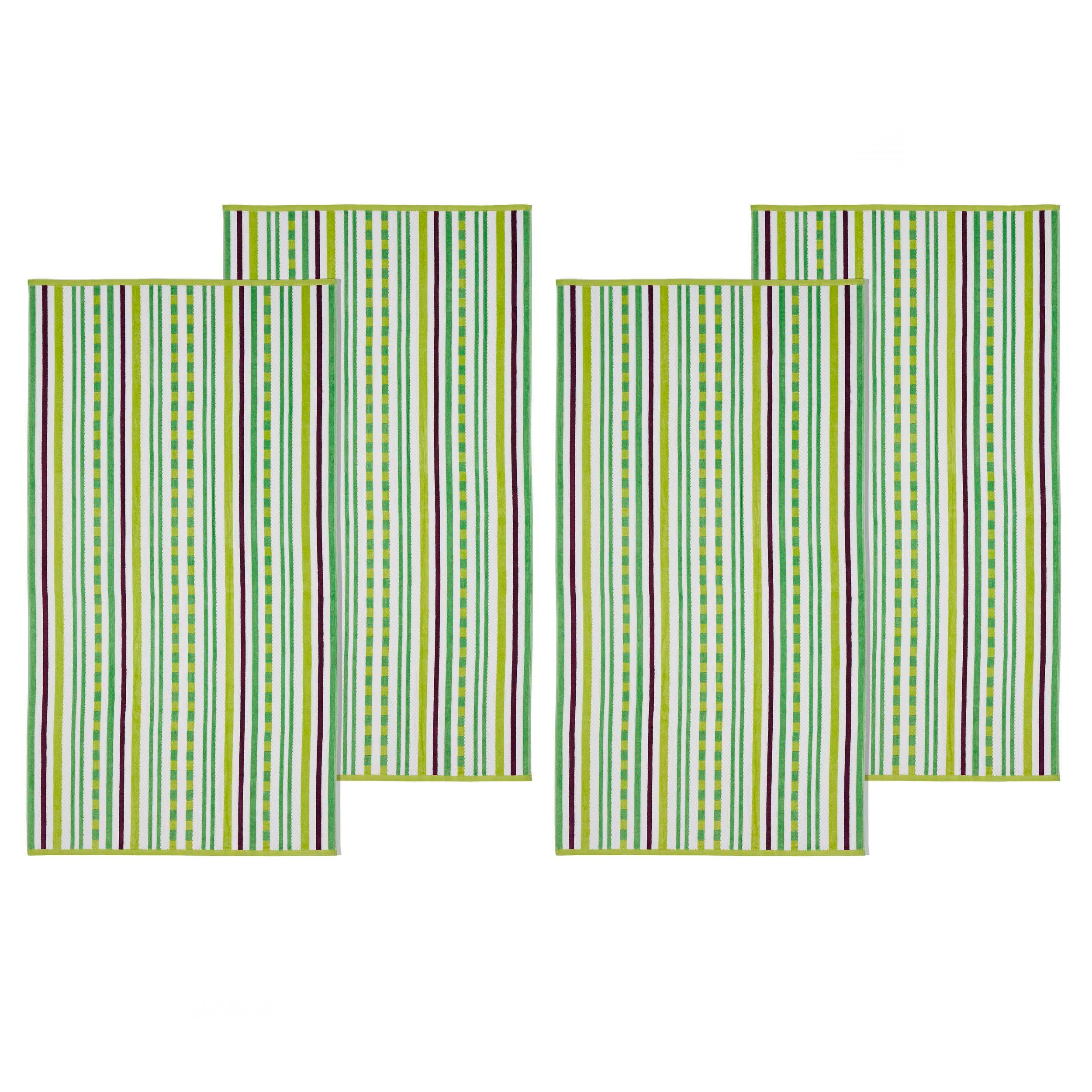 Make a splash this summer with the vibrant 4-piece Beach Towel Set. These oversized beach towels are crafted from Cotton with a high-quality 550 grams per square meter towel weight construction to offer a smooth, comfy surface for lounging. Perfect for all your aquatic activities, this geometric and stripe design features a raised chevron texture that is available in an array of bright, seasonable color options. Each set features a reverse, color combination design with a soft velour on one side and a highly absorbent terry loop texture on the other to get you dry quickly.