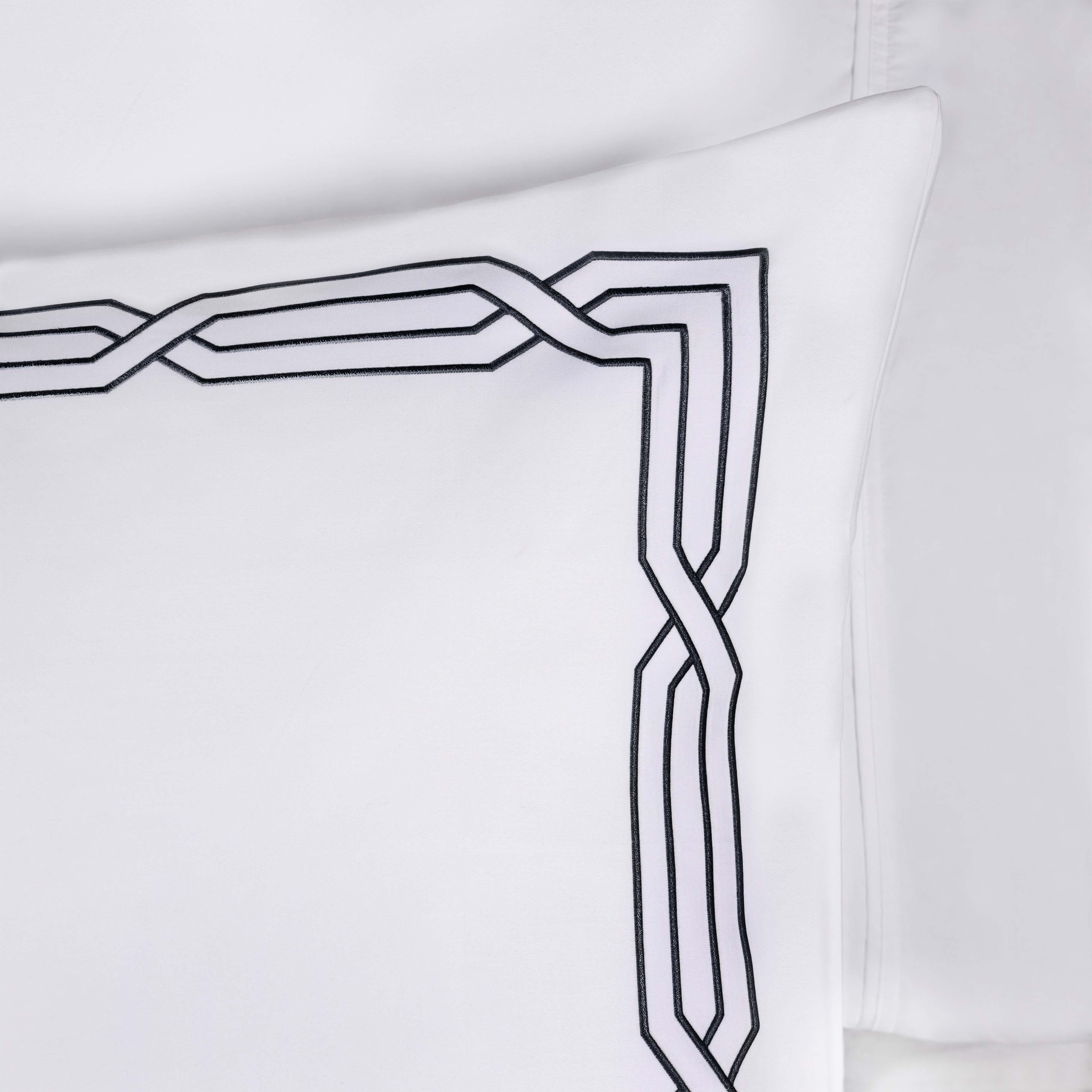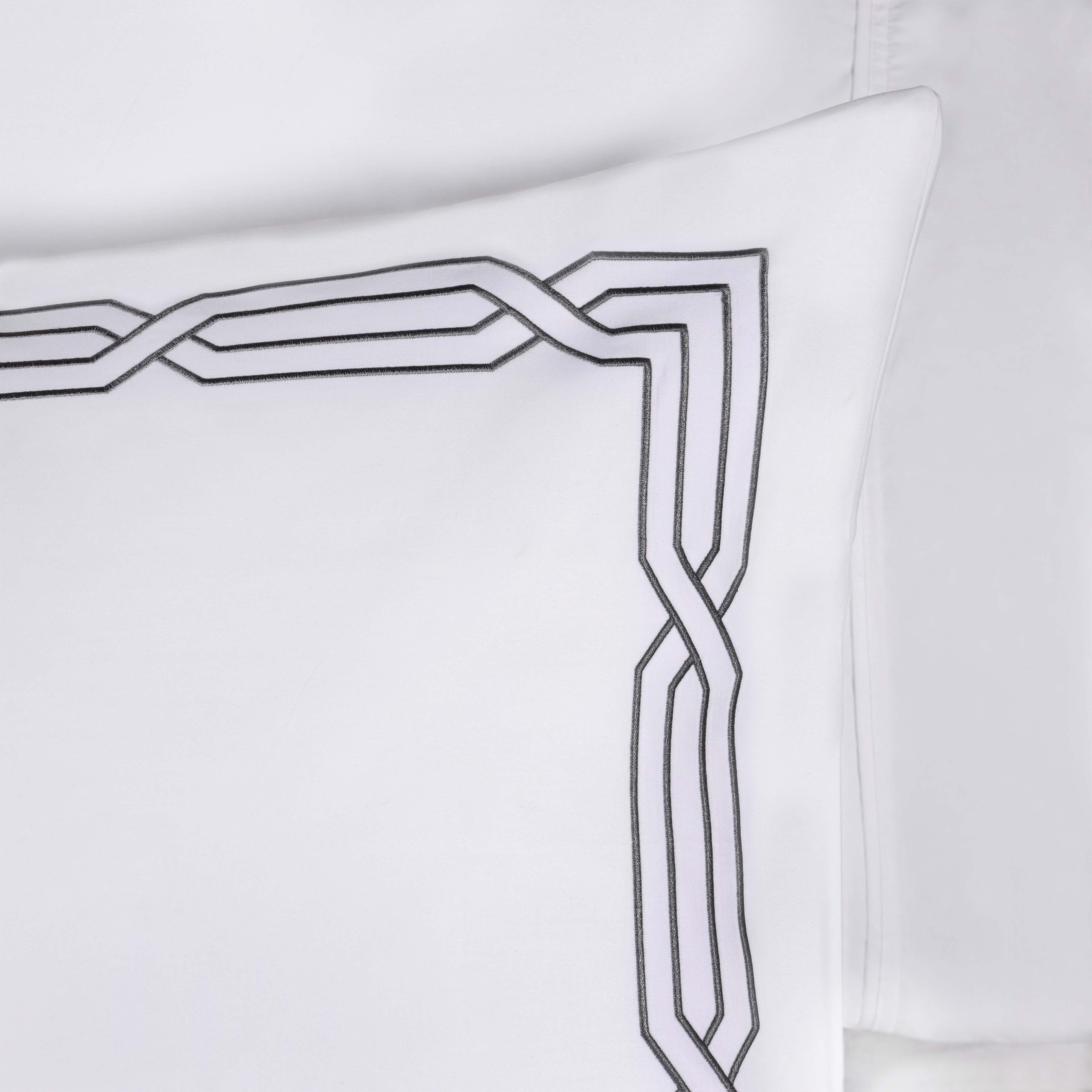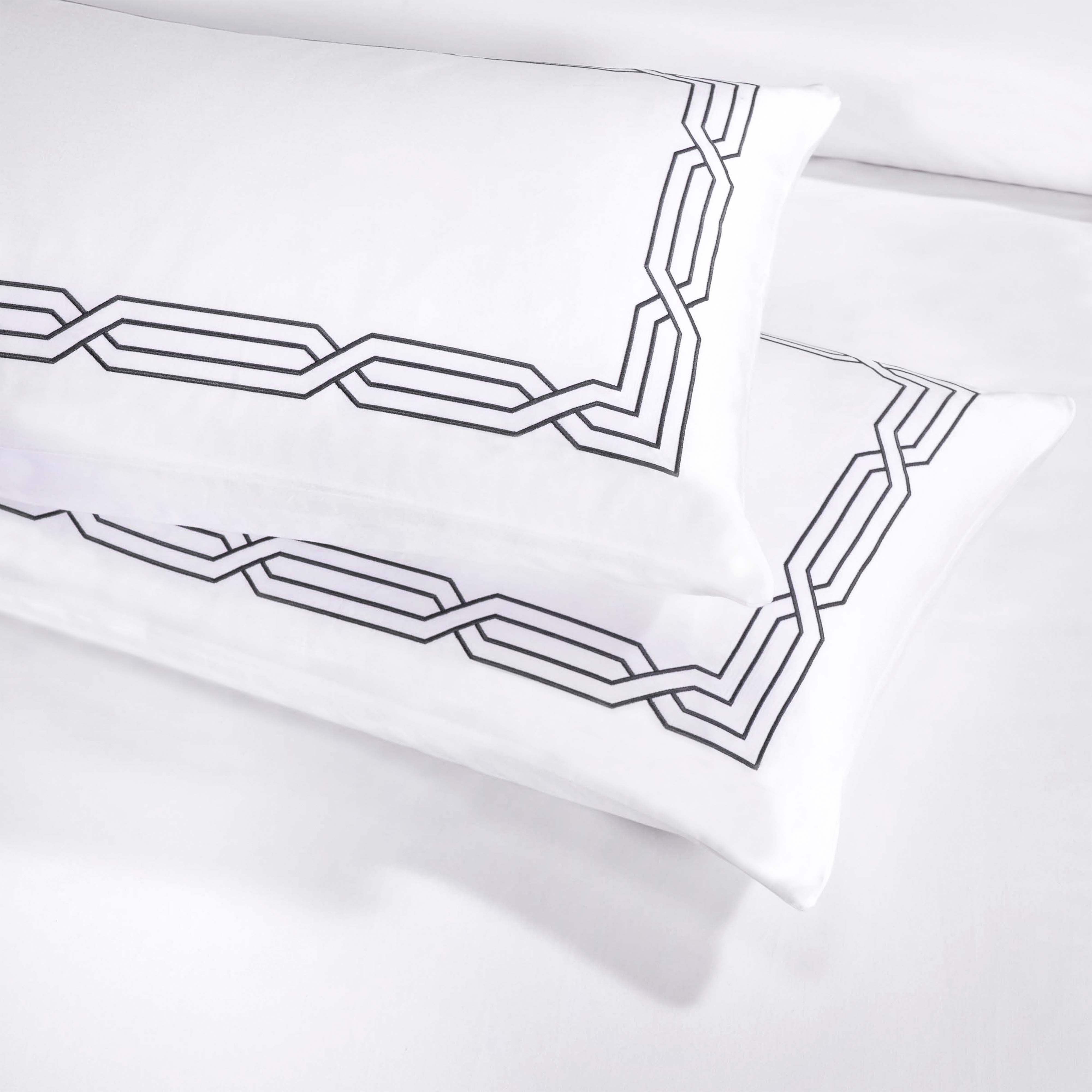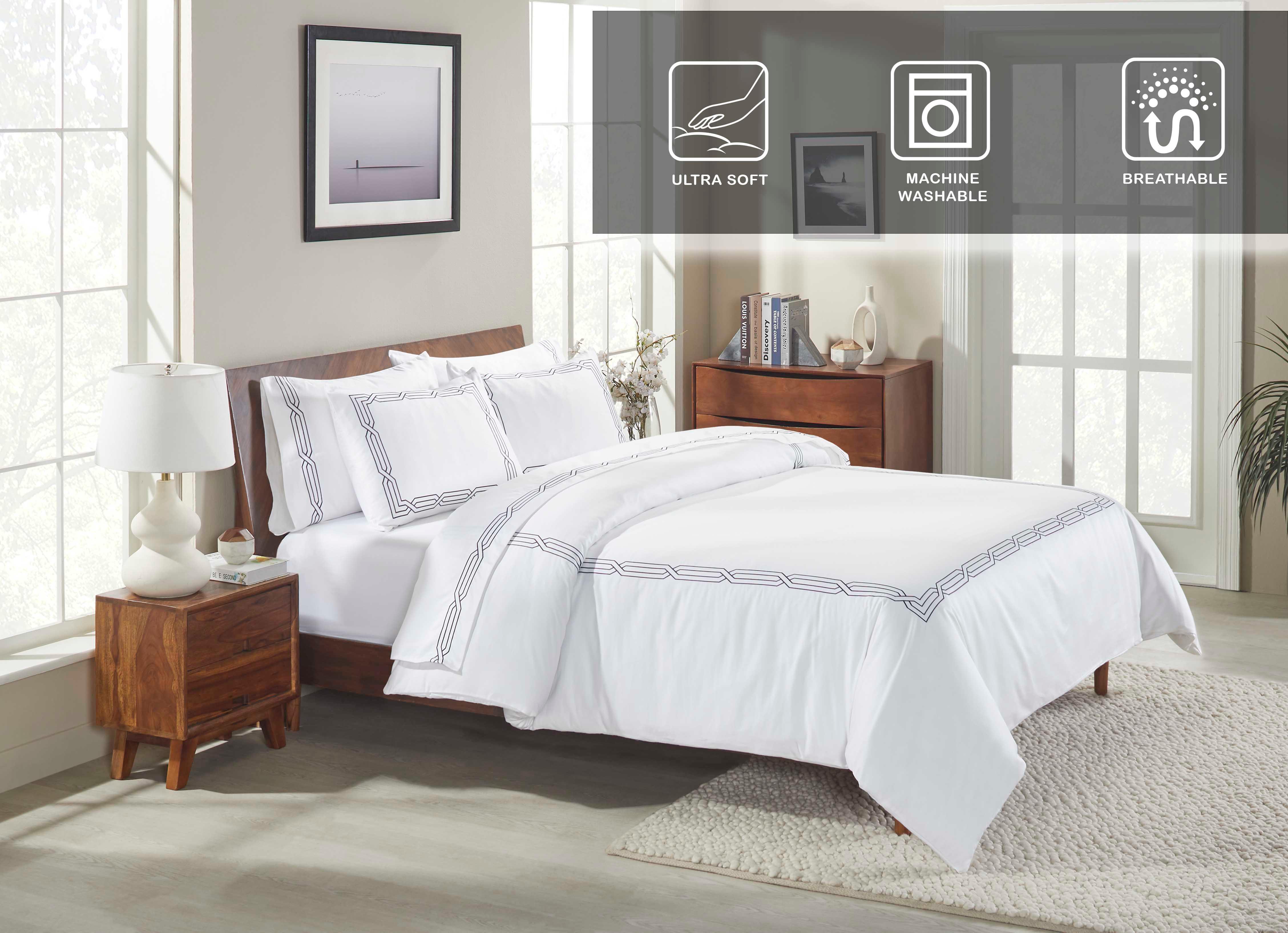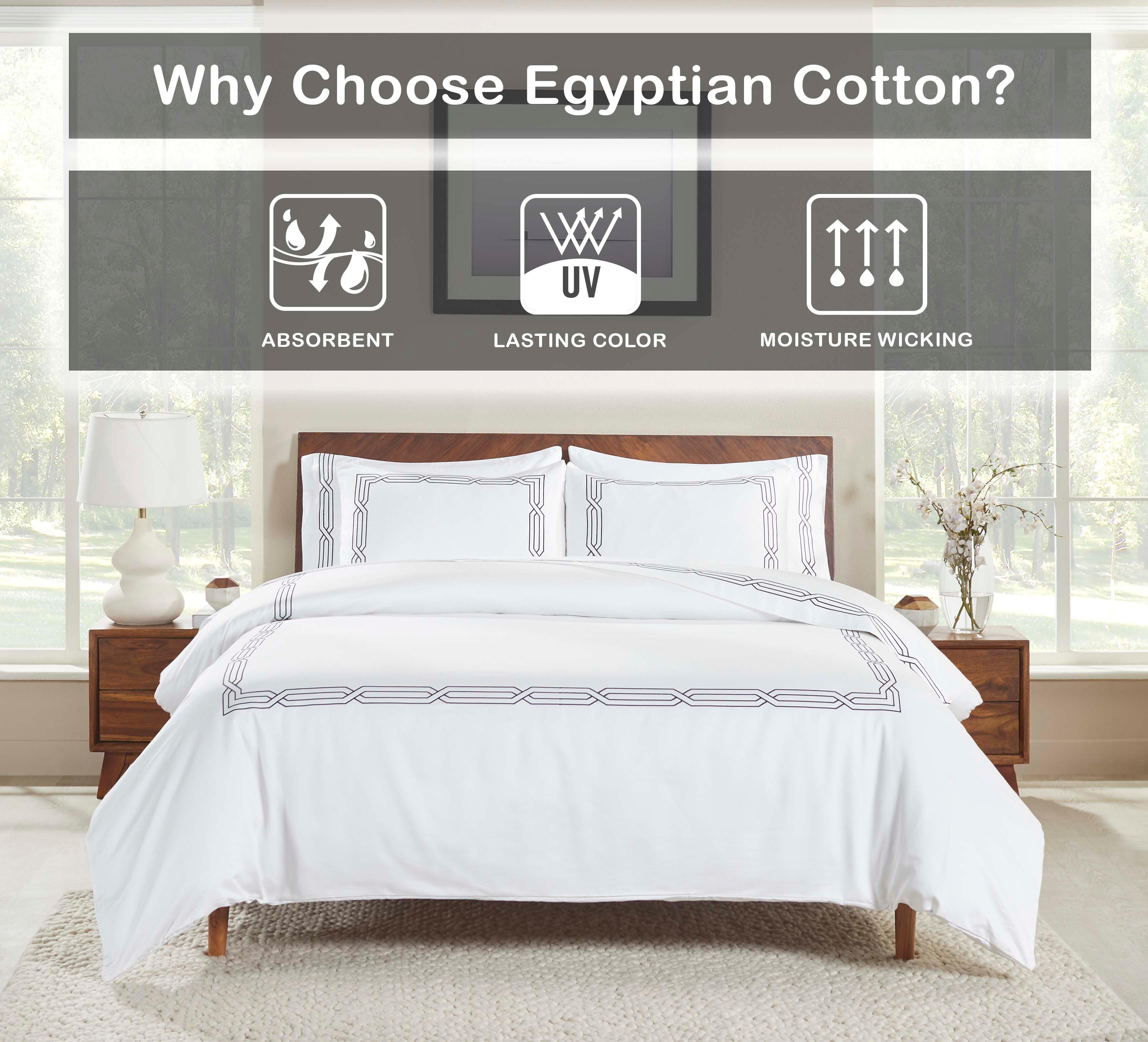 Introduce exquisite style and an elegant aura to your bedroom with the Superior Egyptian Cotton 1200 Thread Count Embroidered Geometric Scroll Duvet Cover Set. Crafted from the finest Egyptian Cotton and a plush 1200 thread count, this soft and charming set includes 1 duvet cover and 2 pillow shams. The duvet cover is designed with clear, hidden buttons and inner corner ties, and the pillow shams with envelope closure for a secure fit and a neat look. This bundle showcases stylish geometric infinity scroll embroidery in your choice of prestigious colors. The sateen weave finish lends a classy and elegant touch to your guest or master bedroom.
