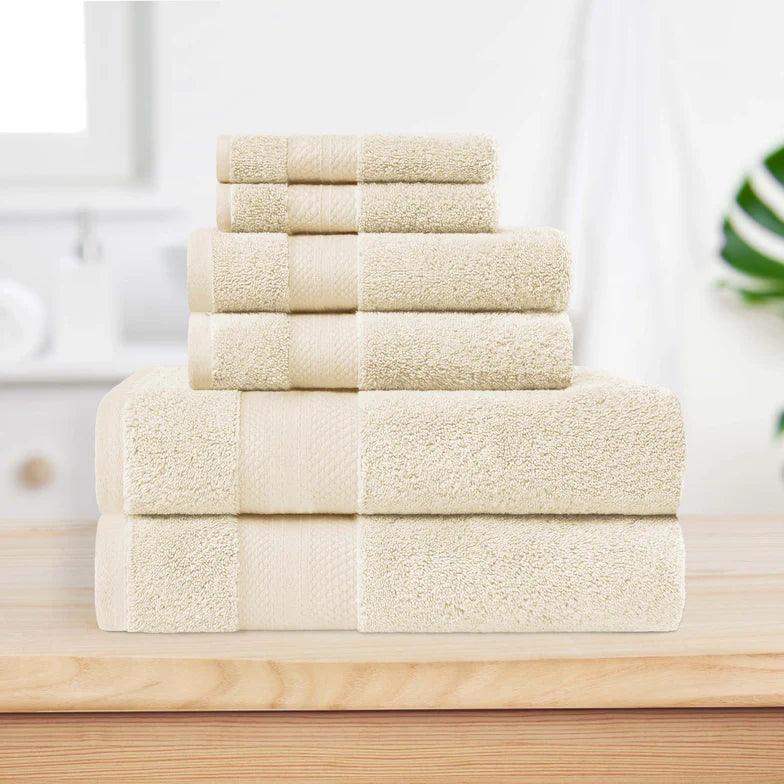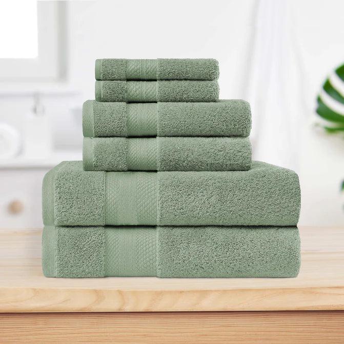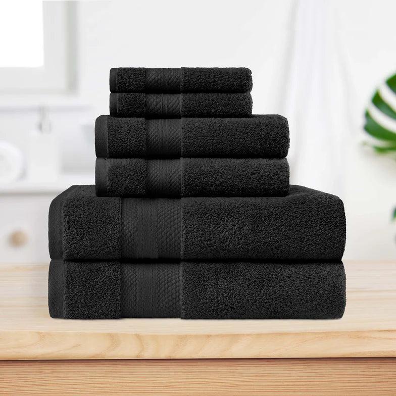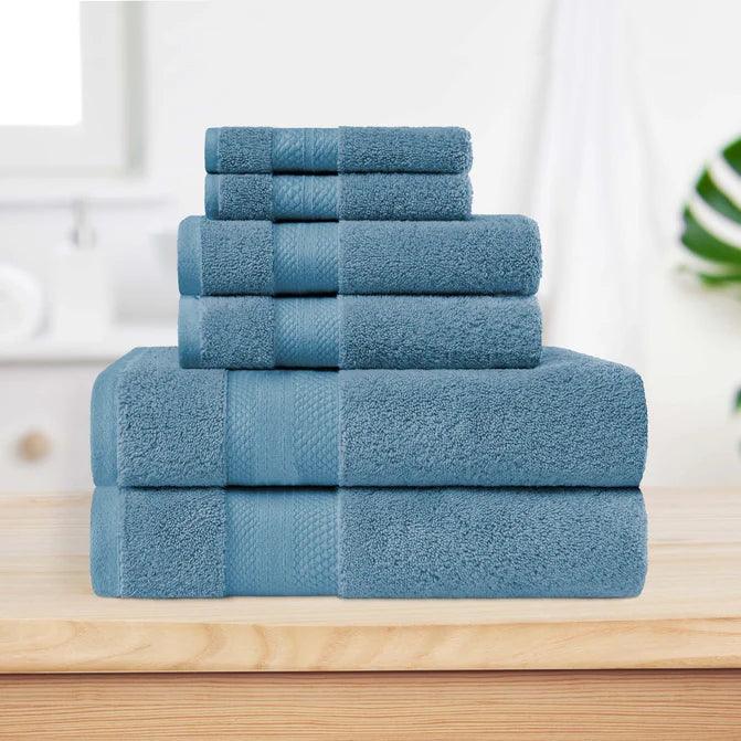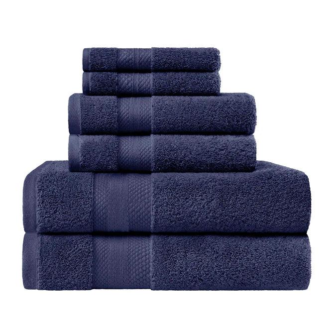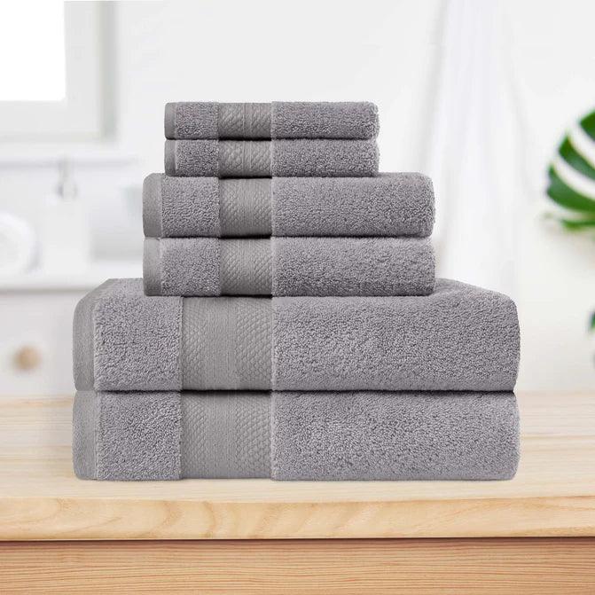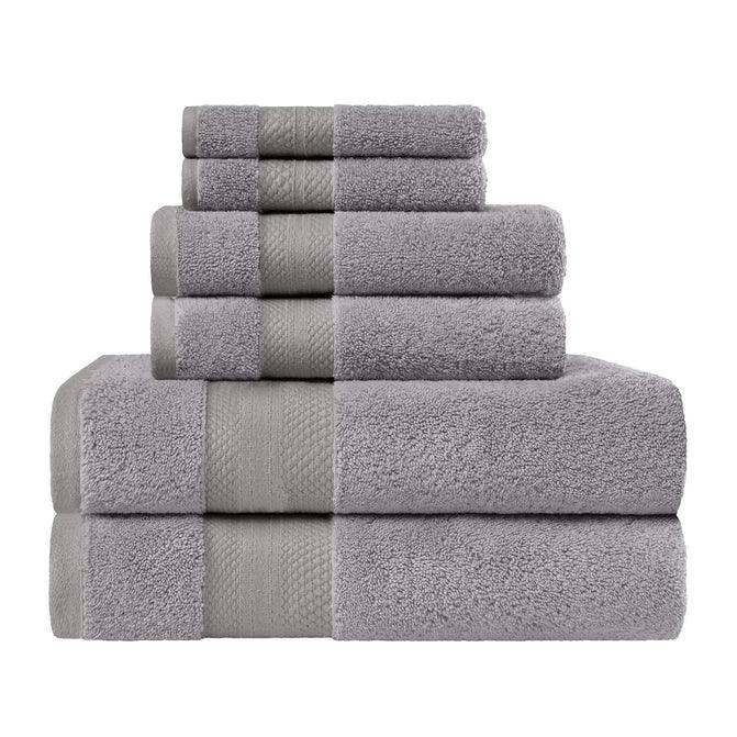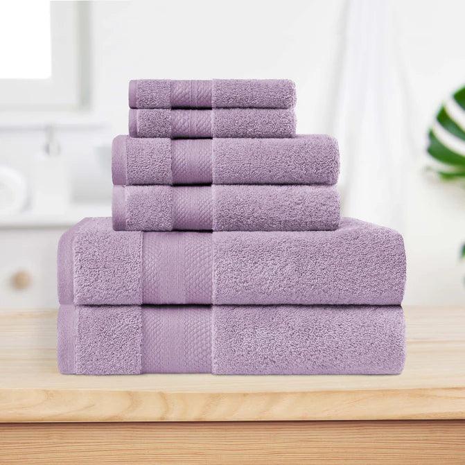 Enjoy comfort after a bath or shower with this gorgeous 6-Piece Towel Set. Expertly crafted from premium Turkish Cotton with a short 1-ply terry loop construction, these towels wick moisture from your skin quickly, getting you warm and dry fast. These towels are lightweight, breathable, plush, and ultra-absorbent. Each bundle includes 2 bath towels, 2 hand towels, and 2 face towels and is designed with a bold diamond mimosa border for added elegance and texture. The hems of these towels are firmly turned and stitched for long-lasting durability. Available in your choice of 12 lively solid colors, feel free to mix and match these towels for a fun, festive update in your master or guest bathroom.