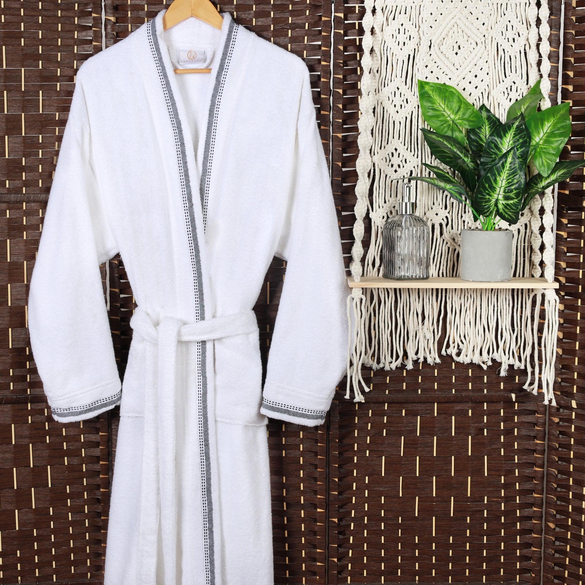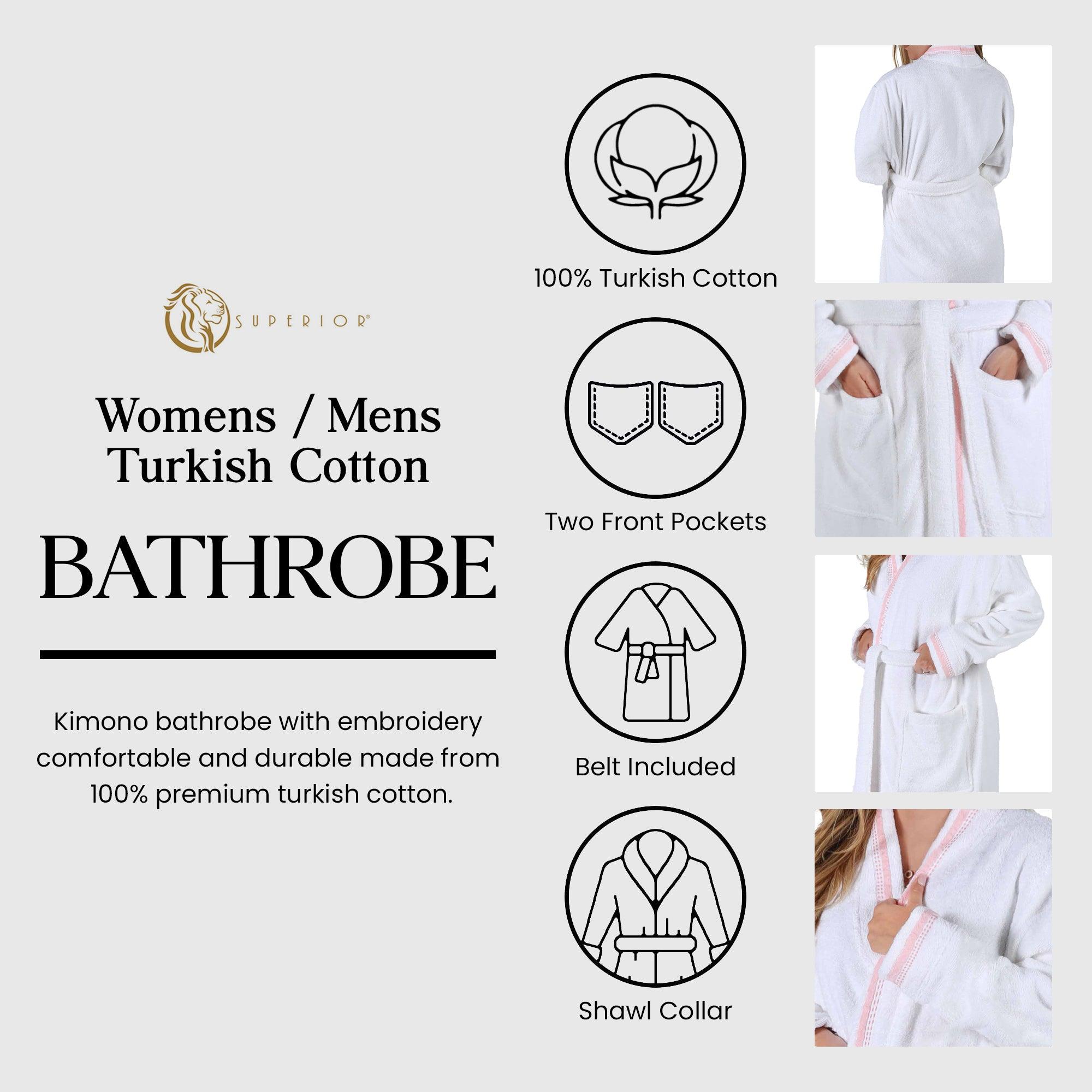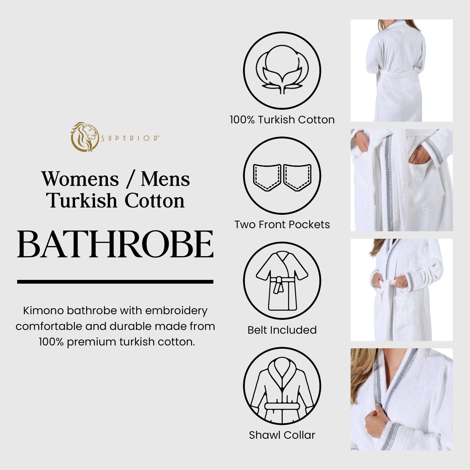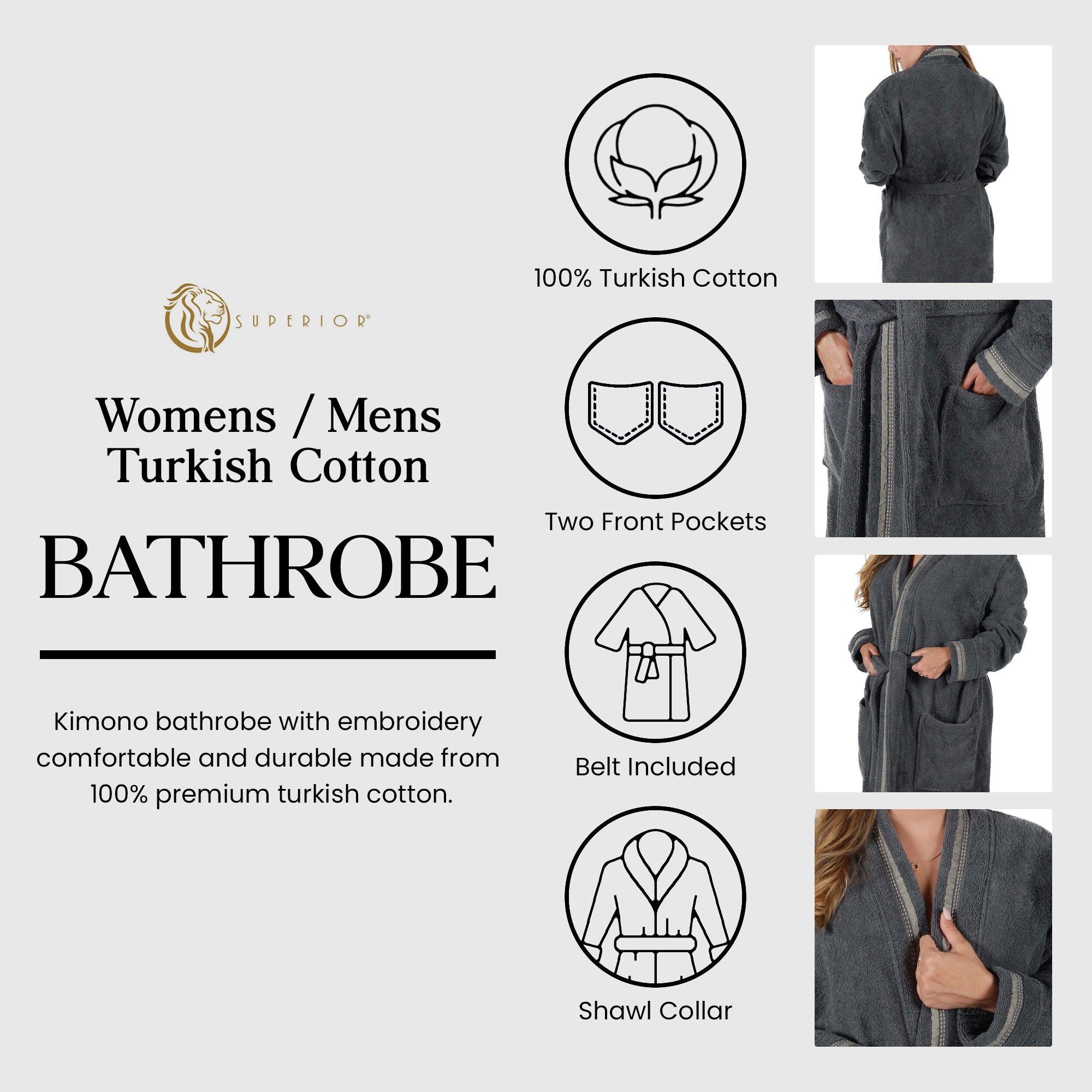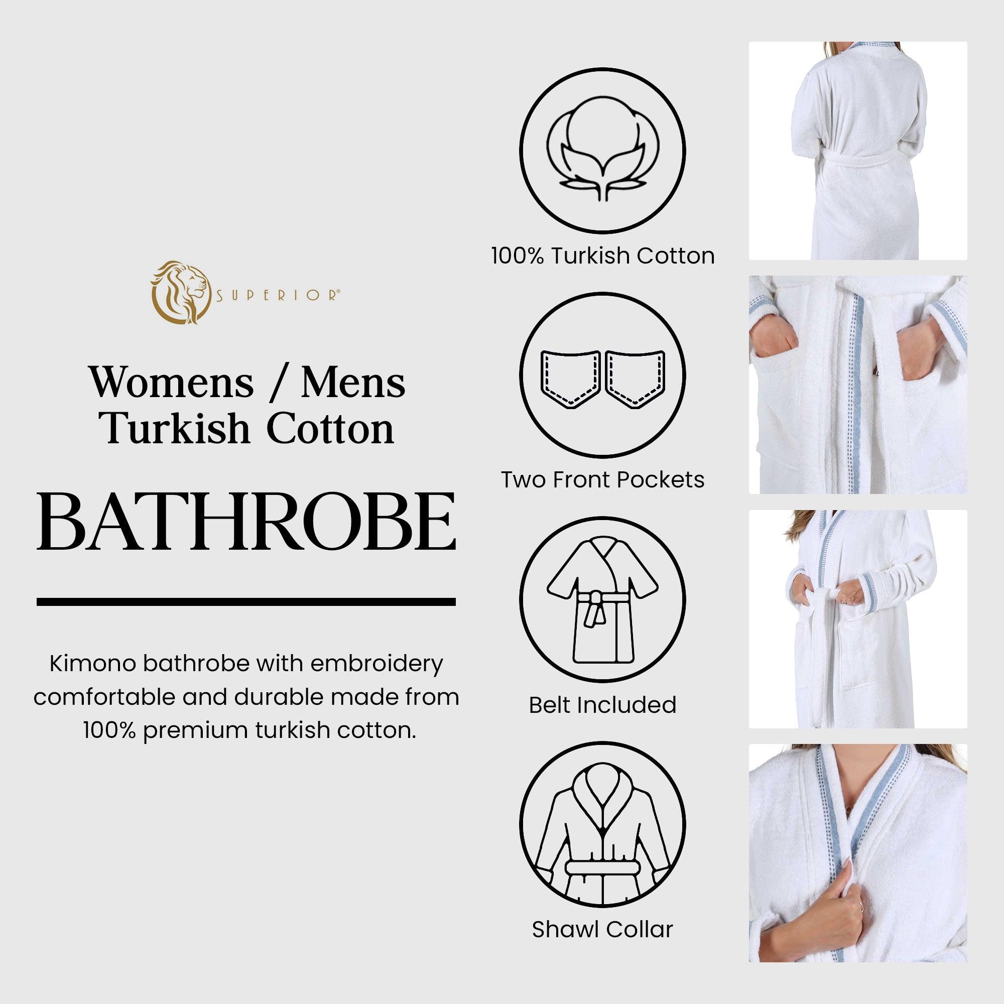 Dry yourself with the Turkish Cotton Kimono Terry Embroidered Super-Soft Unisex Bathrobe. Step out of the shower and give yourself a spa-like experience using this absorbent yet ultra-plush robe. Turkish Cotton is distinguished by its extra long and durable fibers along with the terry loop construction that this bathrobe features ensures that you will be dried gently and comfortably. This bathrobe is beautifully designed with a subtle pop of color using elegant embroidery which runs from the collar all the way down to the bottom of the front panel and along the edge of the sleeves. This bathrobe is complete with two front pockets, a V-neck collar, and a matching wrap-around belt to give you a luxurious post-bath look.