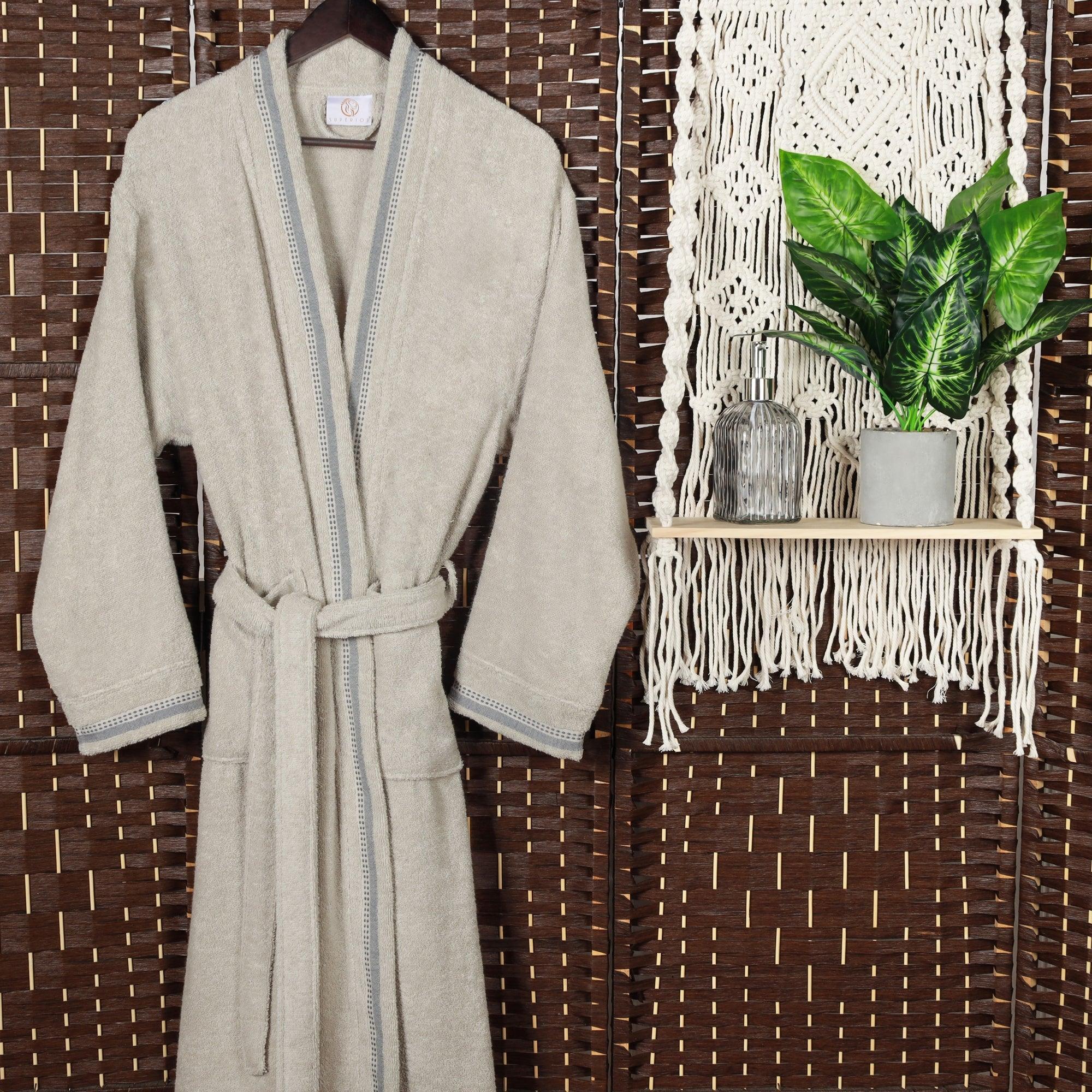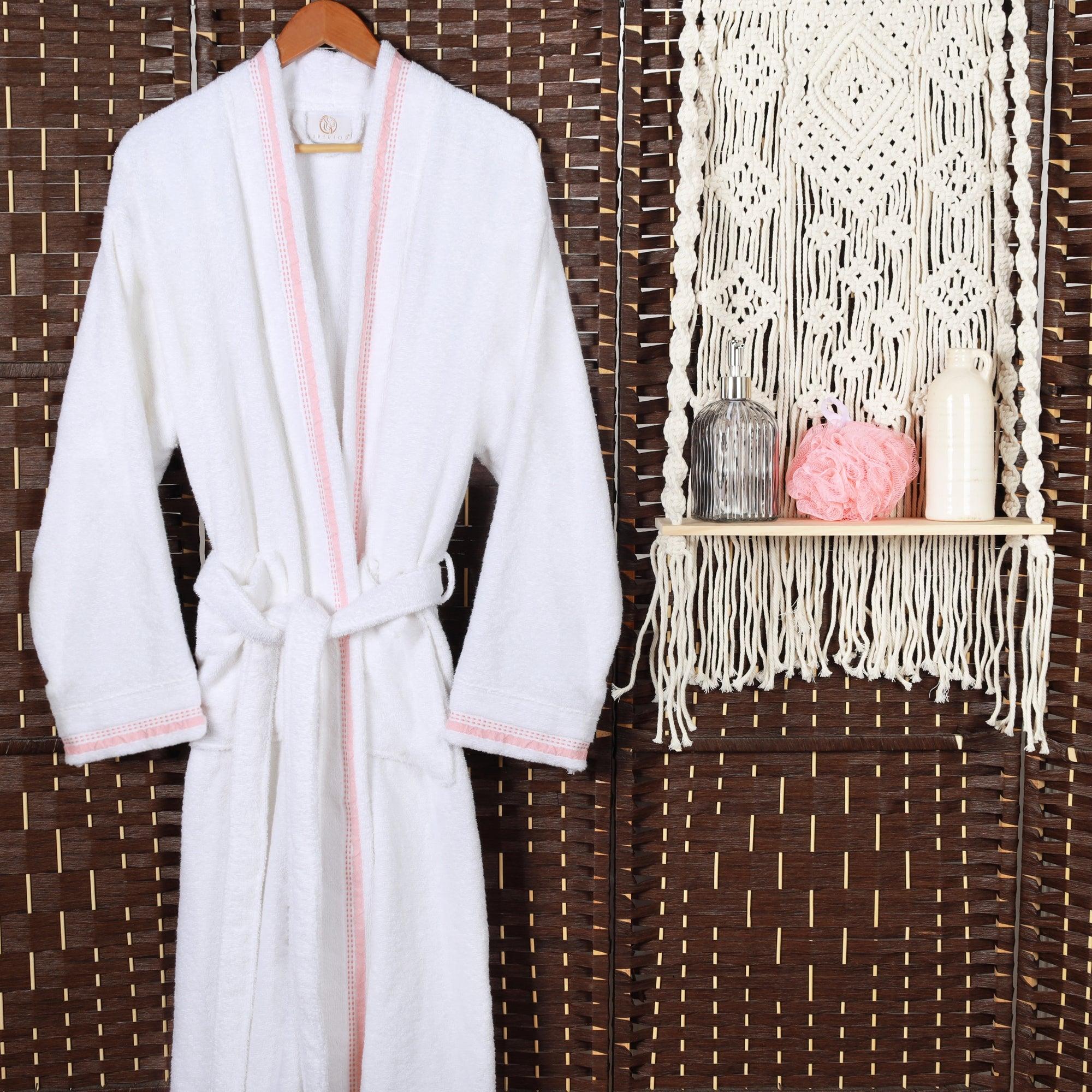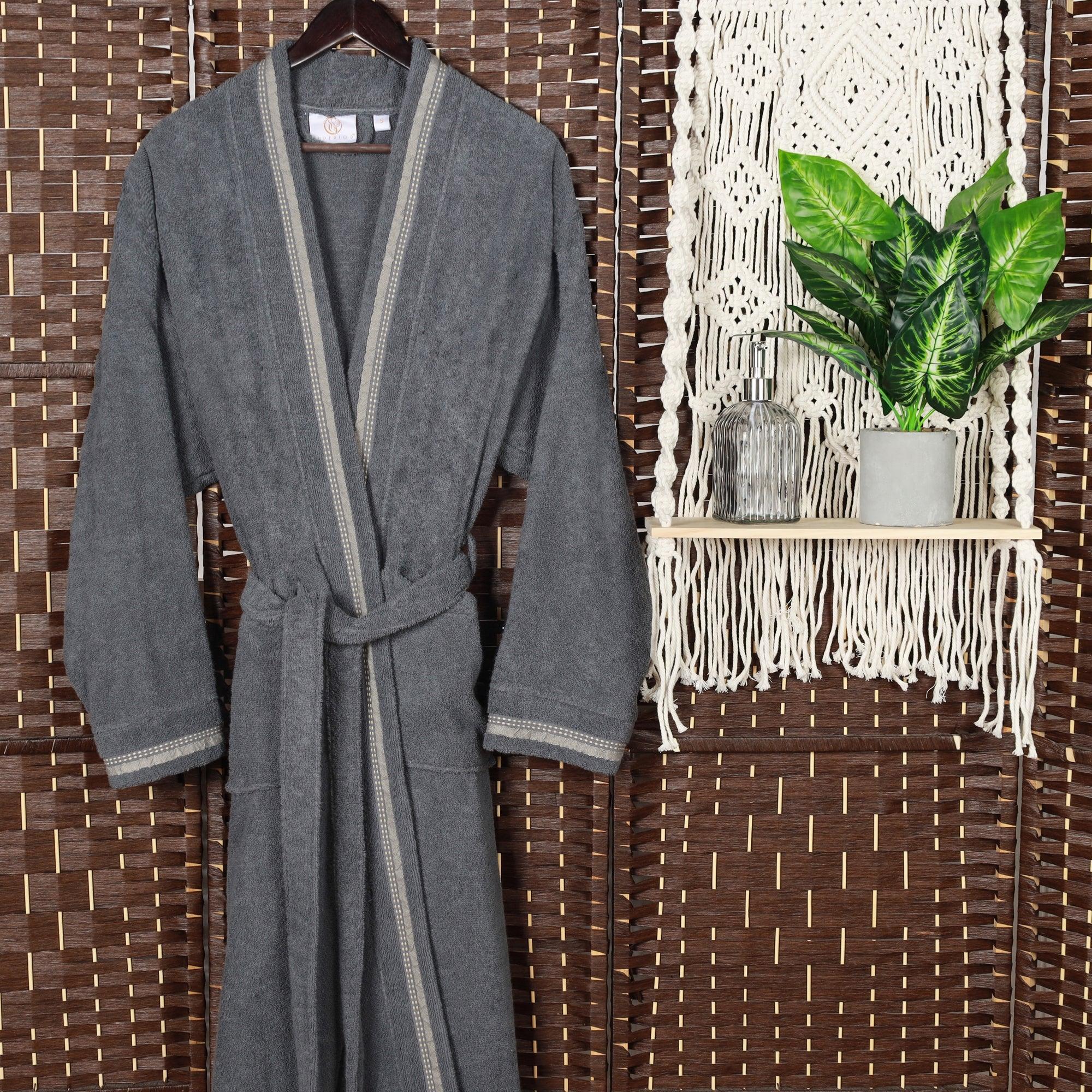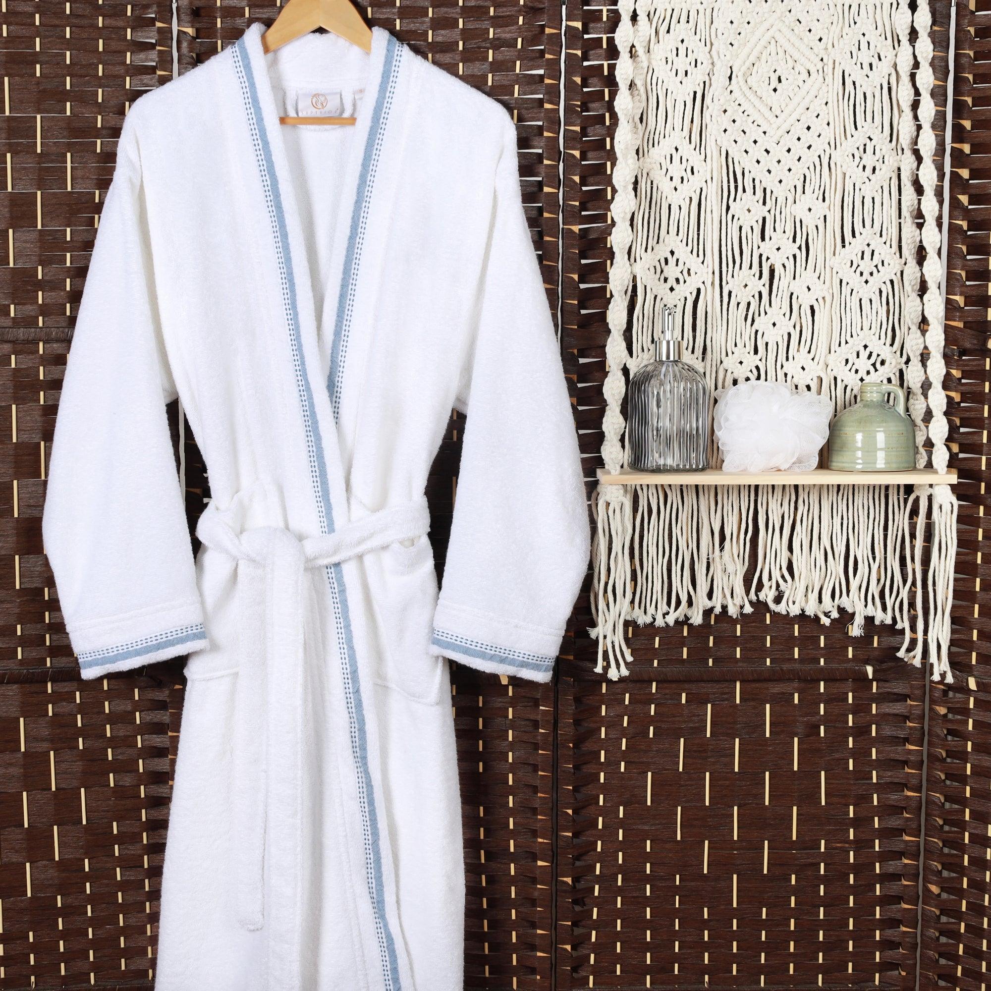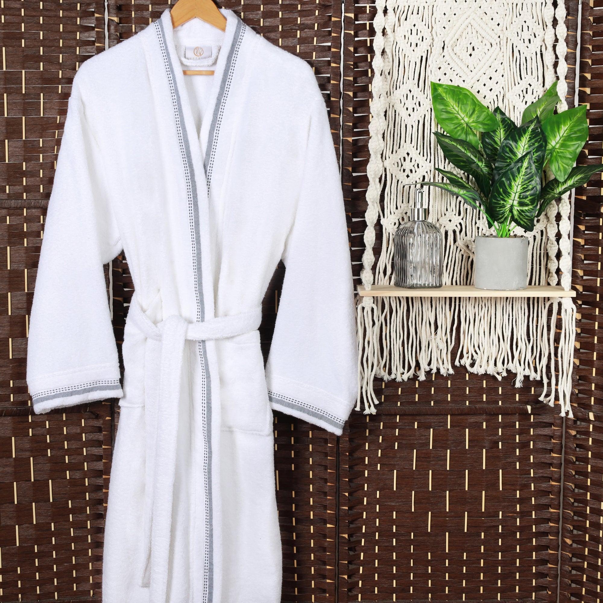 Dry yourself with the Turkish Cotton Kimono Terry Embroidered Super-Soft Unisex Bathrobe. Step out of the shower and give yourself a spa-like experience using this absorbent yet ultra-plush robe. Turkish Cotton is distinguished by its extra long and durable fibers along with the terry loop construction that this bathrobe features ensures that you will be dried gently and comfortably. This bathrobe is beautifully designed with a subtle pop of color using elegant embroidery which runs from the collar all the way down to the bottom of the front panel and along the edge of the sleeves. This bathrobe is complete with two front pockets, a V-neck collar, and a matching wrap-around belt to give you a luxurious post-bath look.