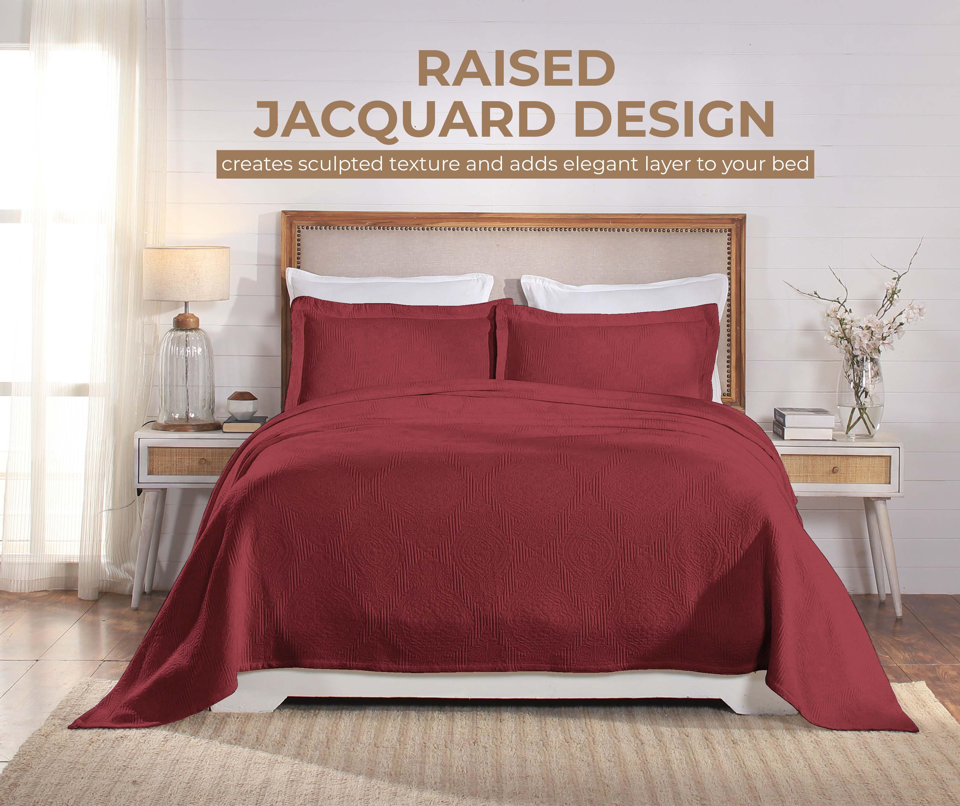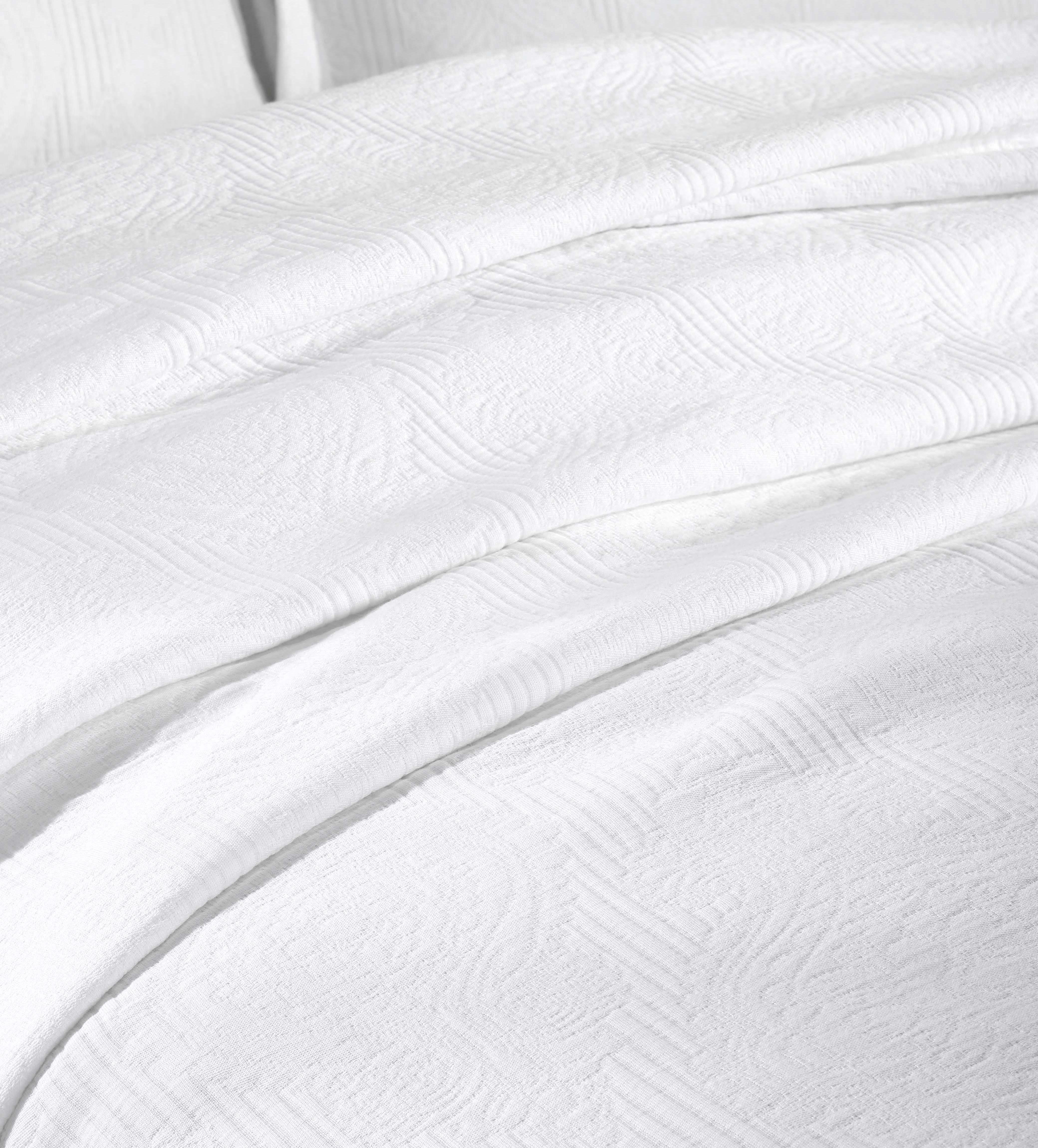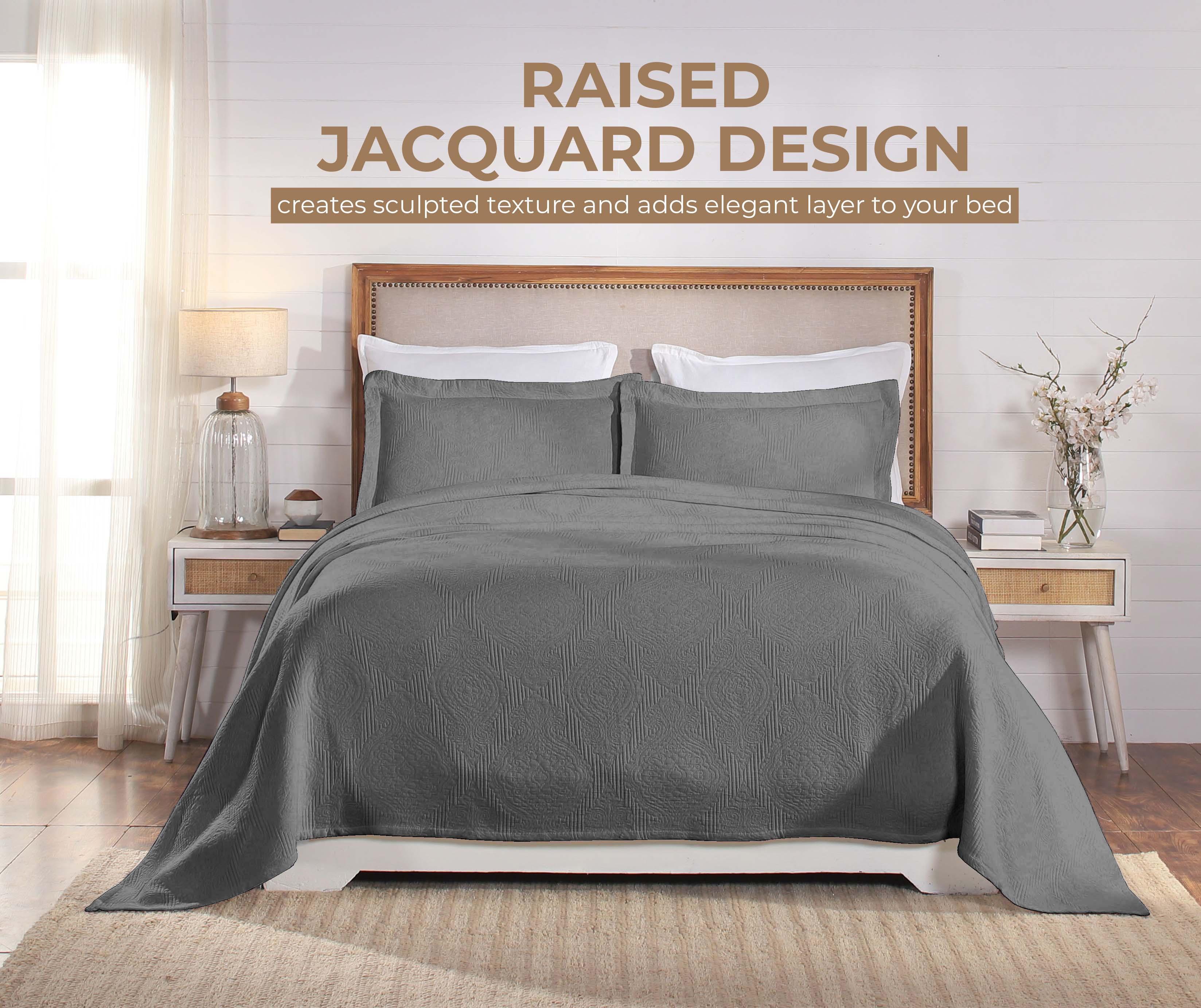 Experience the perfect blend of comfort and style with the premium Superior Victory Cotton Matelasse Bedspread and Pillow Sham Set. Crafted from 100% cotton, this light and breathable set is ideal for adding an extra layer of texture or for use on its own. The jacquard weave features an intricate scrolling medallion pattern that creates a stunning focal point in your bedroom. This gorgeous bundle includes 1 oversized bedspread that drapes elegantly to the floor, eliminating the need for a bed skirt, and 2 matching pillow shams (Twin size includes 1 pillow sham). Available in your choice of solid colors and sizes, updating the look of your modern or transitional space has never been easier.